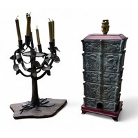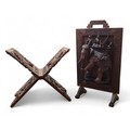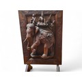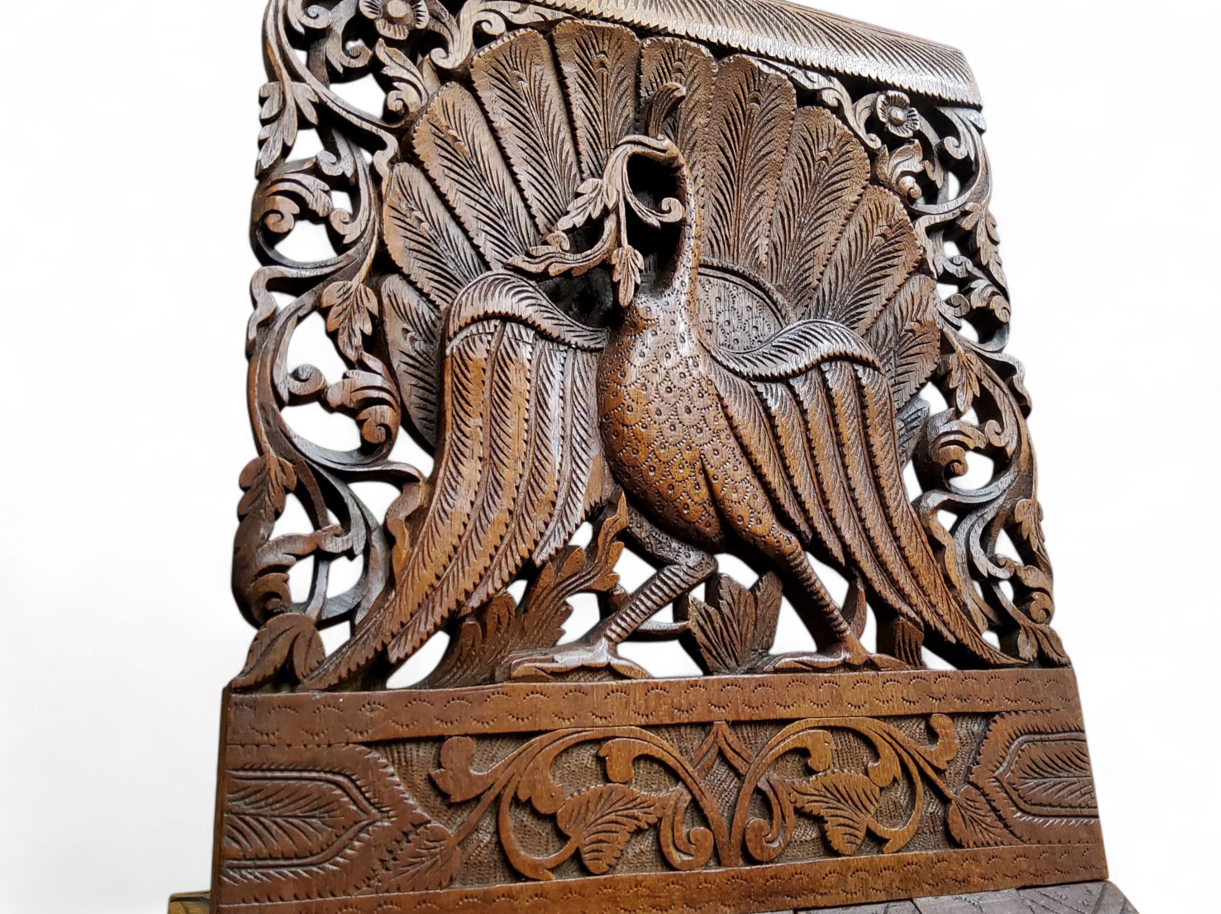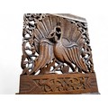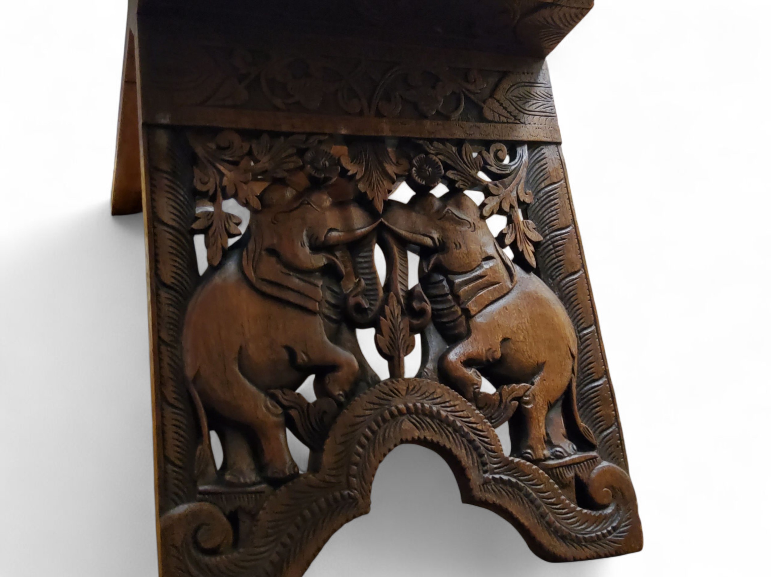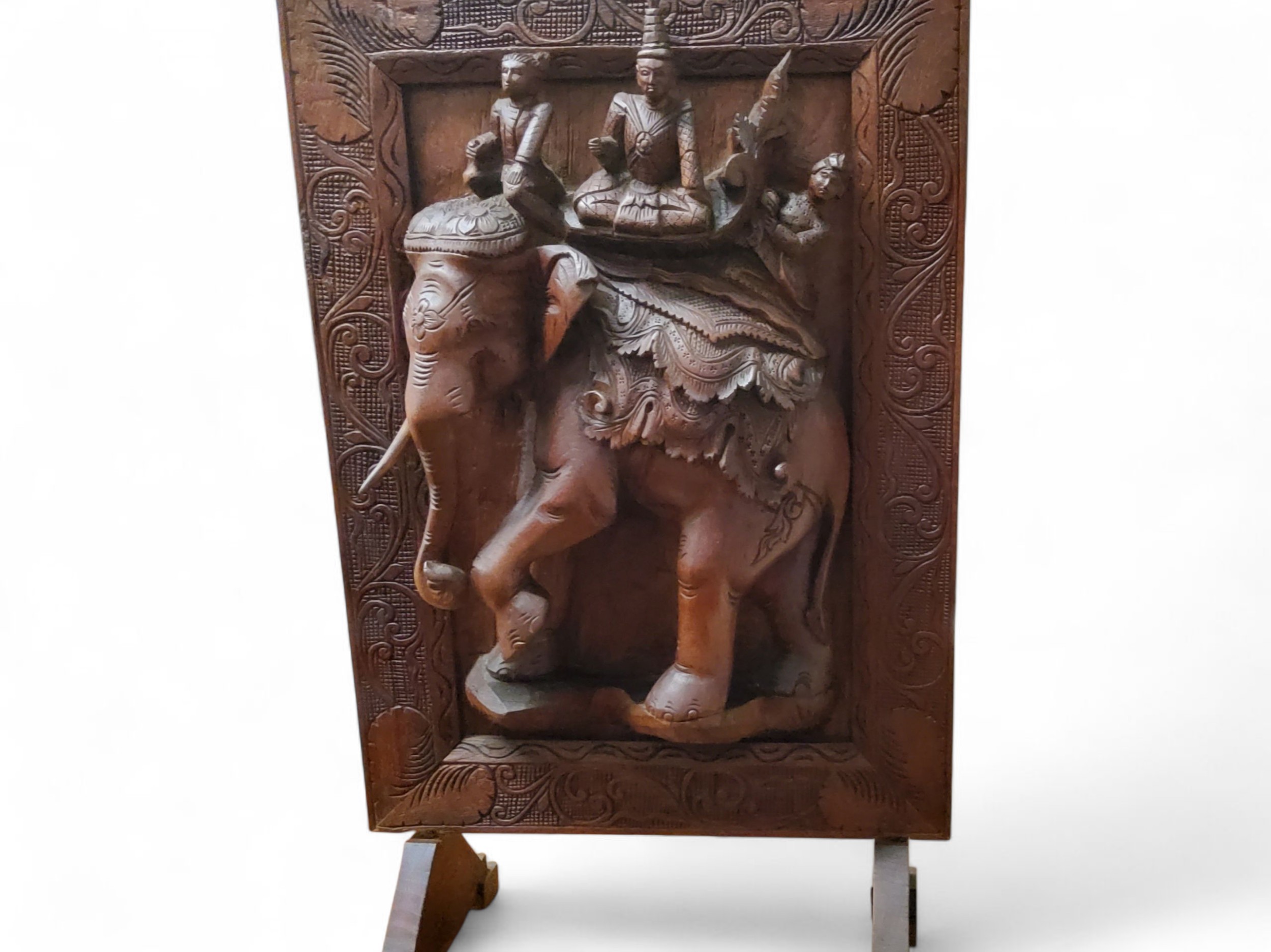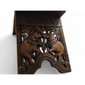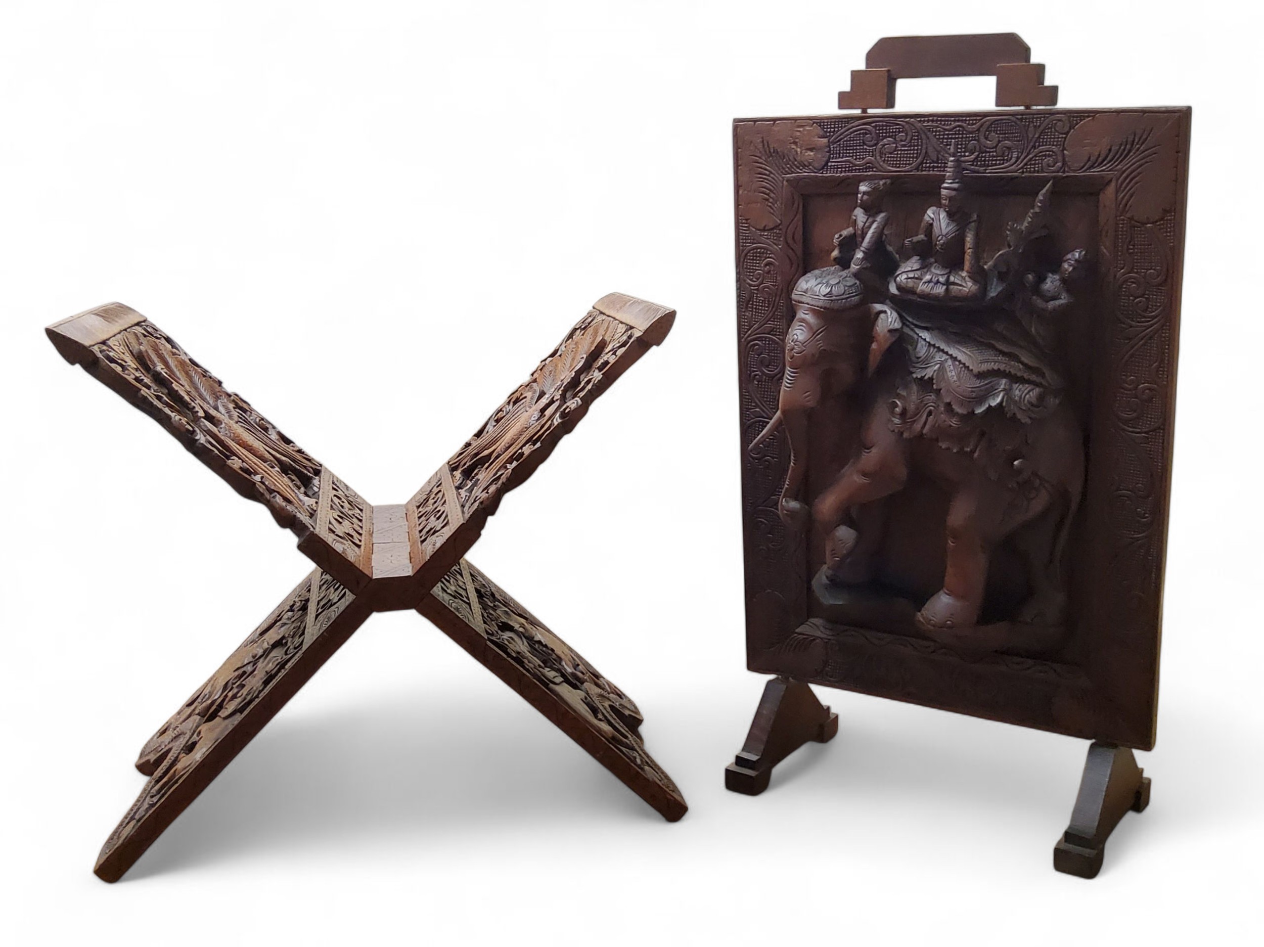 An Anglo-Indian hardwood folding Quran stand (Qur'an or Koran), carved with peacocks and elephant, 53cm high, 56cm wide; an Balinese hardwood fire guard, boldly carved with elephant and figures, 79cm high, 44cm wide (2)