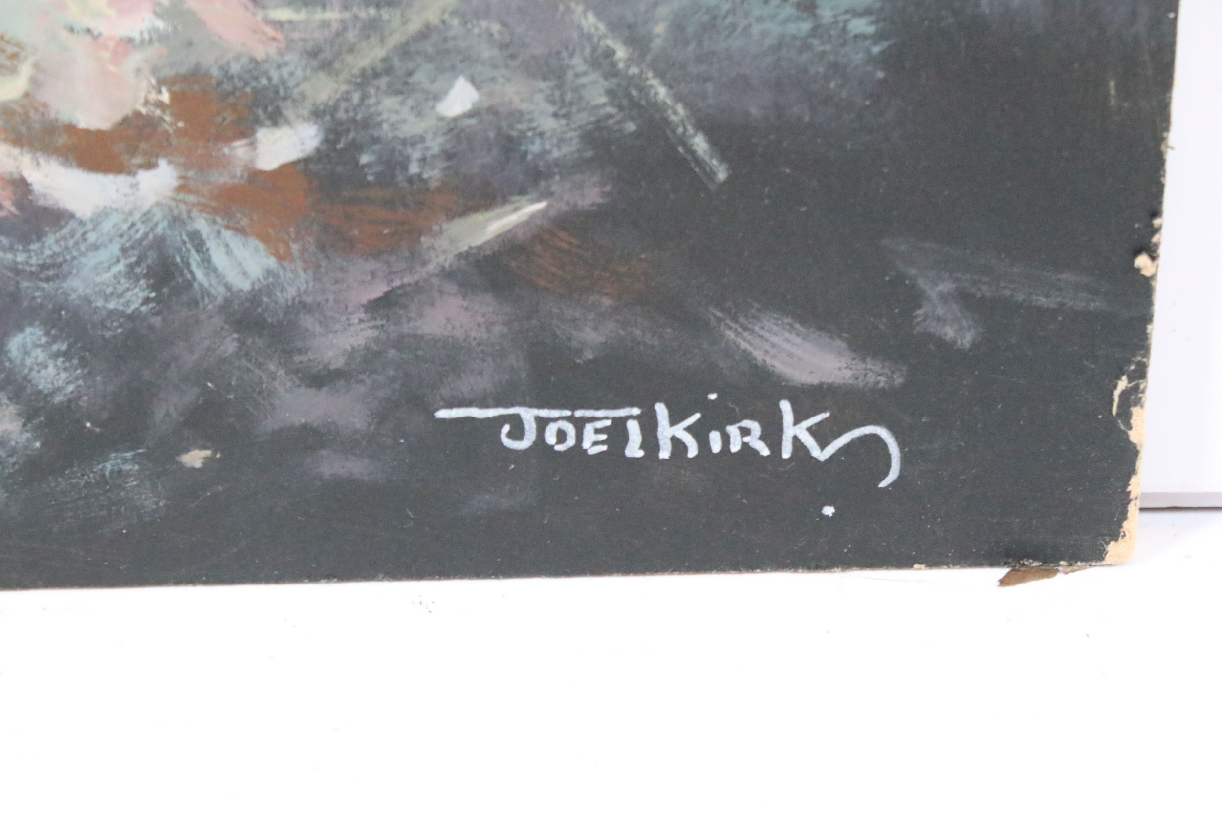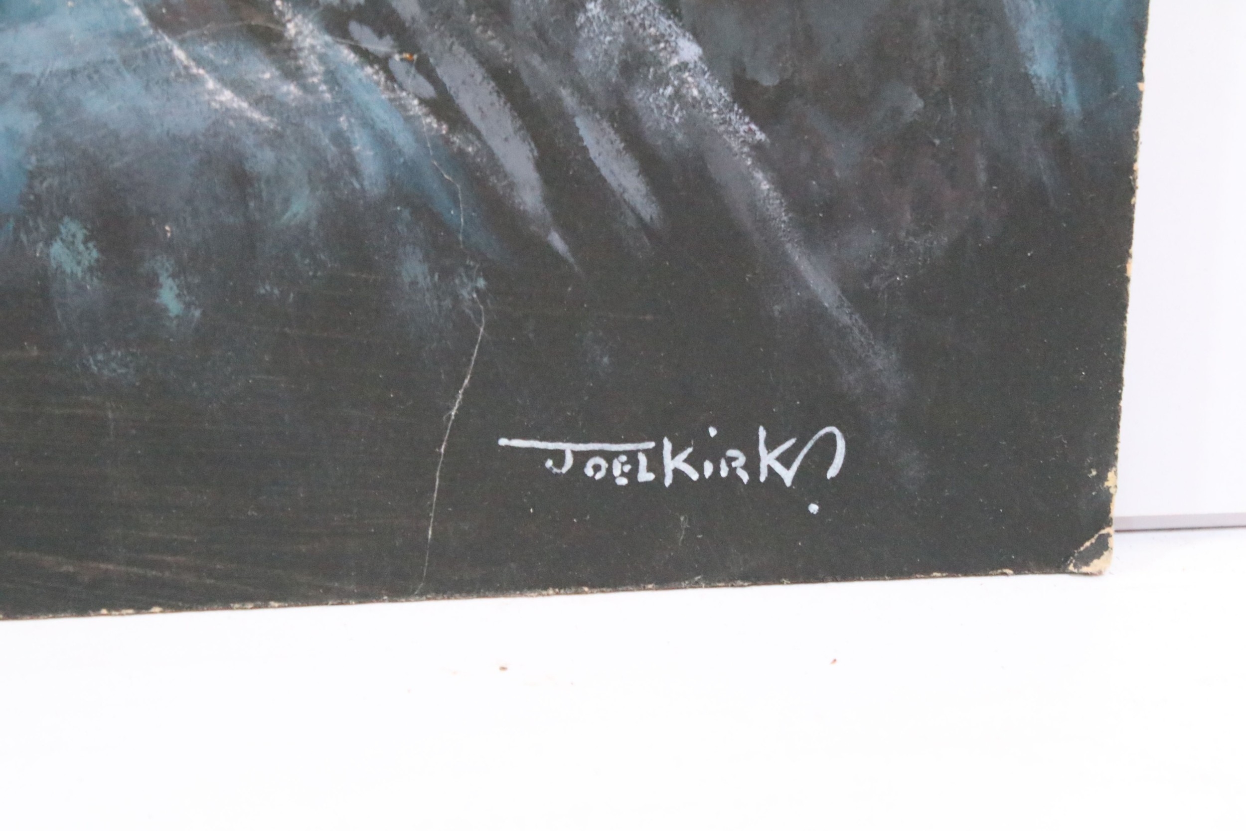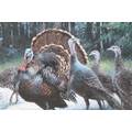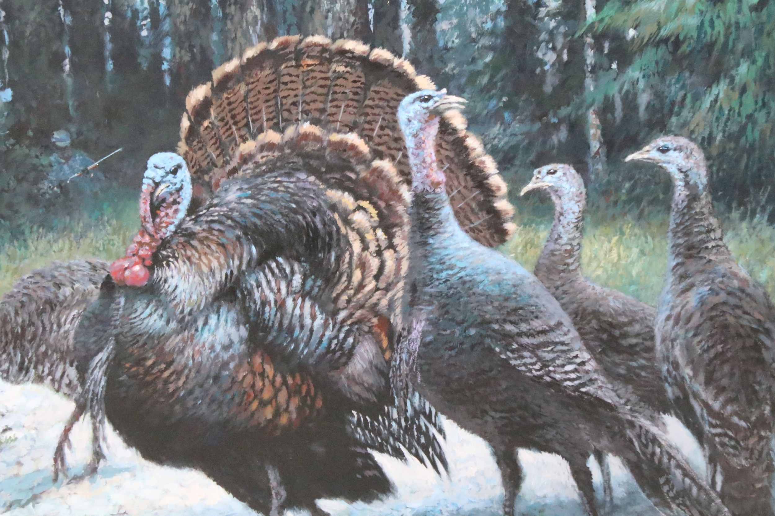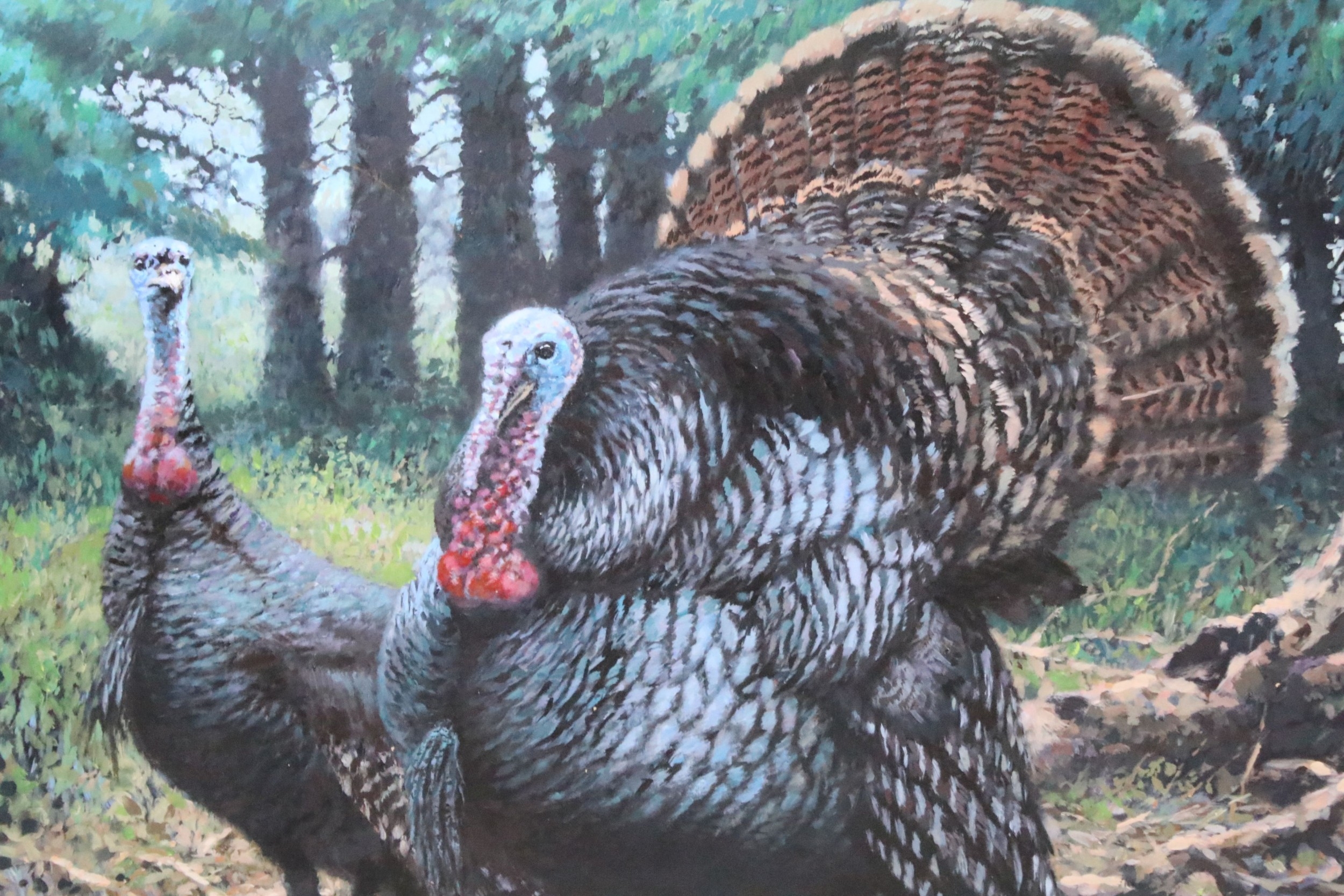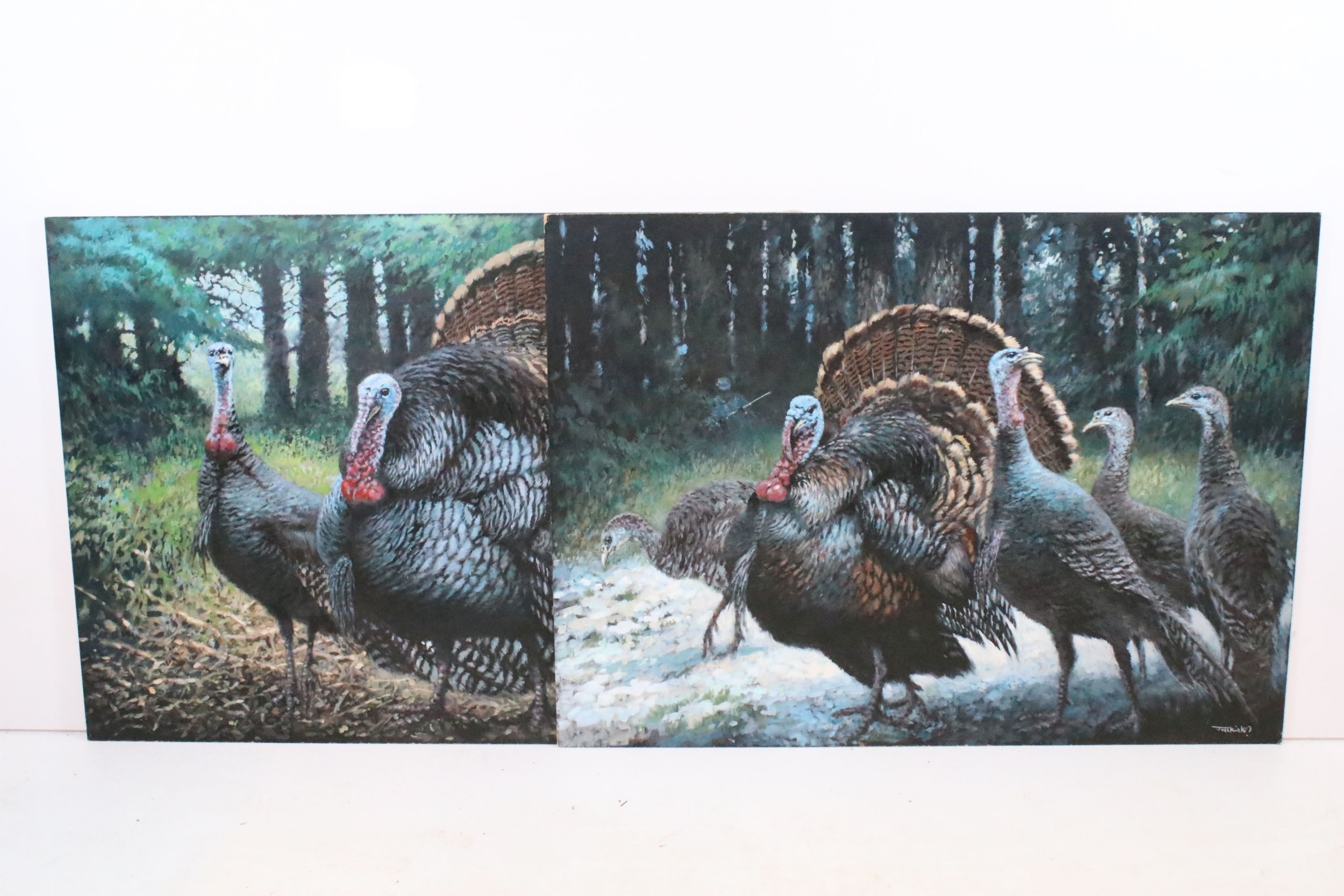 Joel Kirk (b. 1948) turkeys in a woodland setting, a pair, oil on board, signed lower right, 70cm x 95cm, unframed (2)