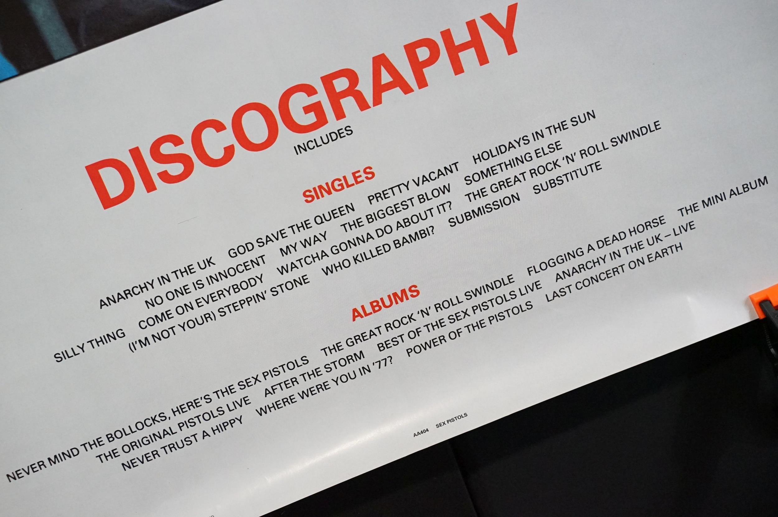Memorabilia - Sex Pistols Discography original 1989 promo poster. 24" X 35” (61cm x 89cm). in EX condition (rolled)