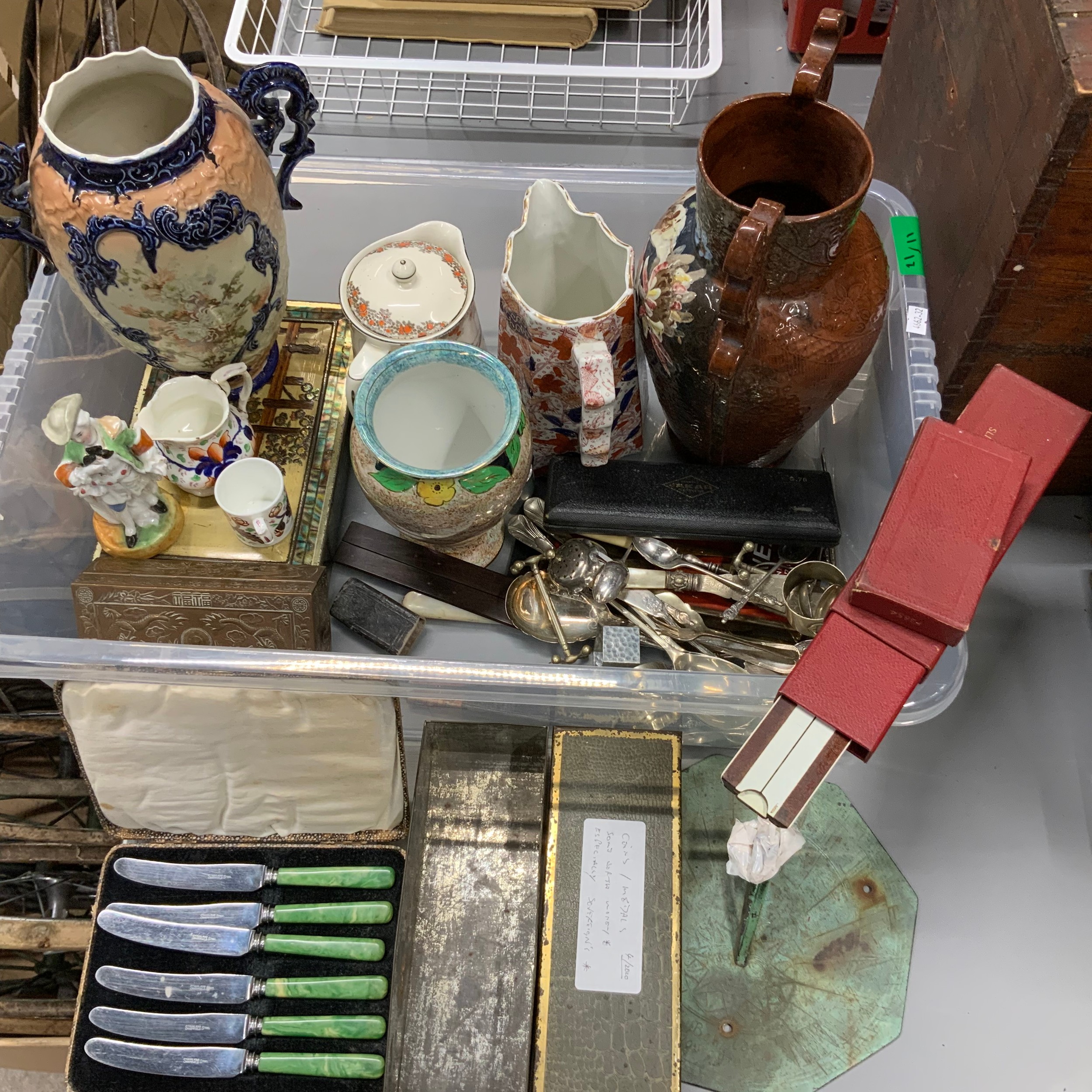 A collection of ceramics and other items, including silver-plated cutlery, a handled vase, a metal sundial and other items.