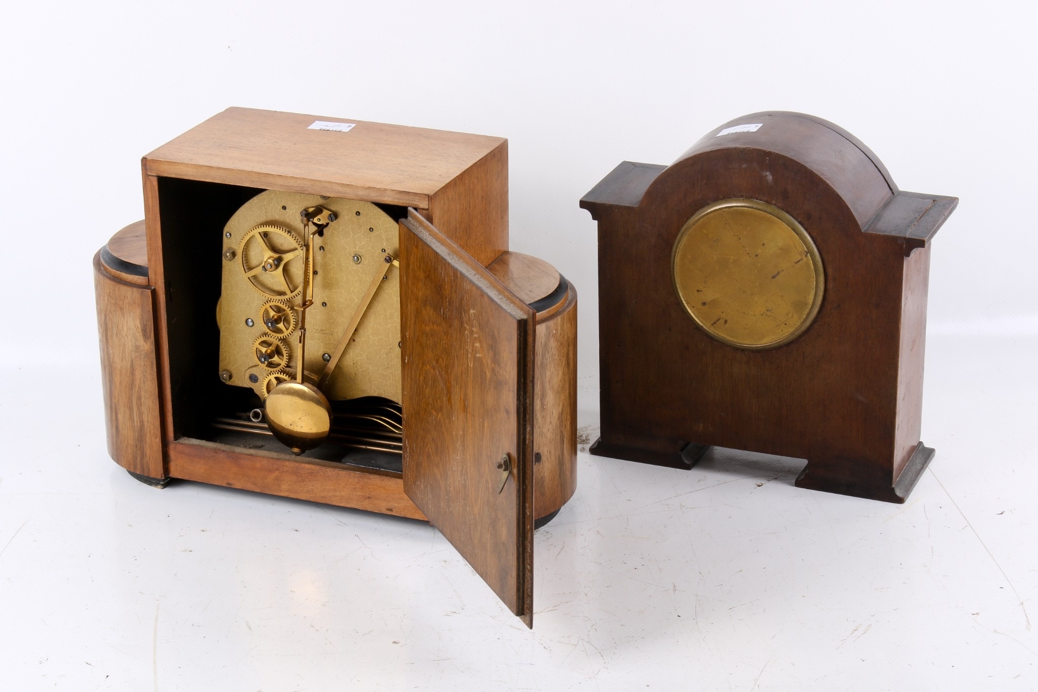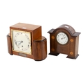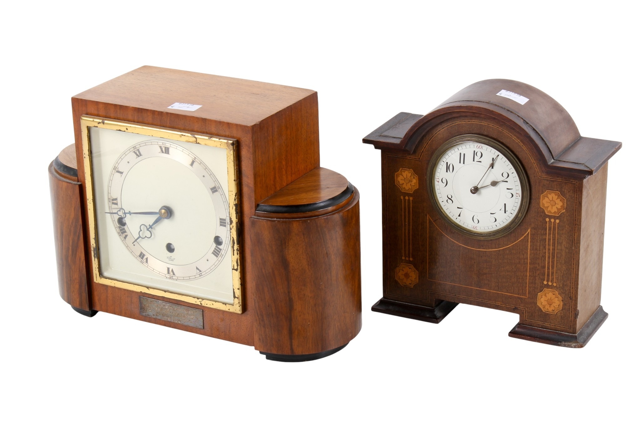 Two 20th century mantel clocks. Comprising an Art Deco walnut veneered cased Elliott chiming clock and an Edwardian inlaid mahogany mantel clock. Max. H22cm