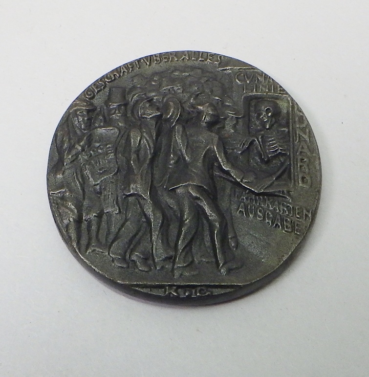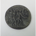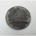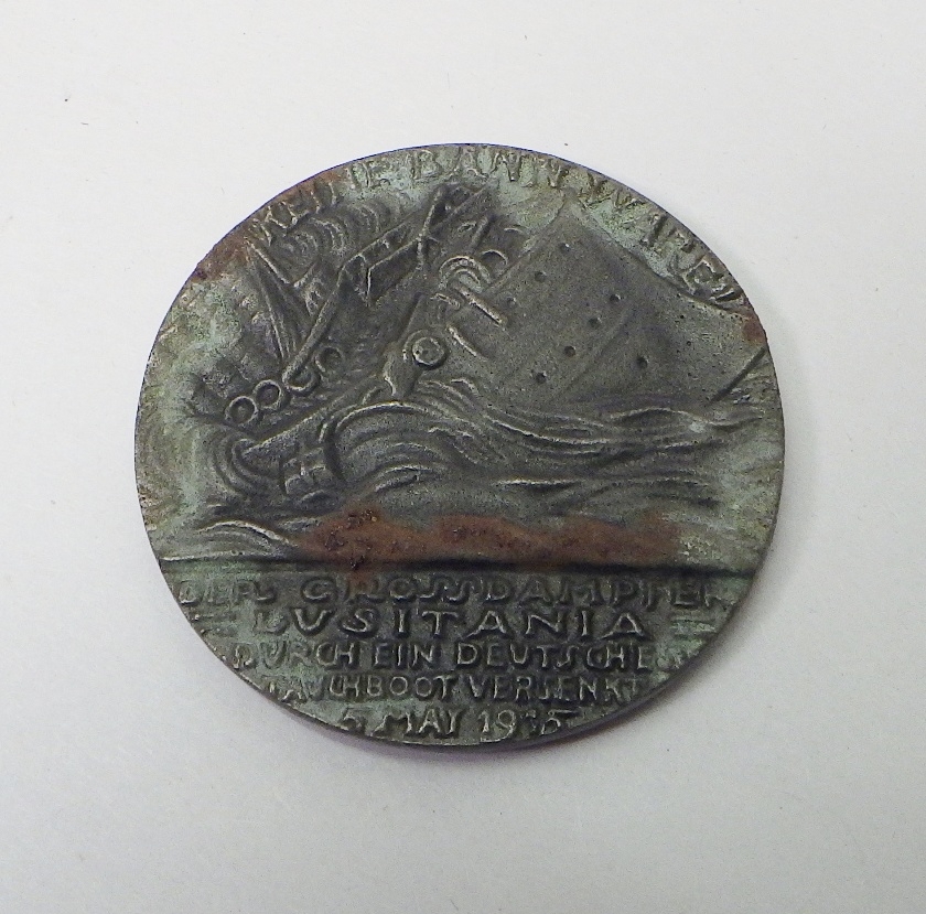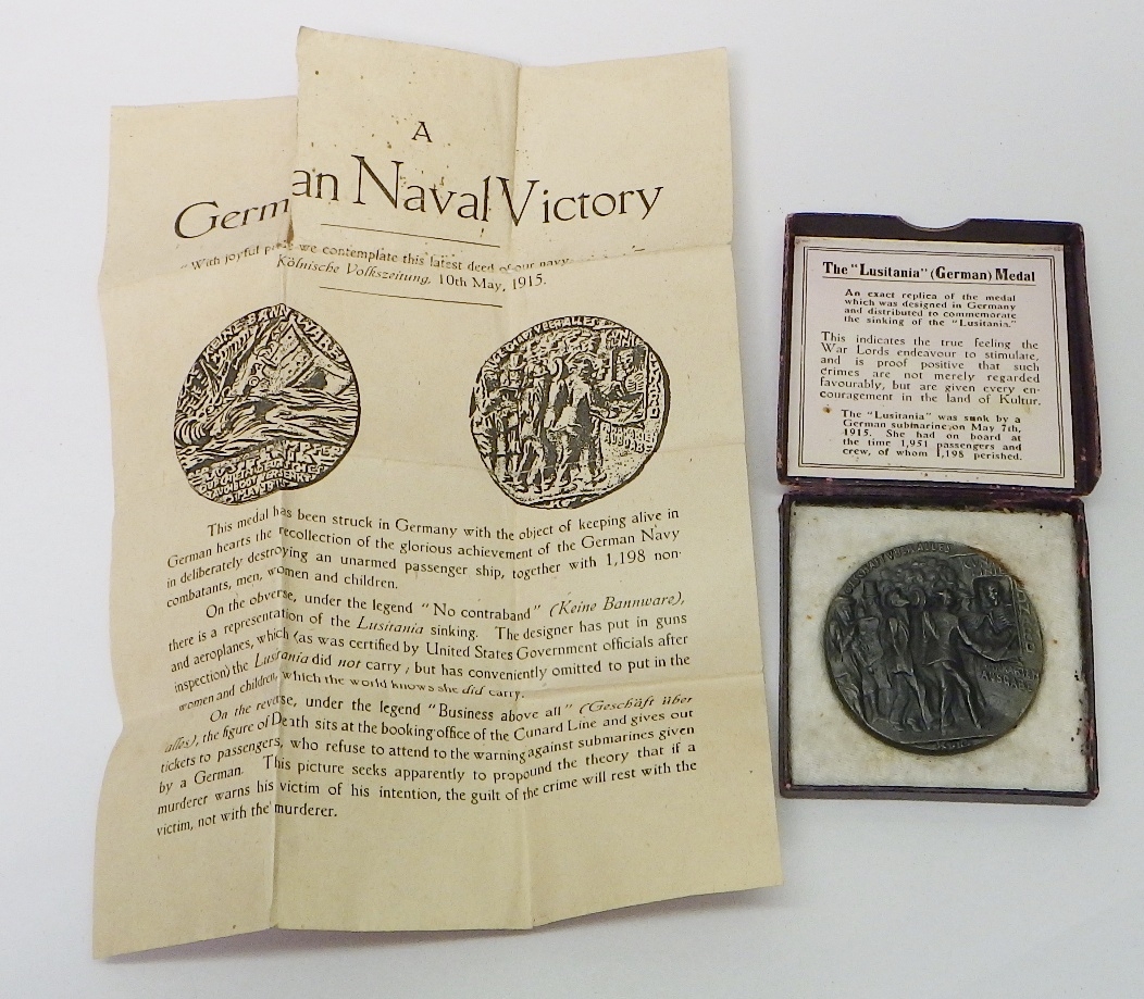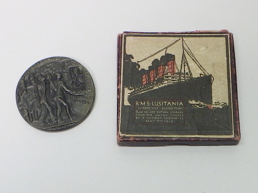 A WW1 Lusitania Medal propaganda plaque, boxed with paper slip.