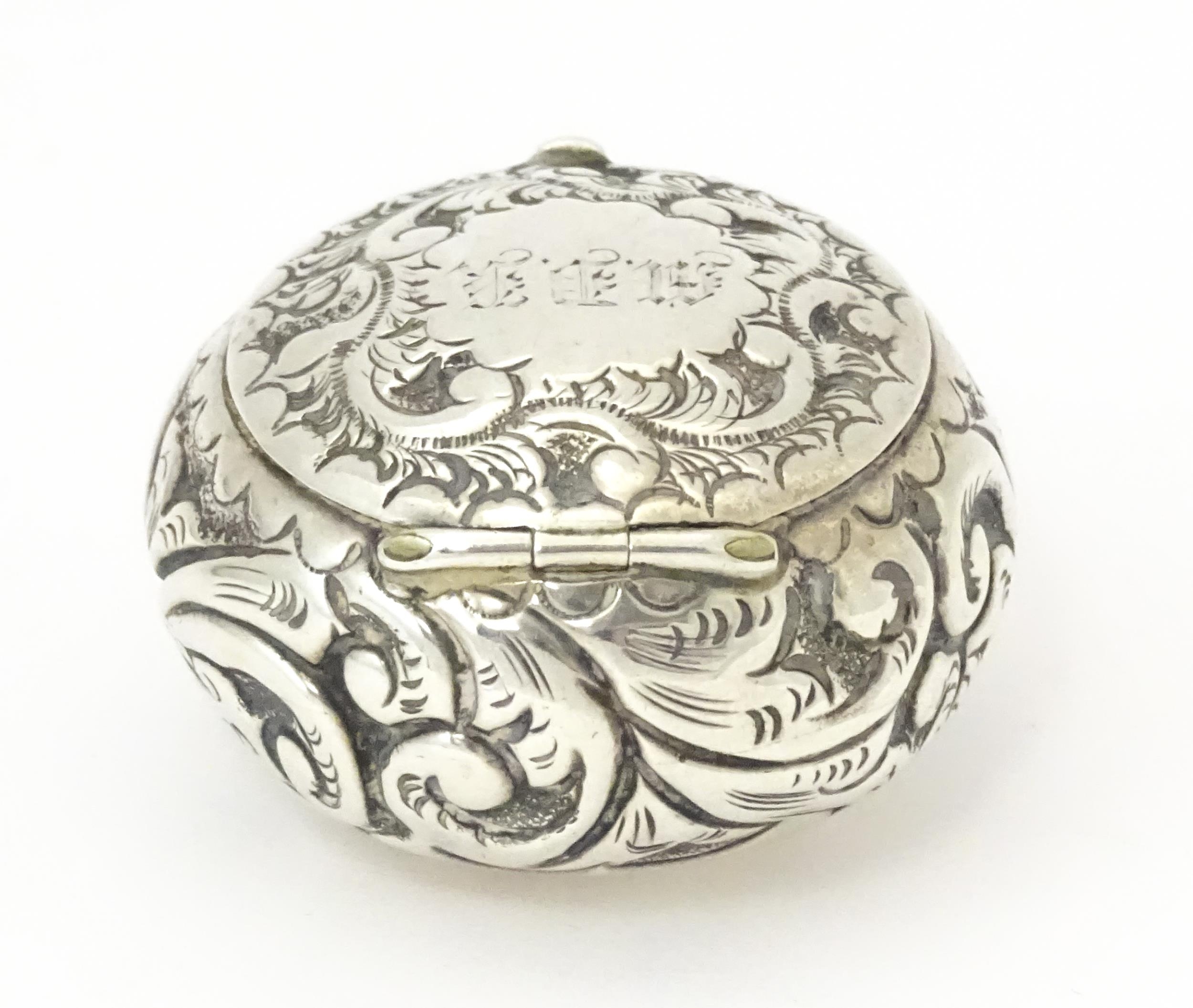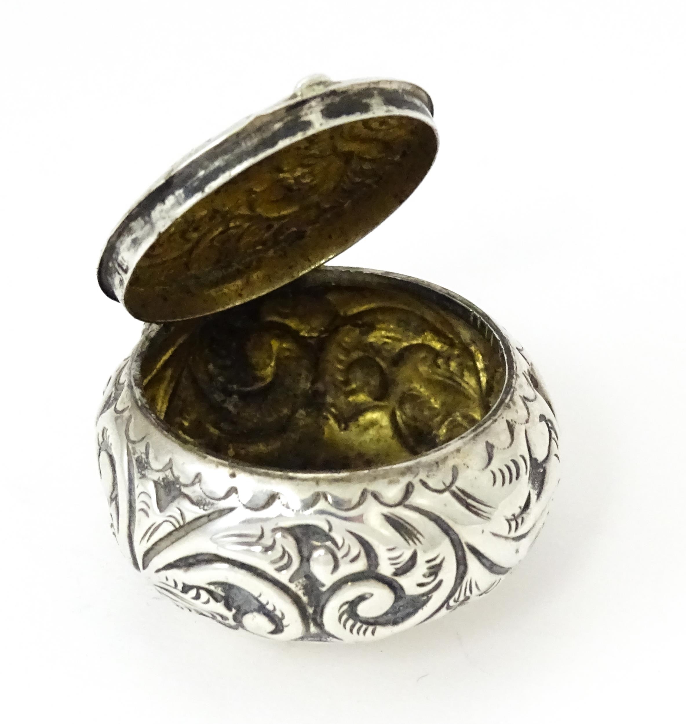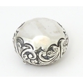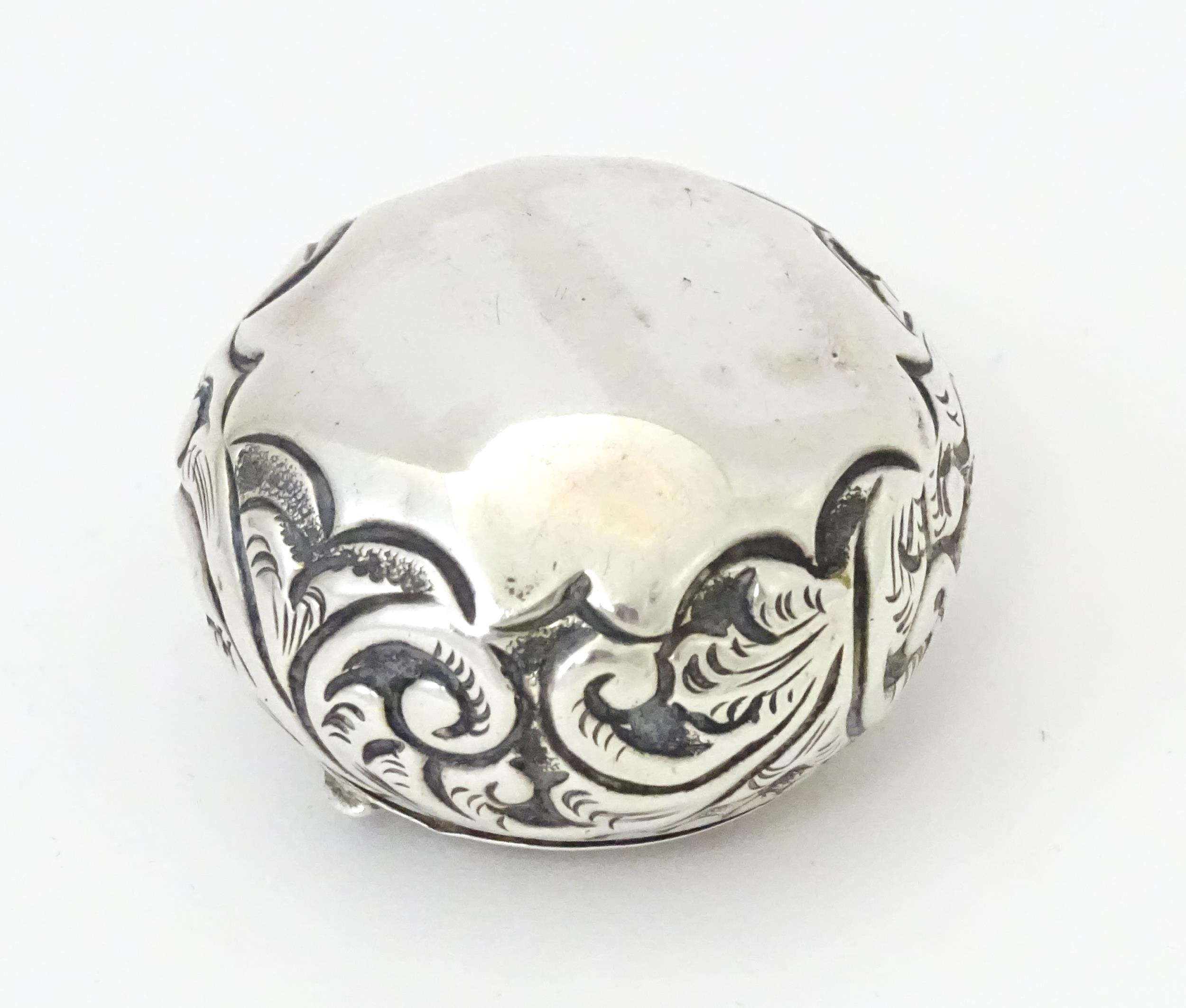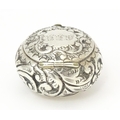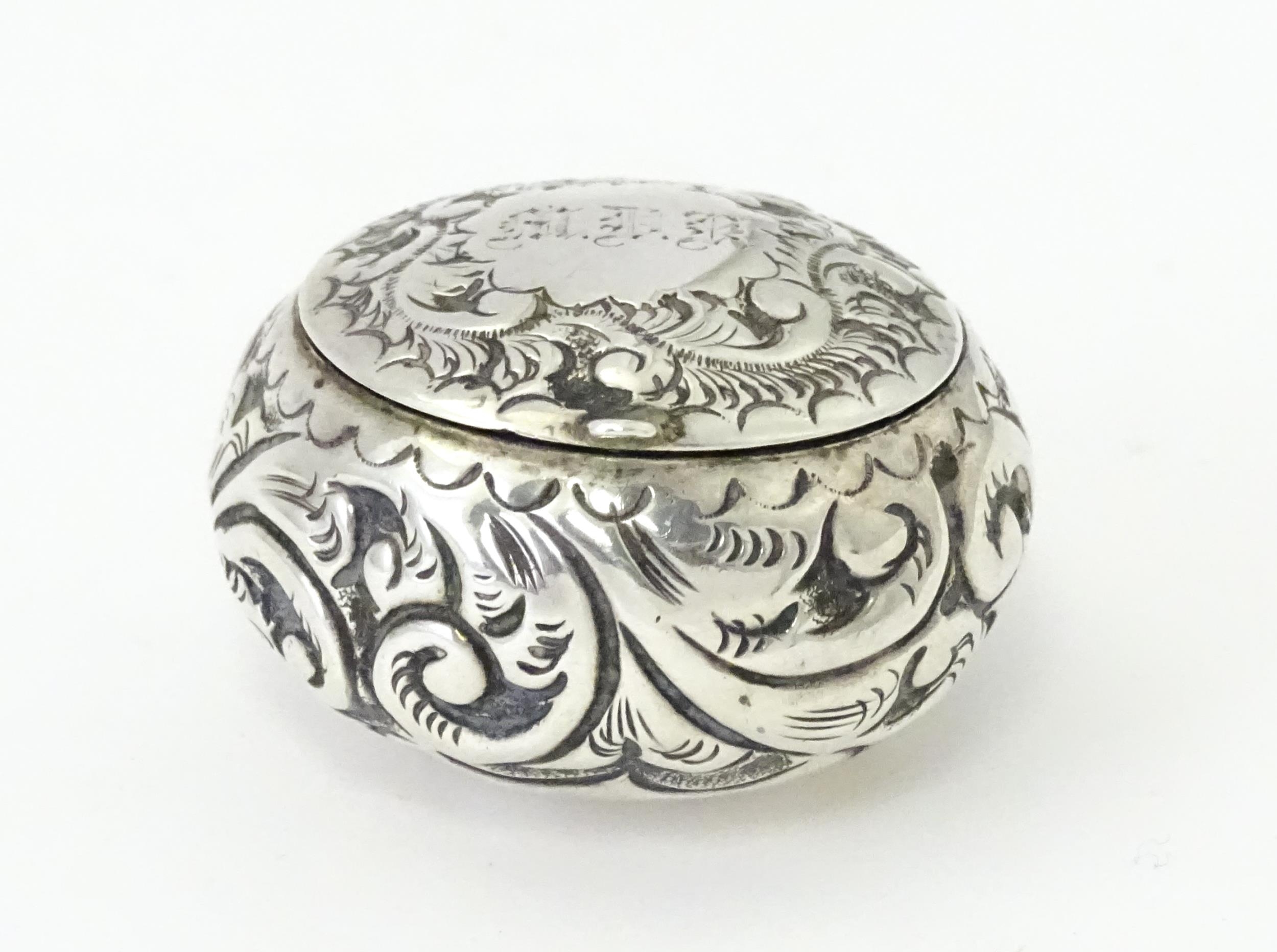 A Victorian silver pill pot with embossed decoration, hallmarked Birmingham 1896, maker Cornelius Desormeaux Saunders & James Francis Hollings Shepherd. Approx. 1 1/2" wide
