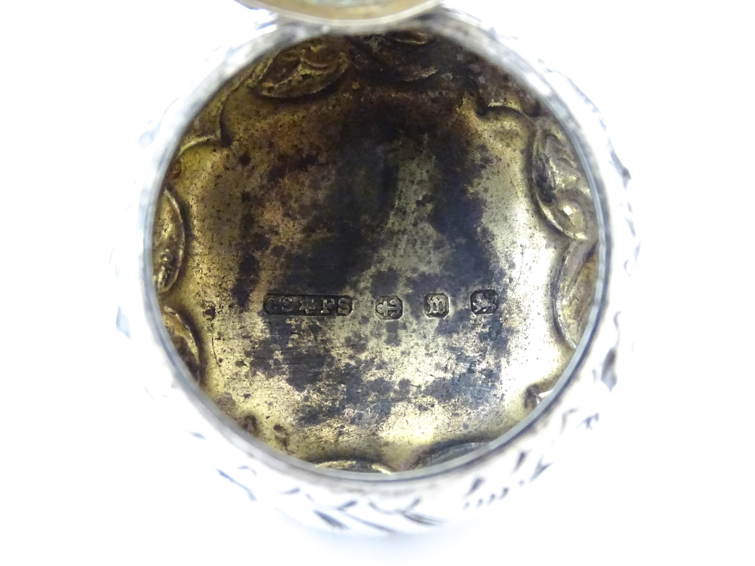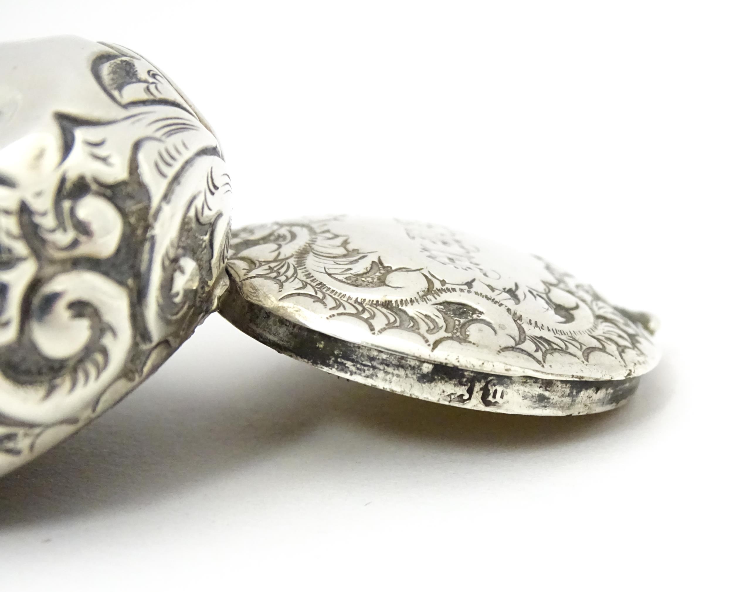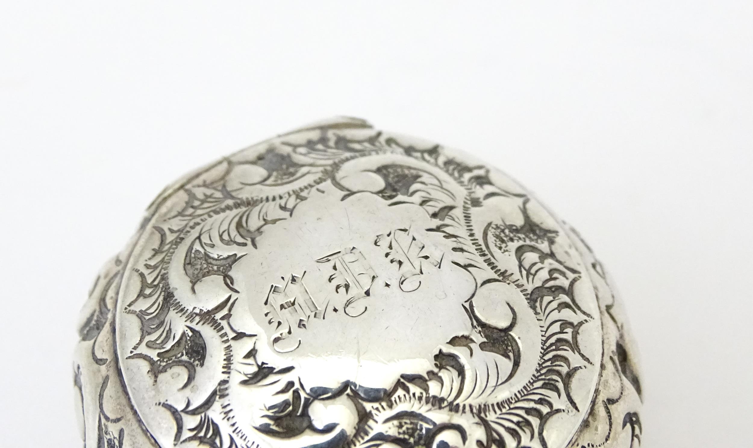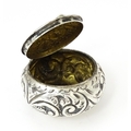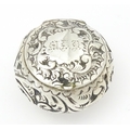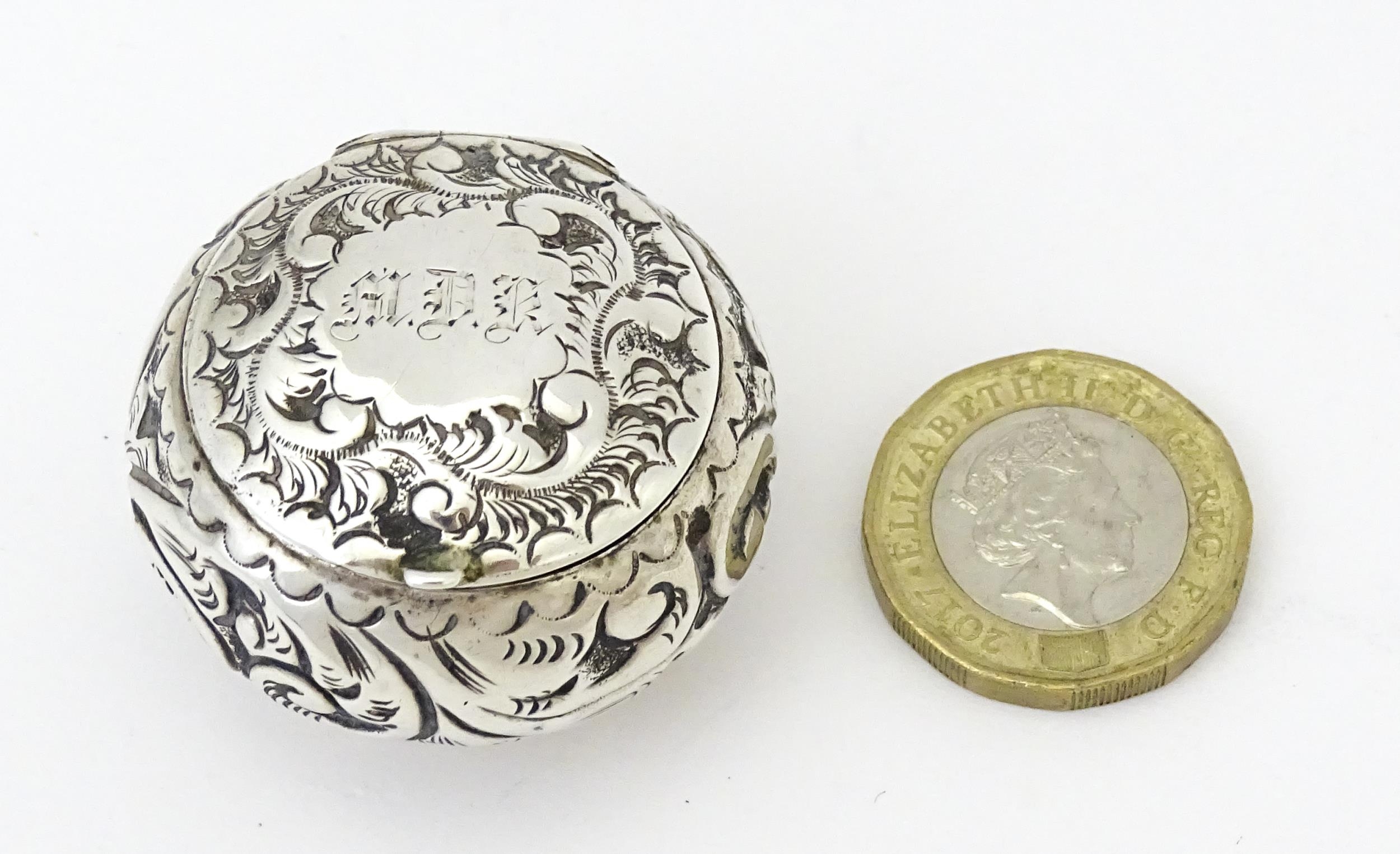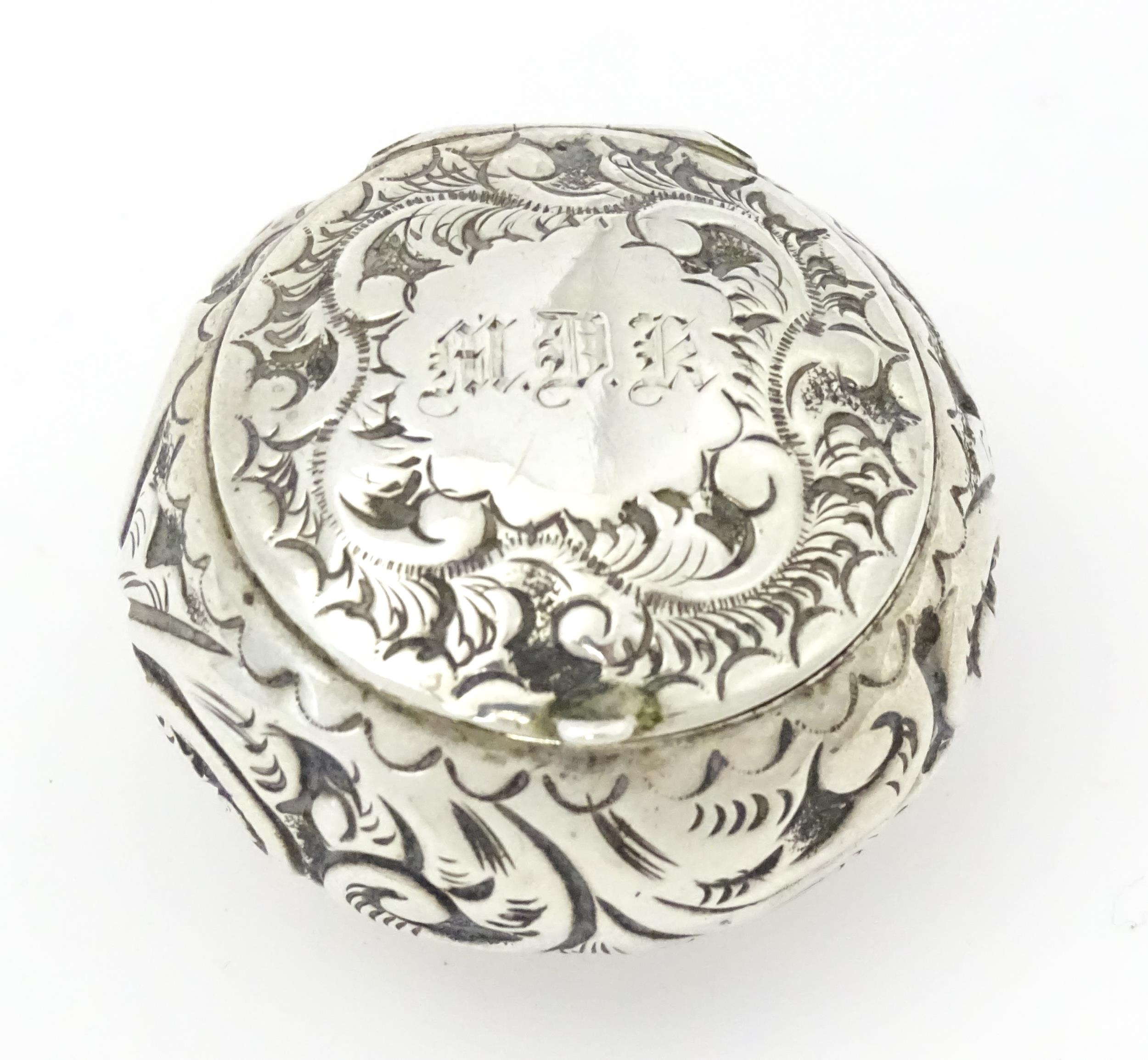 A Victorian silver pill pot with embossed decoration, hallmarked Birmingham 1896, maker Cornelius Desormeaux Saunders & James Francis Hollings Shepherd. Approx. 1 1/2" wide