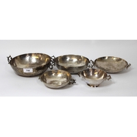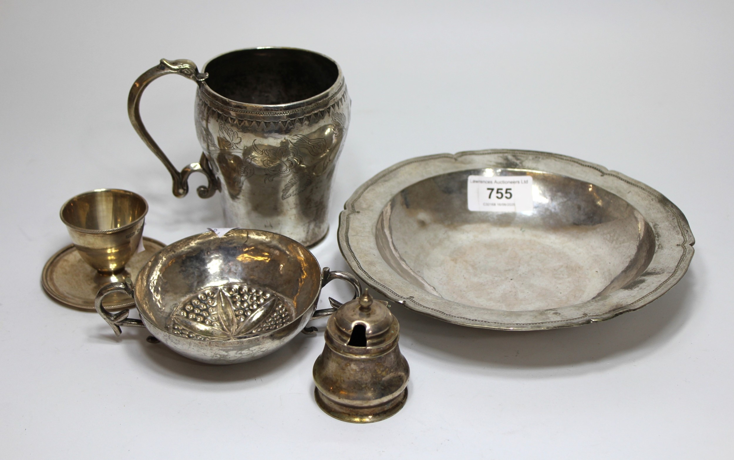 Continental white metal floral engraved mug, similar shallow dish and a silver egg cup (20oz t), together with a silver plated mustard and a plated two handled small bowl