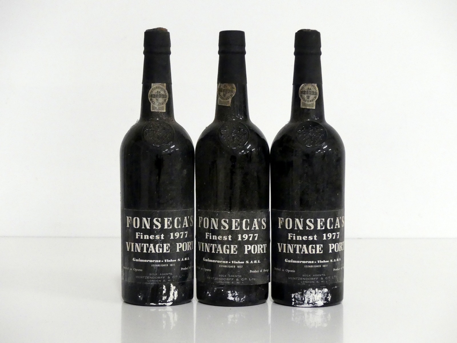 3 bts Fonseca 1977 Vintage Port 2 i.n, 1 ts, loose labels, sl bs