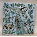 An 18thC Sajavid pottery tile, depicting a figure in a garden 8.25"sq