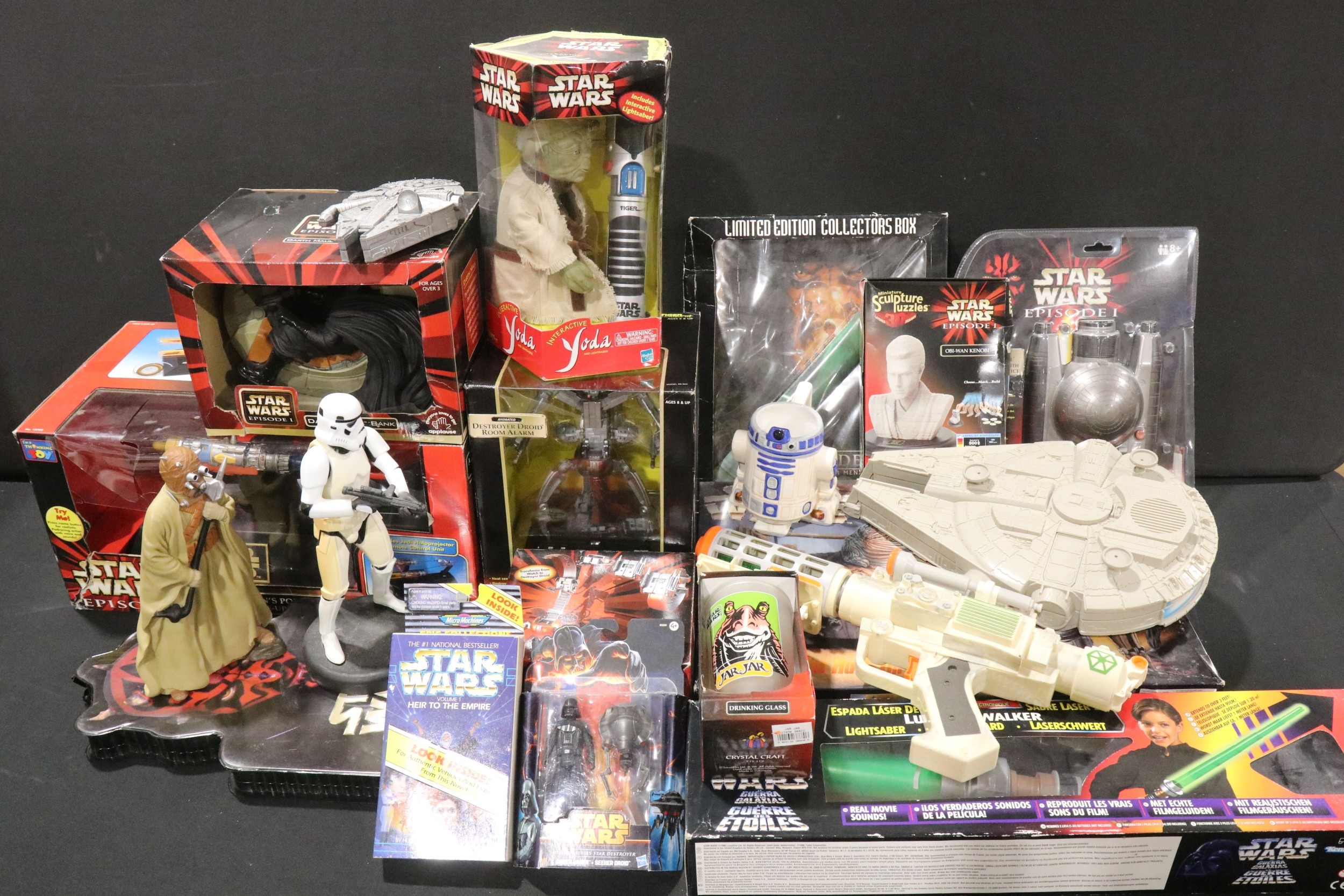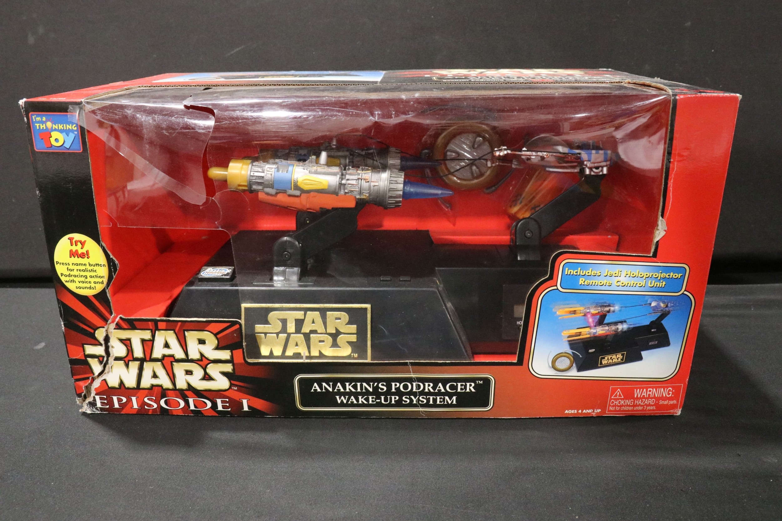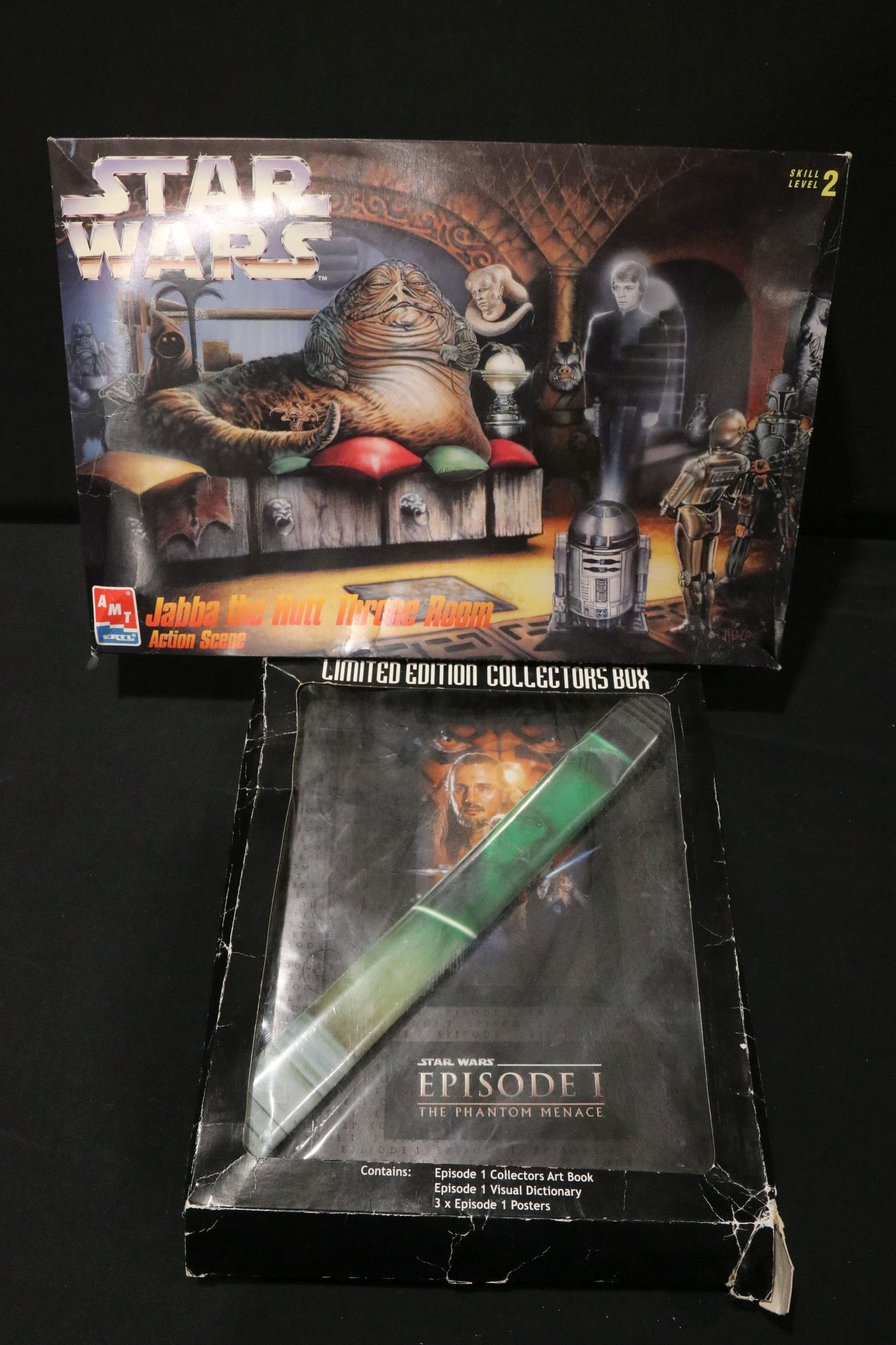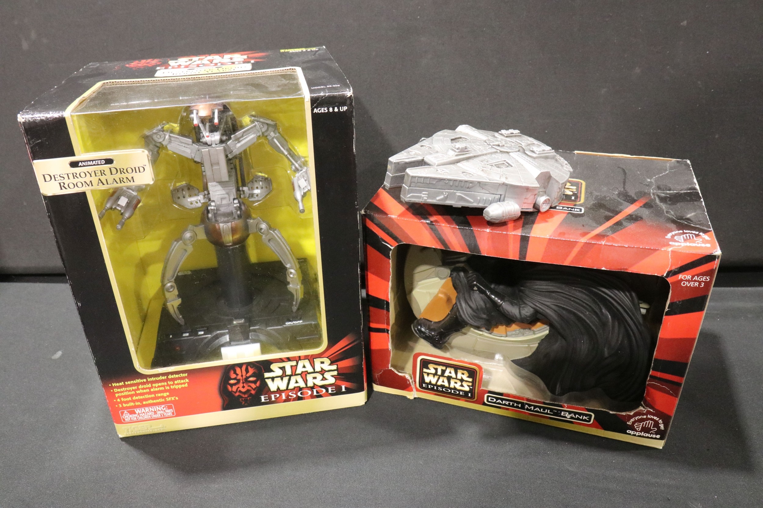 Star Wars - 10 Boxed Star Wars figures, toys and collectables plus additional unboxed items featuring boxed Episode I Anakin's Podracer Wake Up System, Applause Episode I Darth Maul Bank, AMT ERTL Jabba the Hutt Throne Room action scene, Kenner Luke Skywalker Lightsabre etc (2 boxes)