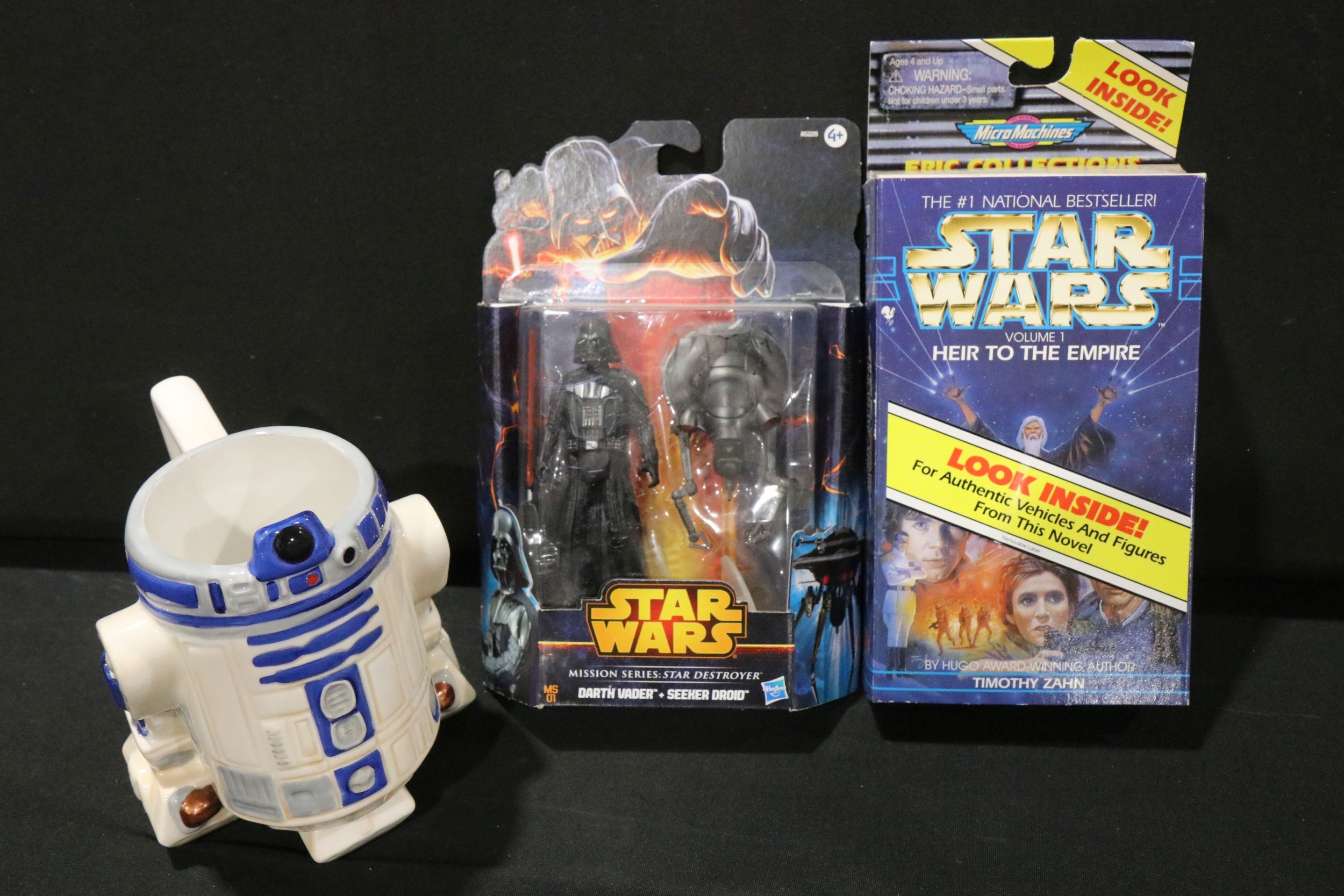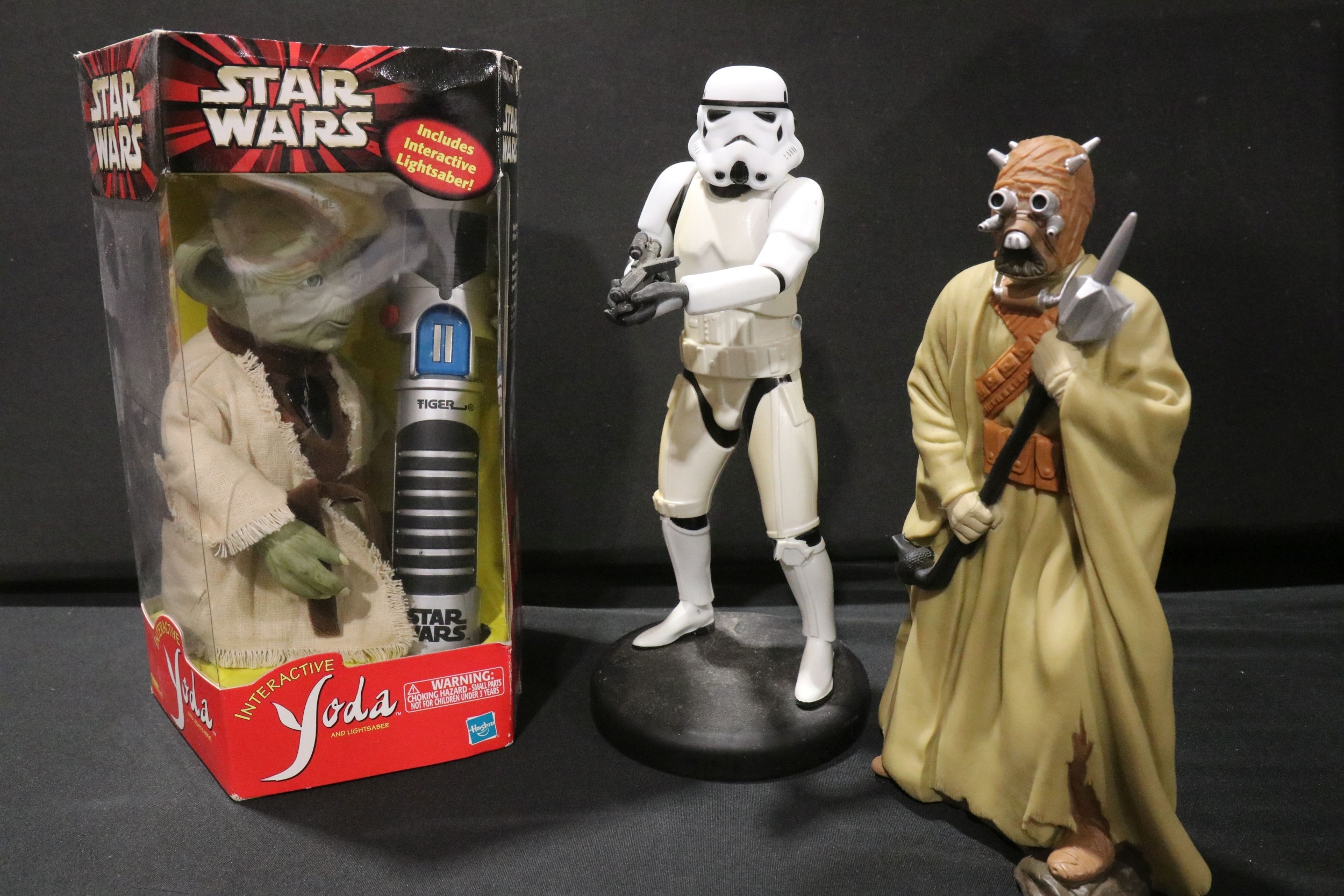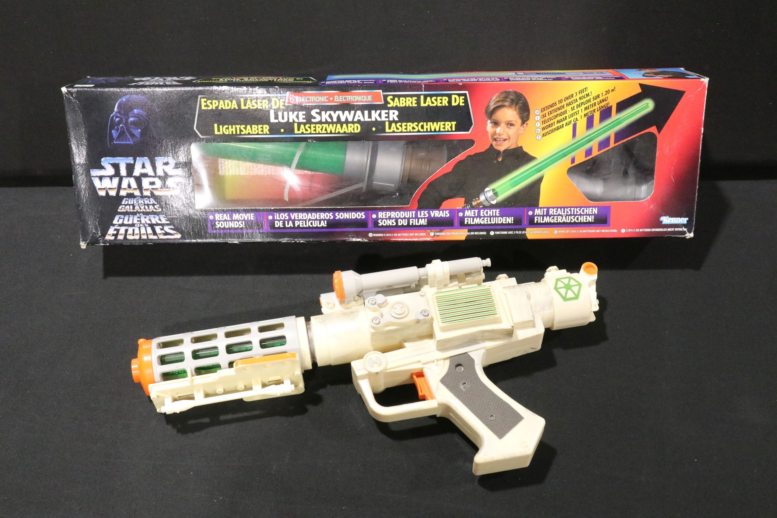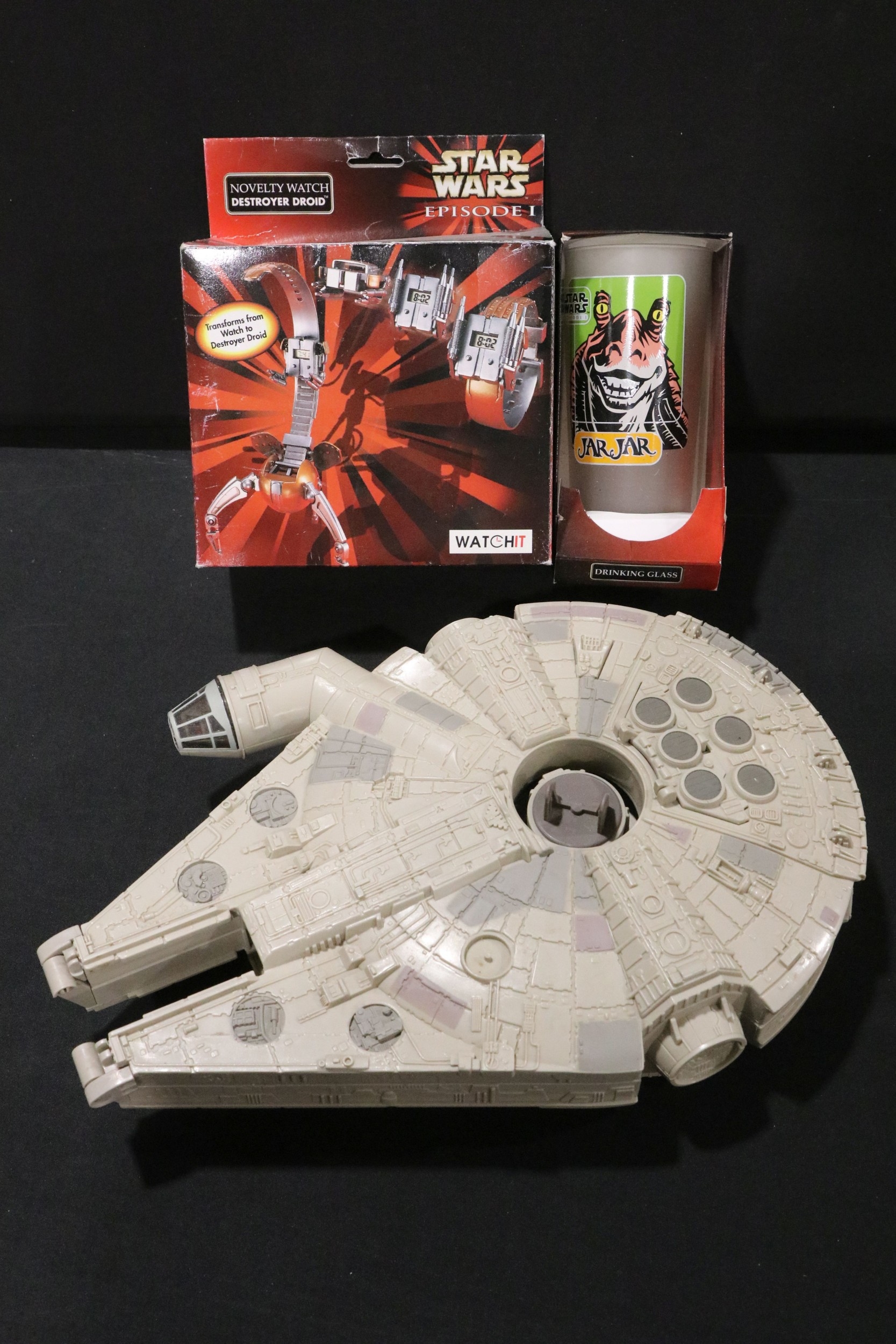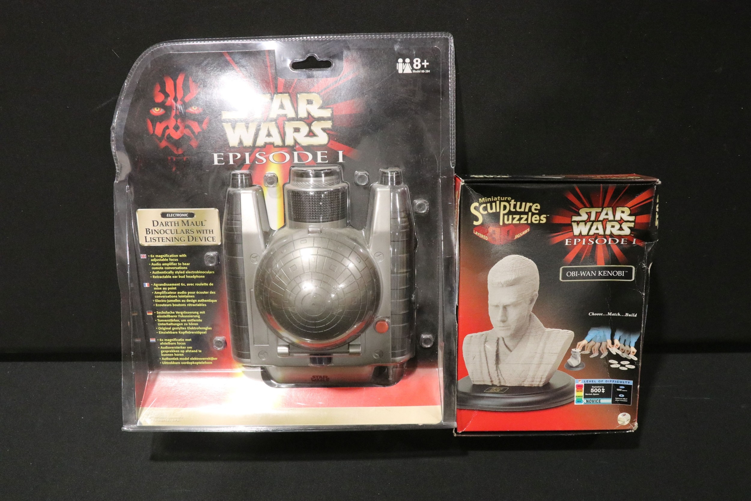 Star Wars - 10 Boxed Star Wars figures, toys and collectables plus additional unboxed items featuring boxed Episode I Anakin's Podracer Wake Up System, Applause Episode I Darth Maul Bank, AMT ERTL Jabba the Hutt Throne Room action scene, Kenner Luke Skywalker Lightsabre etc (2 boxes)