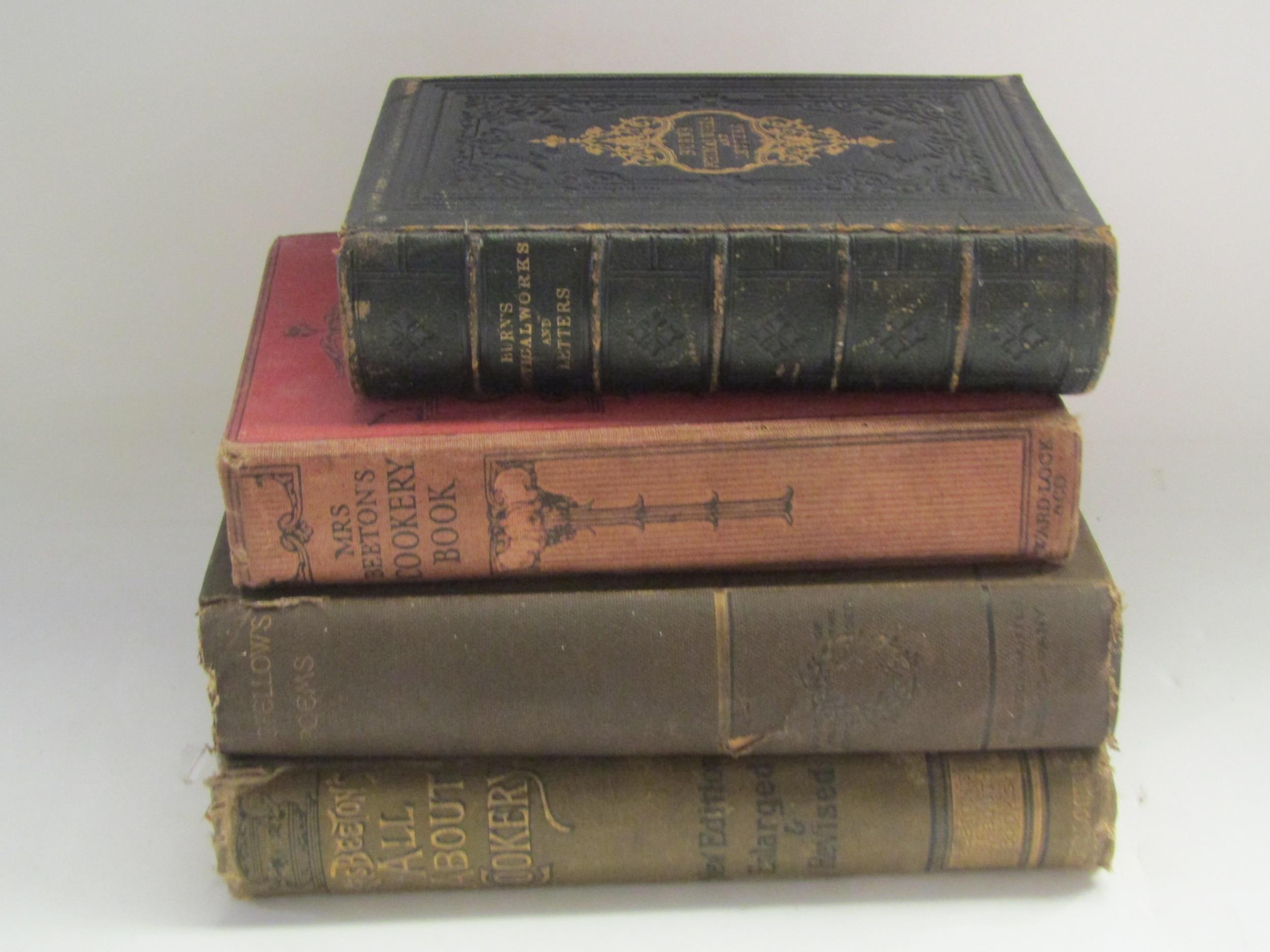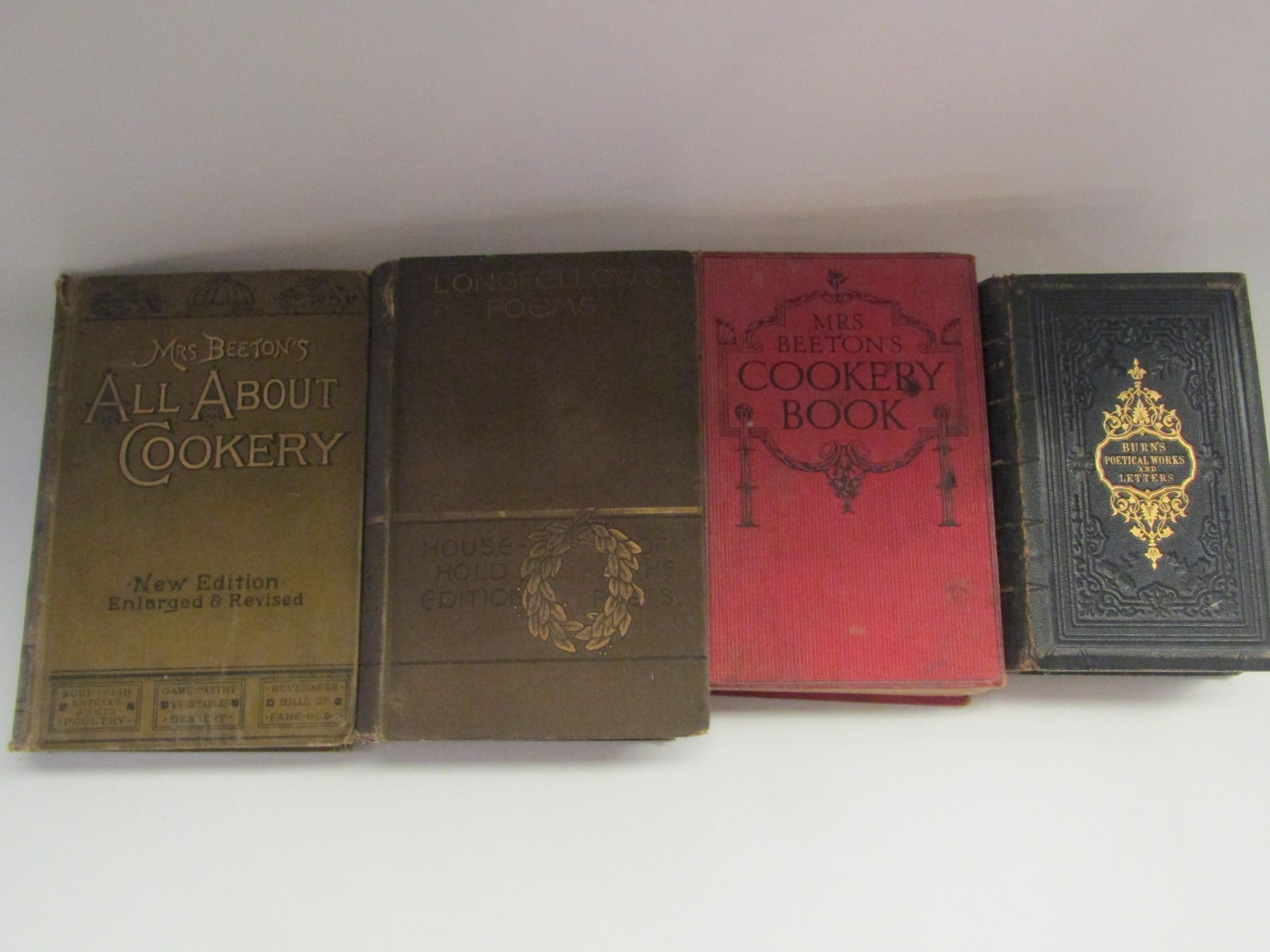 Four books to include "Mrs Beeton's all about Cookery", Longfellow's Poems and Burns' Poetical Words and Letters