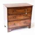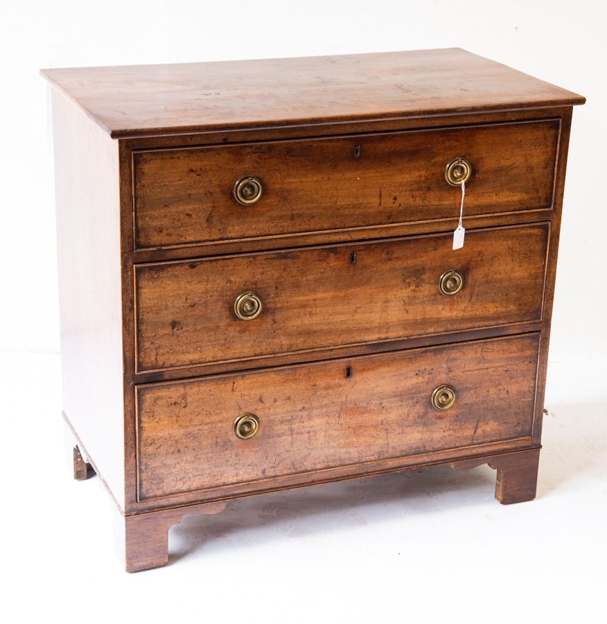 GEORGE III MAHOGANY SMALL CHEST OF THREE DRAWERS, each cockbeaded and fitted with brass ring handles, raised on bracket feet, 32” (81.3cm) high, 34 ½” x 19” (87.6cm x 48.2cm)