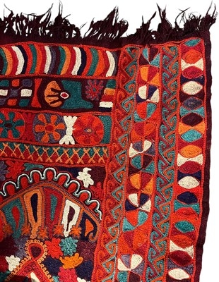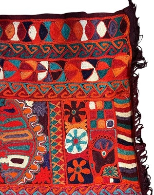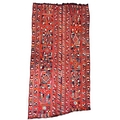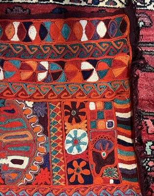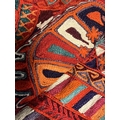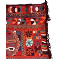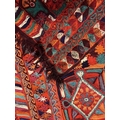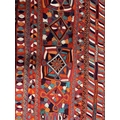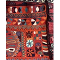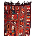 A 20th century Iraqi Marsh Arab Kilim hand-woven wool tapestry rug. The carpet in bright colours with geometric motifs throughout and central seam. Short tassels to uneven ends.