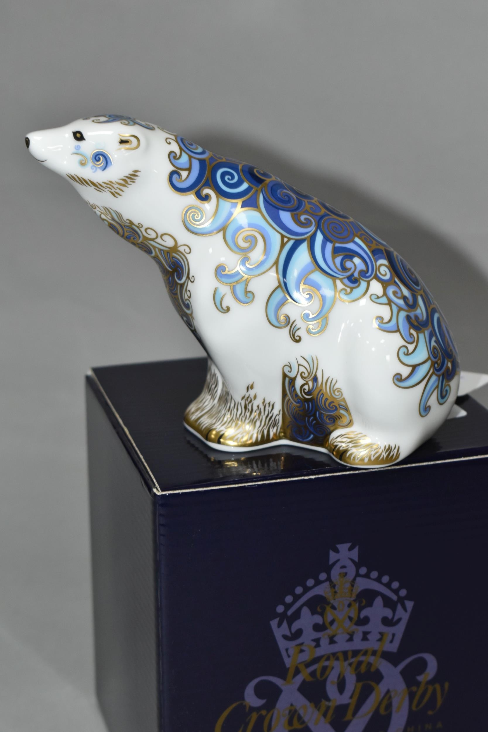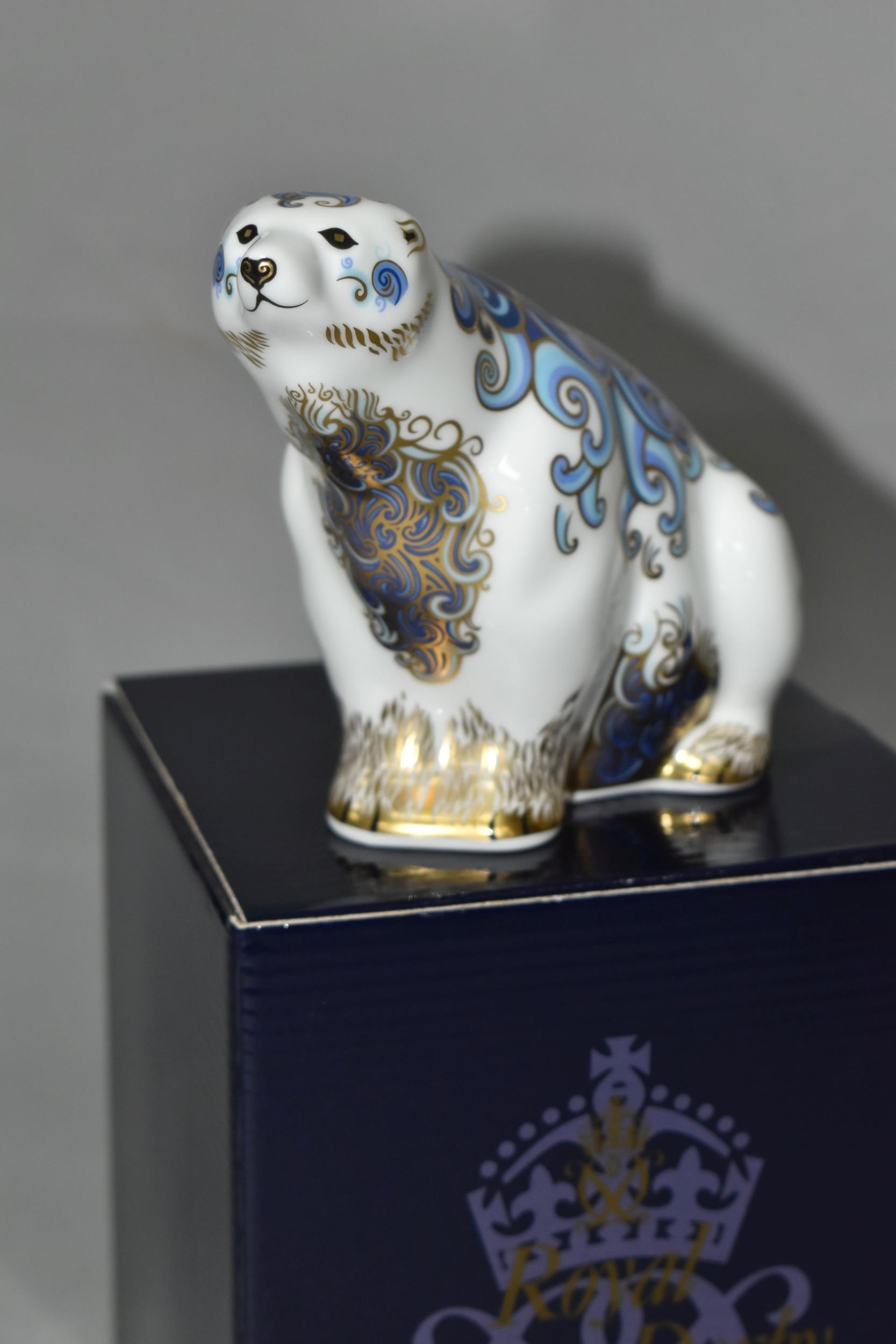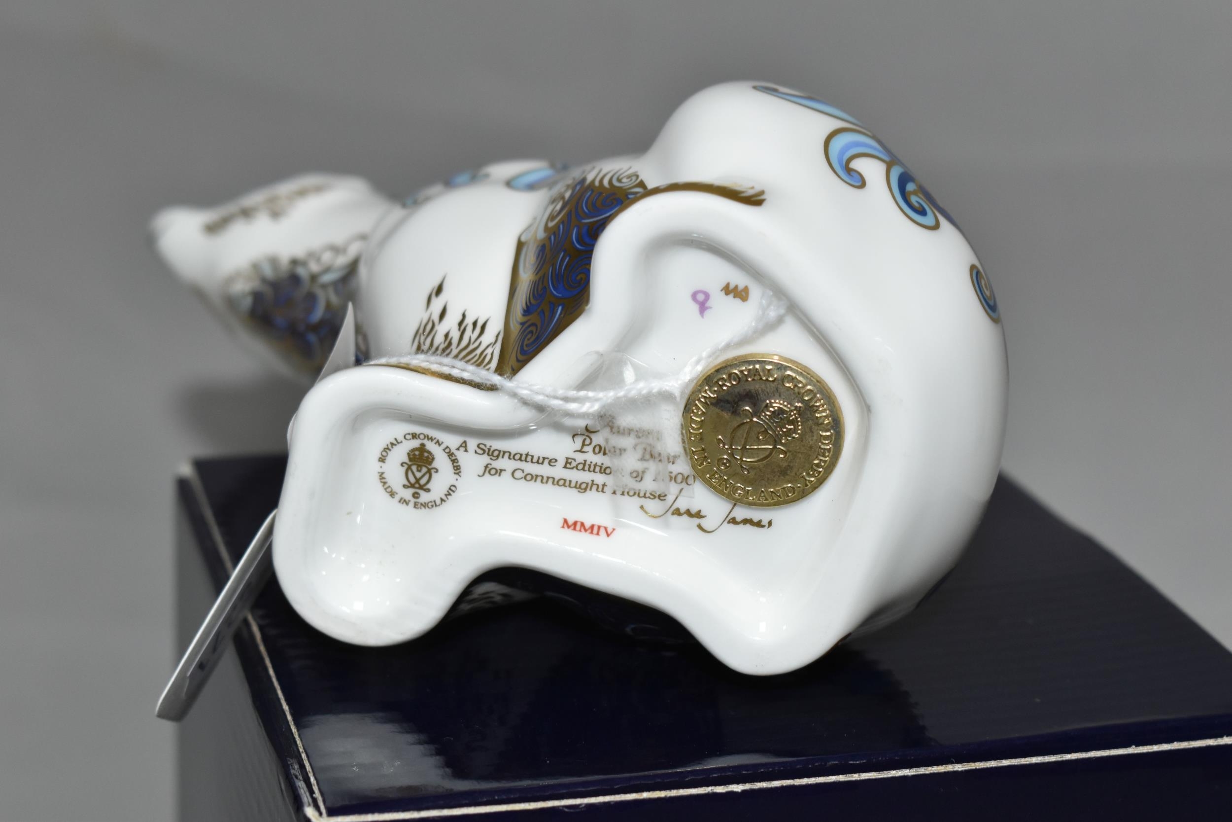 A BOXED ROYAL CROWN DERBY IMARI PAPERWEIGHT, Aurora Polar Bear issued 2004 a pre-released limited edition of 1500 by Connaught House with special gold signature edition backstamp, with gold button stopper and box (1 + box) (Condition report: good)
