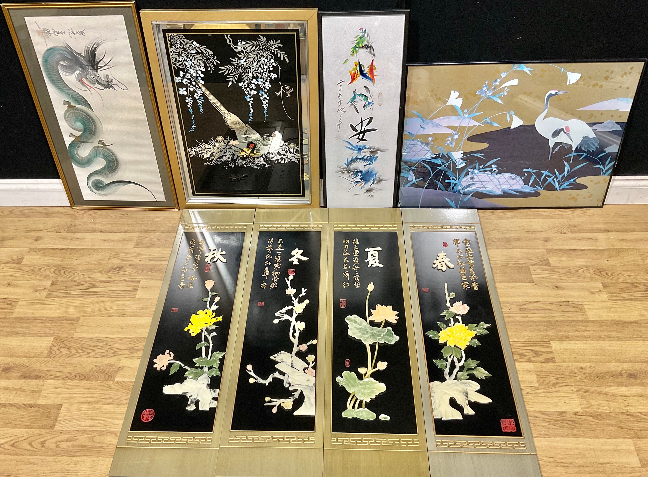 Interior Decoration - a set of four Chinese rectangular panels, decorated in relief with composite stylised flowers, 110cm x 30cm; a Chinese watercolour, of a stylised dragon, script mark, 73cm x 34cm; a rectangular mirrored panel, of pheasants, in the Chinese manner, 70cm x 50cm; etc (8)