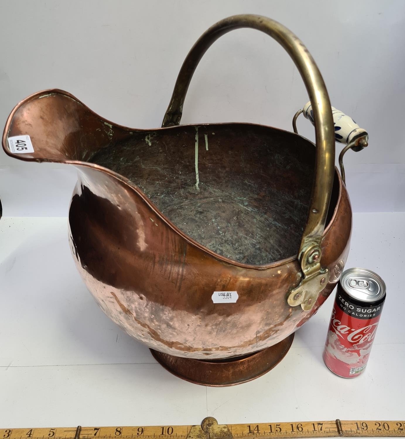 Nice big Copper coal scuttle with enamel handle