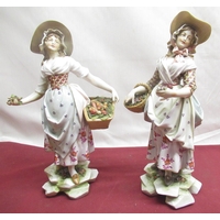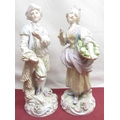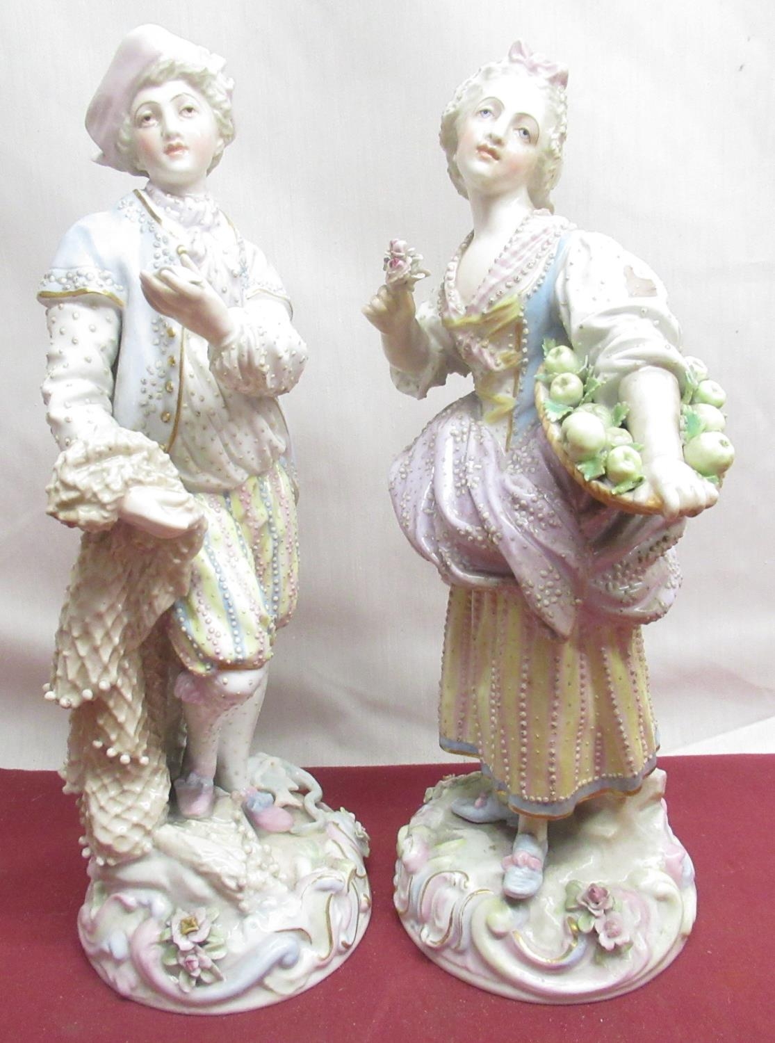 Pair of C20th Continental porcelain models of male fisherman and female fruit seller, both in C18th attire, on circular bases with gilt detail, blue printed marks, H30cm (2)