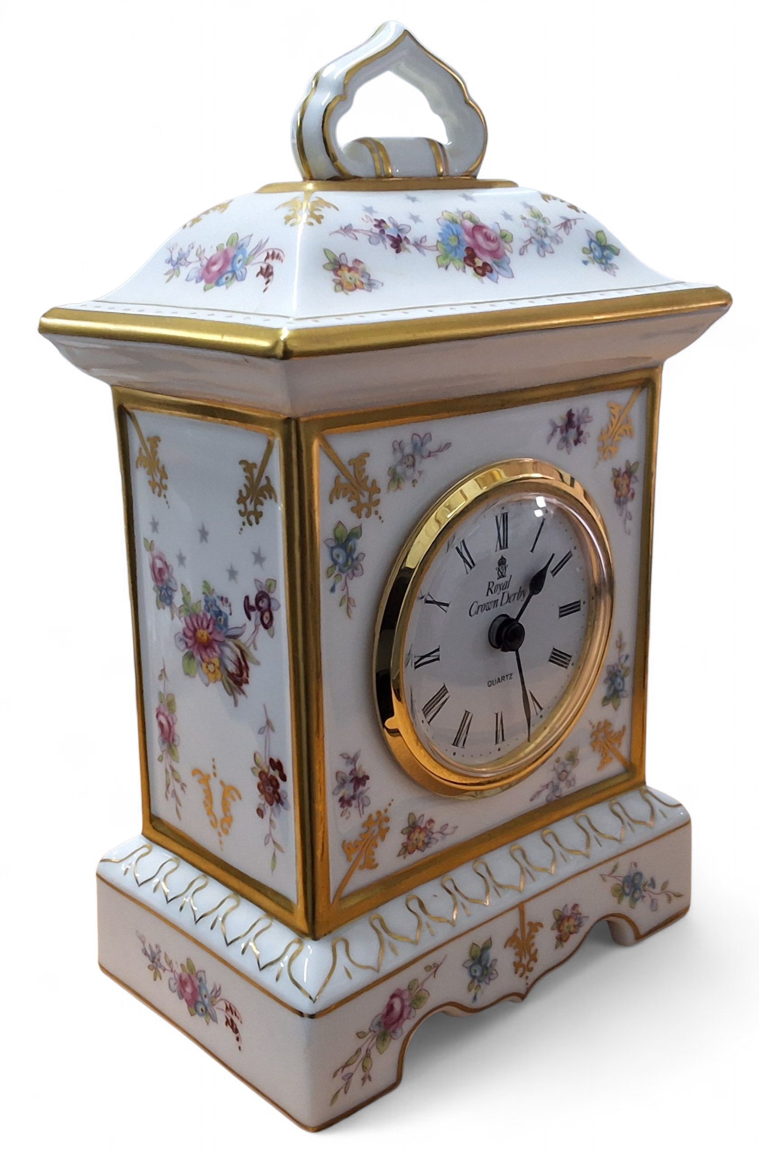A Royal Crown Derby Royal Antoinette patter mantel clock, 18cm high, first quality