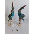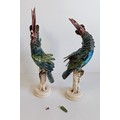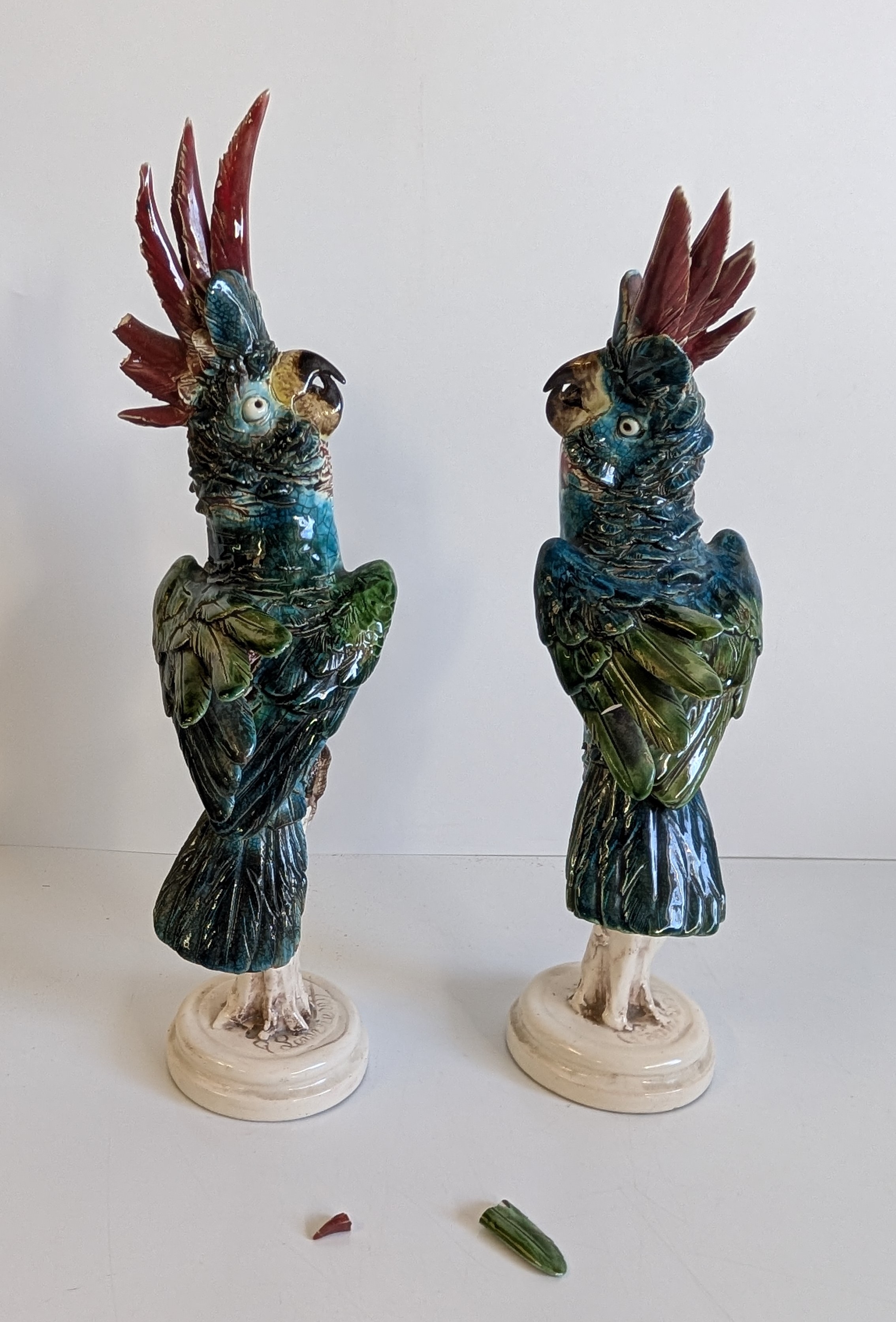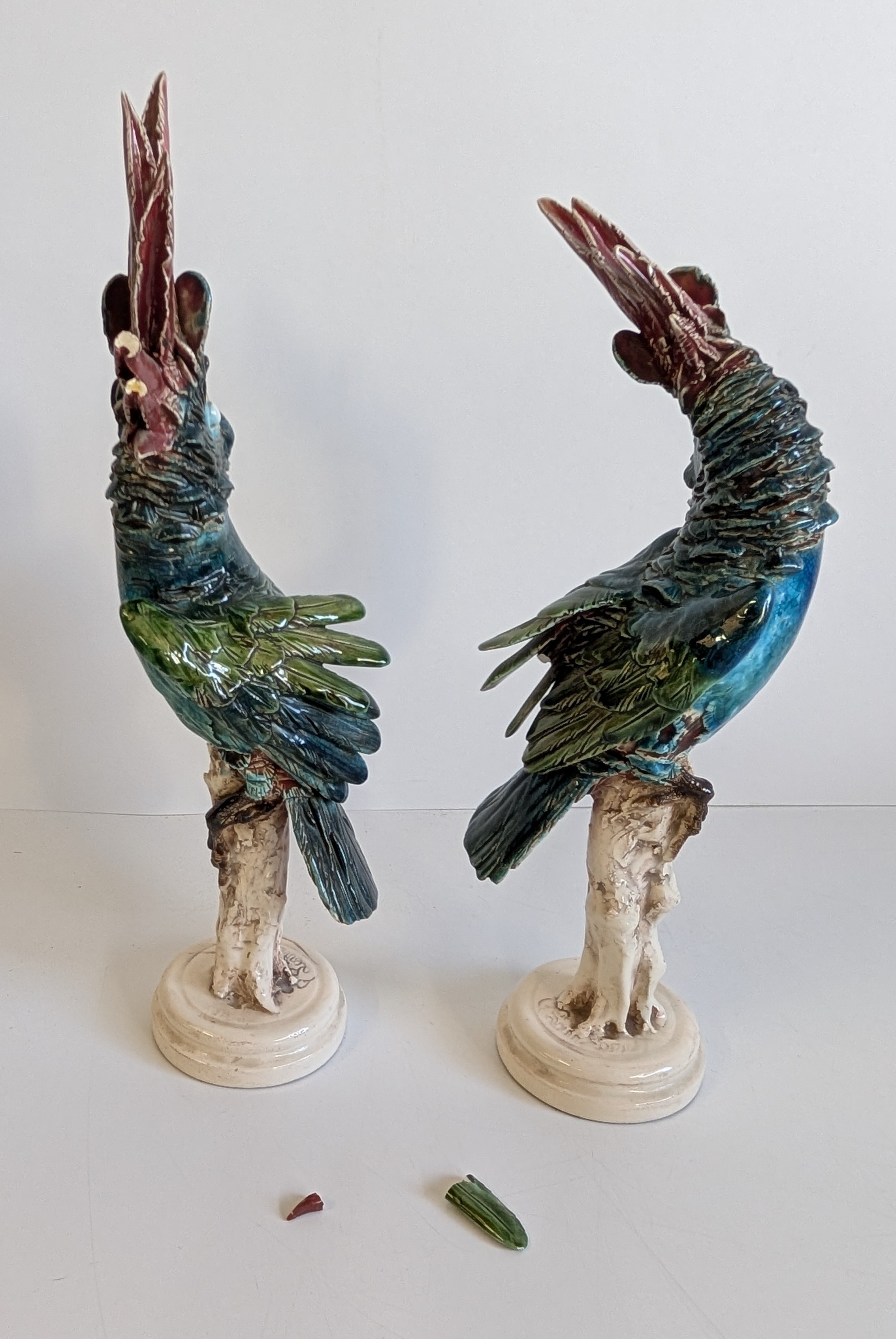 Condition: One with detached crest and wing feathers (present for restoration); both with some glaze wear and firing imperfections typical of the type.