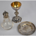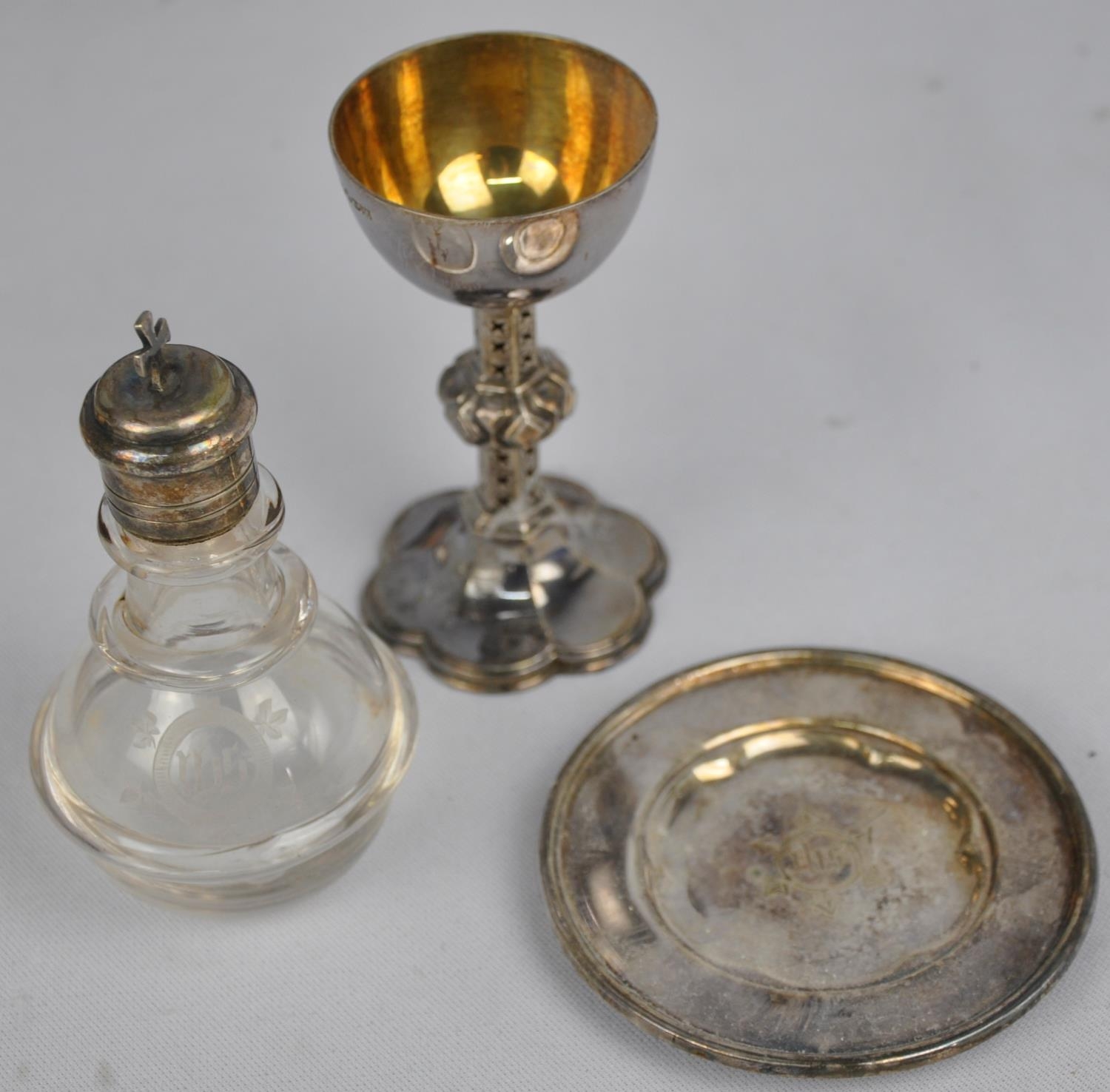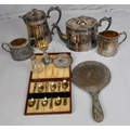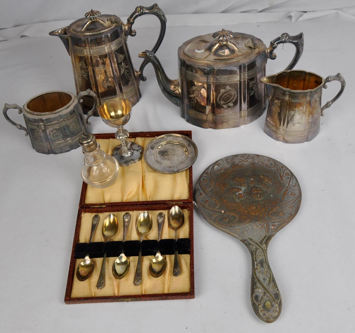4 PIECE PLATED TEA SERVICE, HAND HELD MIRROR,PLATED COMMUNION SET, SET 6 WALKER & HALL HALLMARKED SILVER TEASPOONS
