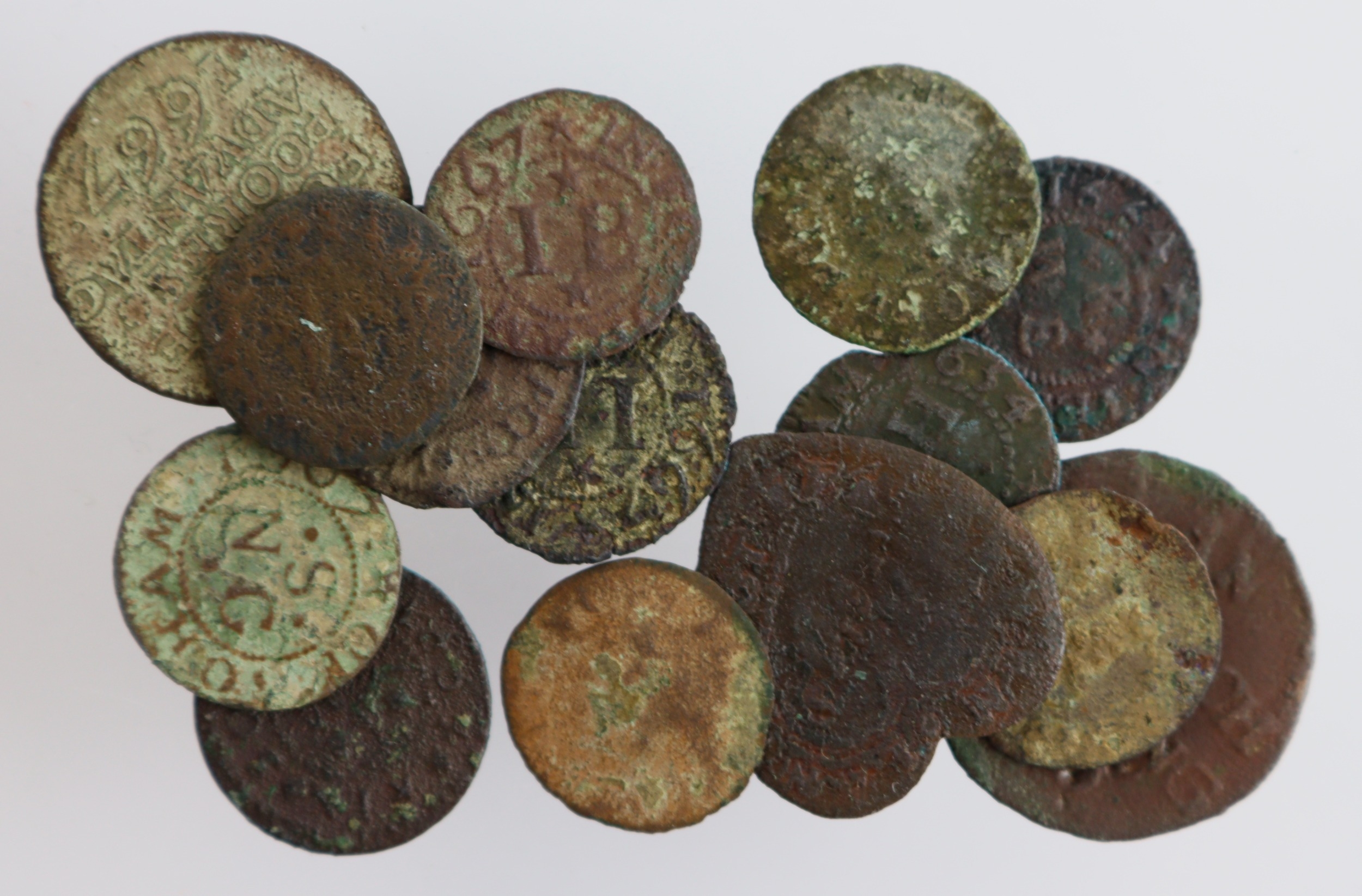 Tokens, 17thC (15): Suffolk: East Bergholt, Lancelot Felton heart-shaped Halfpenny, W#118, very rare, poor-fair; Brandon, Henry Everard Farthing W#30 fair/aVG; Ipswich town Farthing W#158 nVG; Southwold town Halfpenny W#294 poor-fair; Essex: Stisted, James Bonum Farthing W#300 poor/fair (rare); Cambridgeshire: Fordham: John Badcock Farthing W#126 aVG; ditto nVG; Isleham: William Reade Farthing W#140 fair-VG (rare); Littleport: Overseers Farthing W#146 VG; ditto x3 poor-fair; Soham: Hovell Ioames Farthing W#171 (slight mis-cut); Tomas Trowell Farthing W#170 poor/fair (rare); and Natham Stern Farthing W#173 nVG.