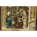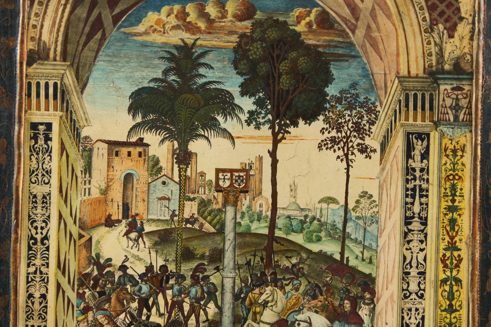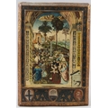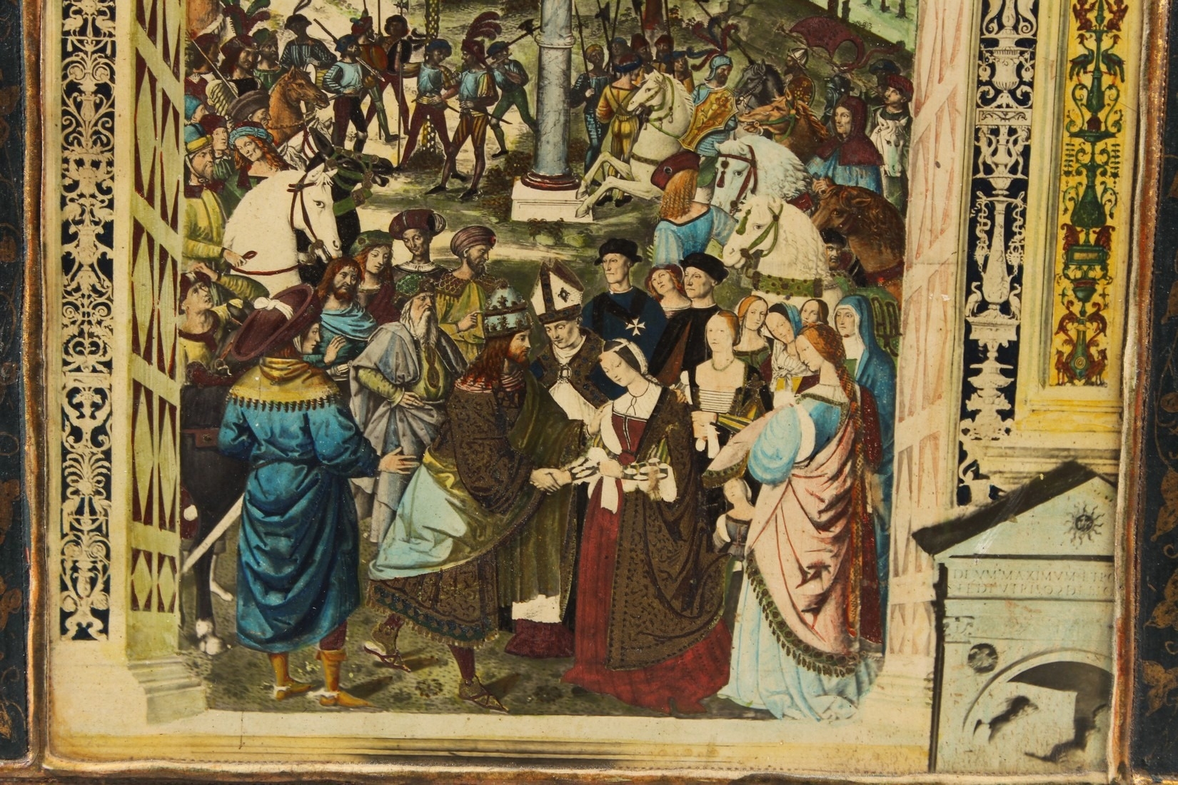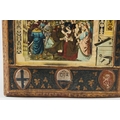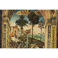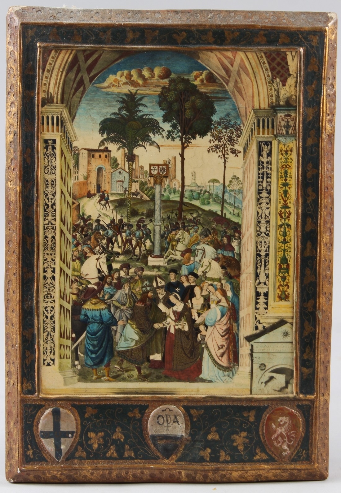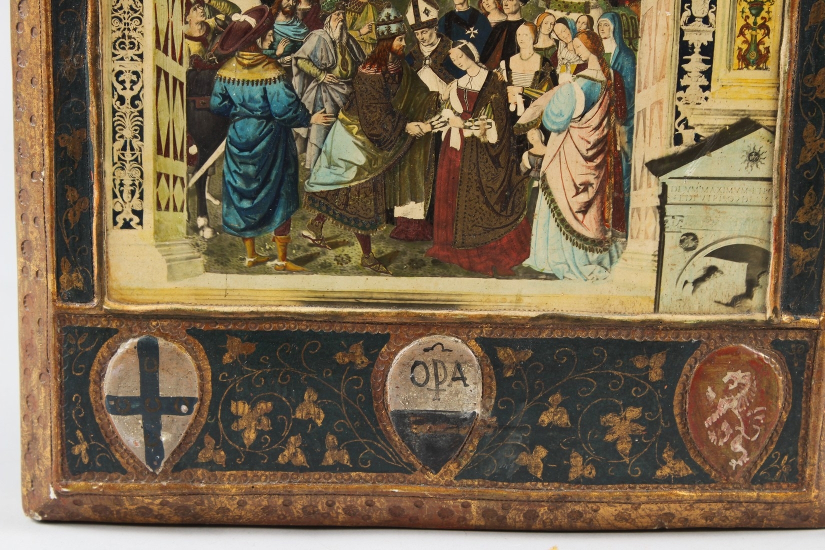 AFTER PINTURICCHIO (1454-1513) 'The betrothal of Frederick III' printed copy of an Italian fresco from Siena mounted on wooden panel with hand painted shields and border 36 x 25cm