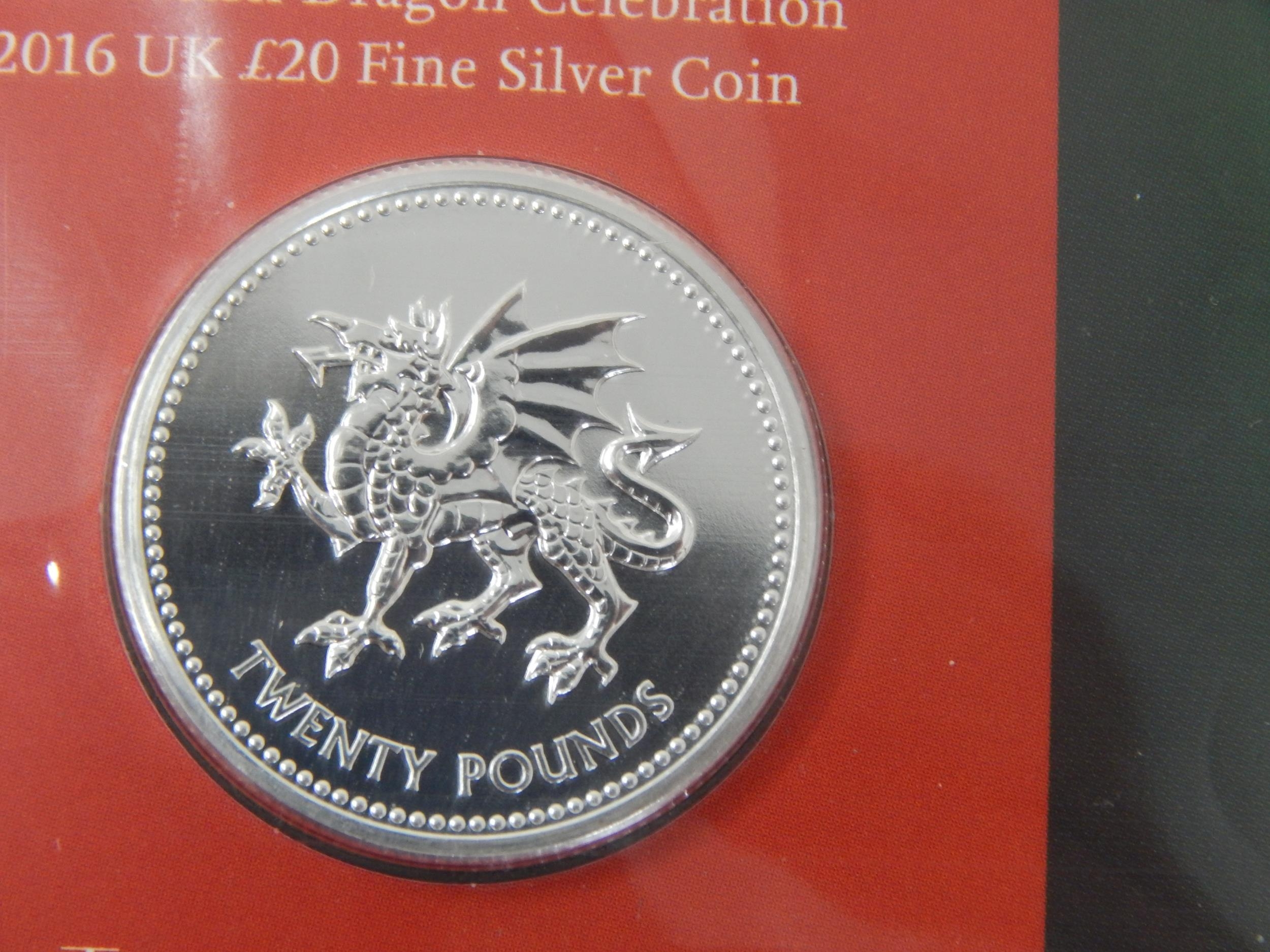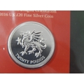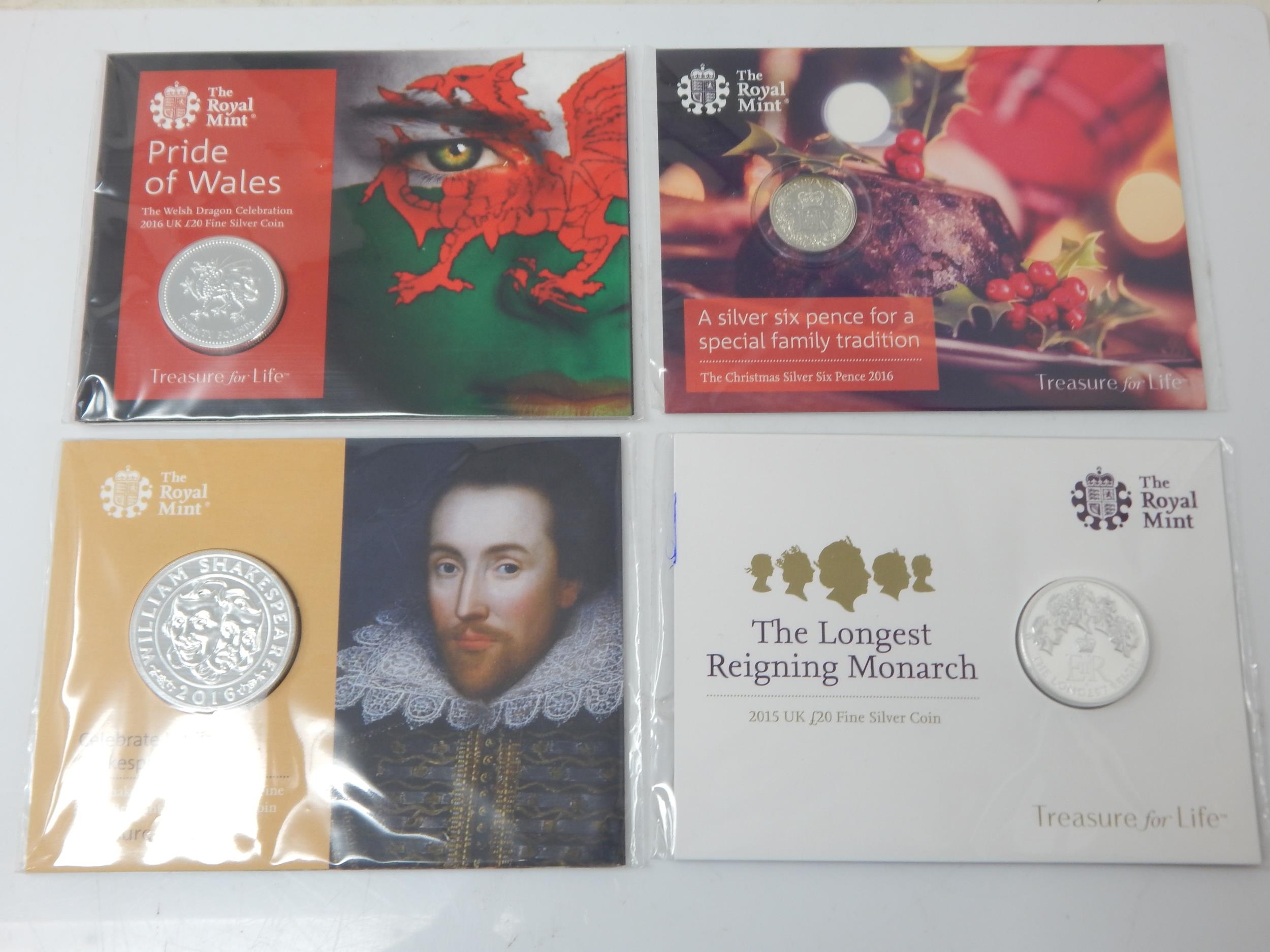 Pride of Wales Welsh Dragon 2016 £20 Silver coin; A Silver Sixpence 2016; Shakespeare 2016 UK £50 Fine Silver Brilliant Uncirculated, The Longest Reigning Monarch 2015 UK £20 Fine Silver coin all still sealed in Royal Mint packs (lot)