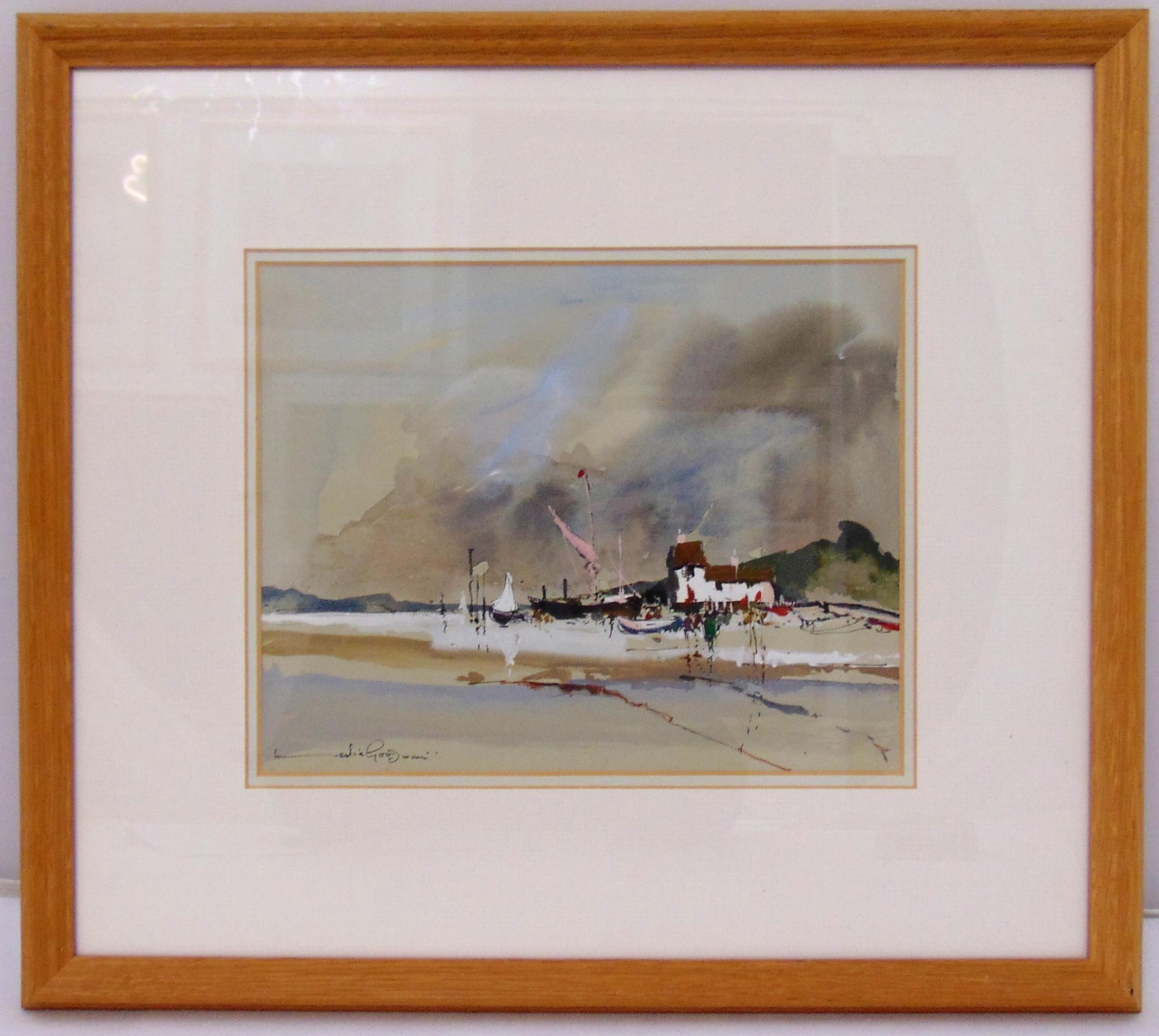 Leslie Goodwin framed and glazed watercolour titled Thames Barge Alburgh, signed bottom left, 20 x 24.5cm