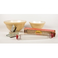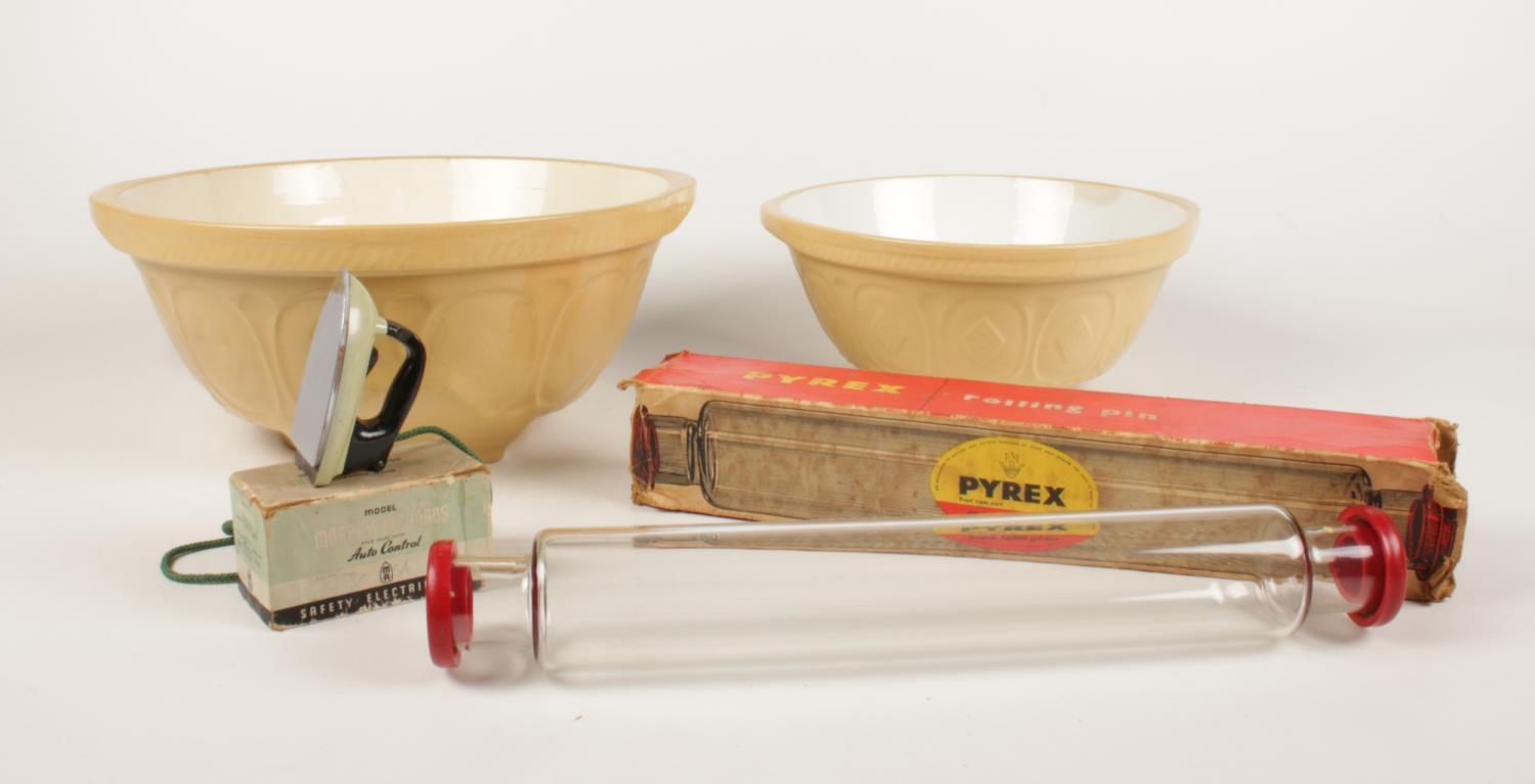 A group of kitchenalia. Two Gripstand ceramic bowls, vintage Pyrex oven table glass rolling pin (boxed), A model Morphy Richards Auto control iron.