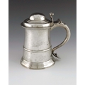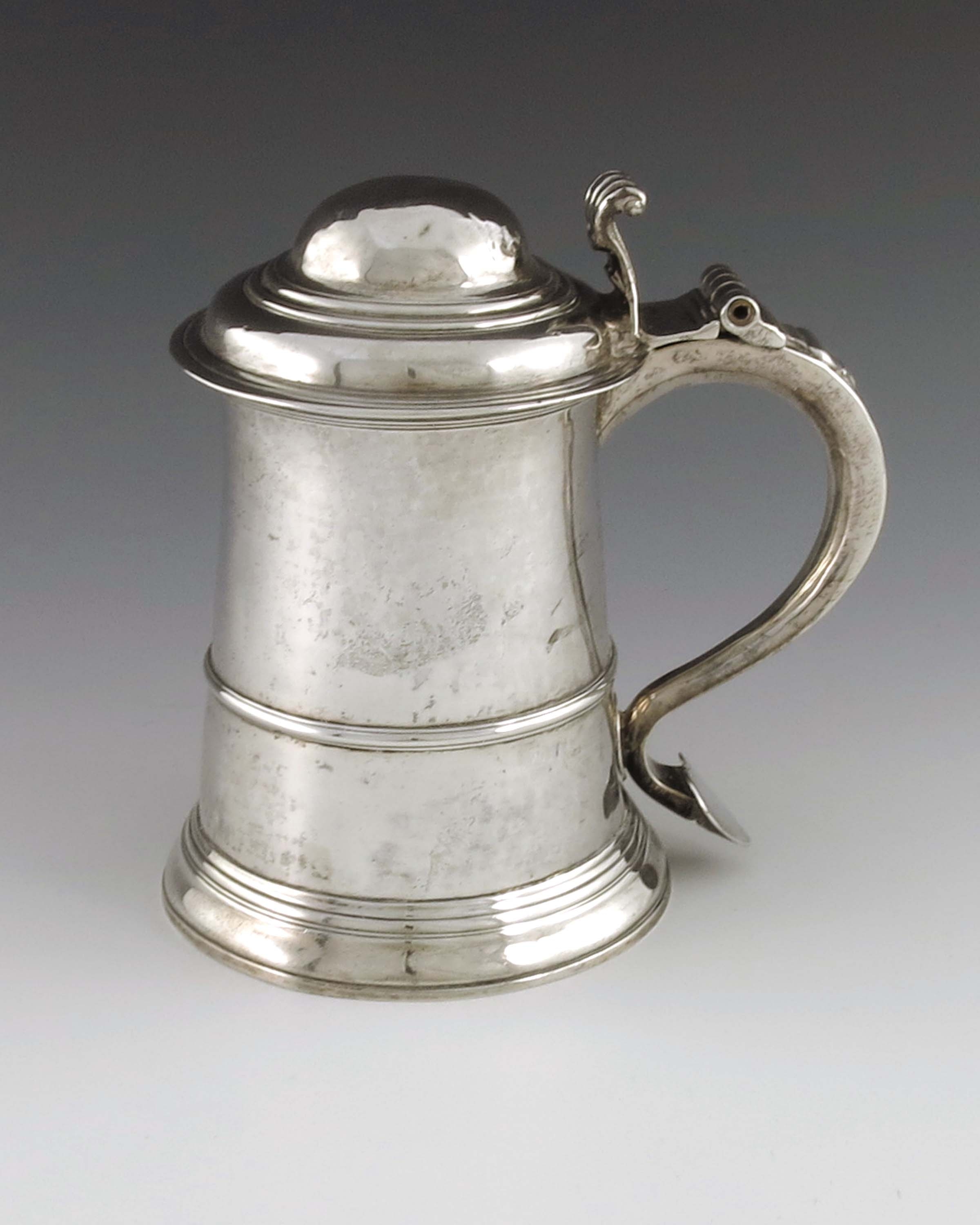 A George II silver lidded tankard, Benjamin Cartwright, London 1758, banded conical form with ogee domed lid, hollow S scroll handle, 18cm high, 20.74ozt