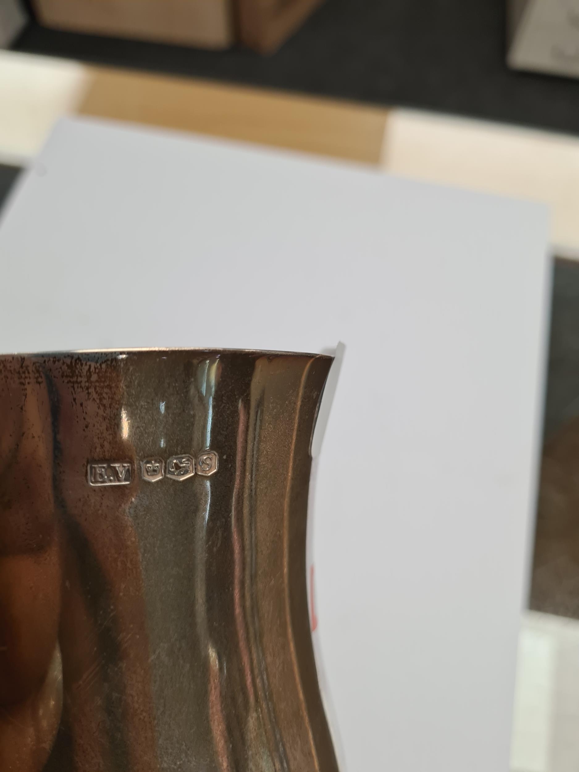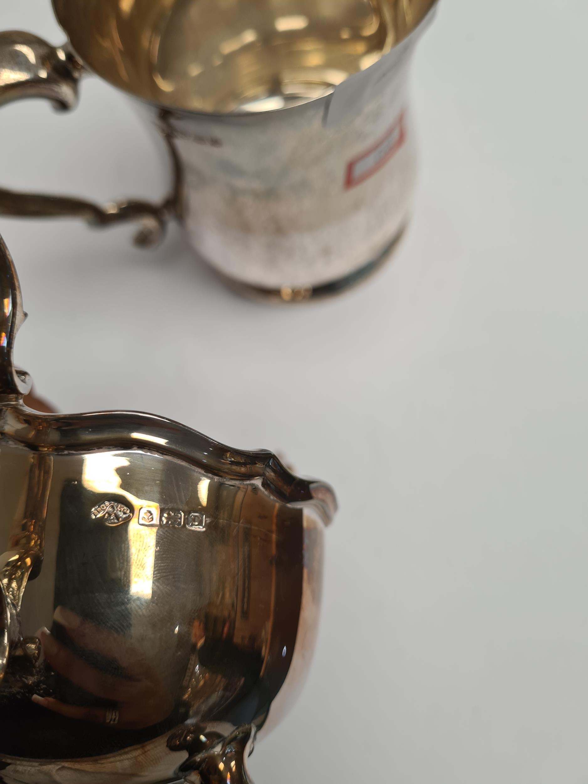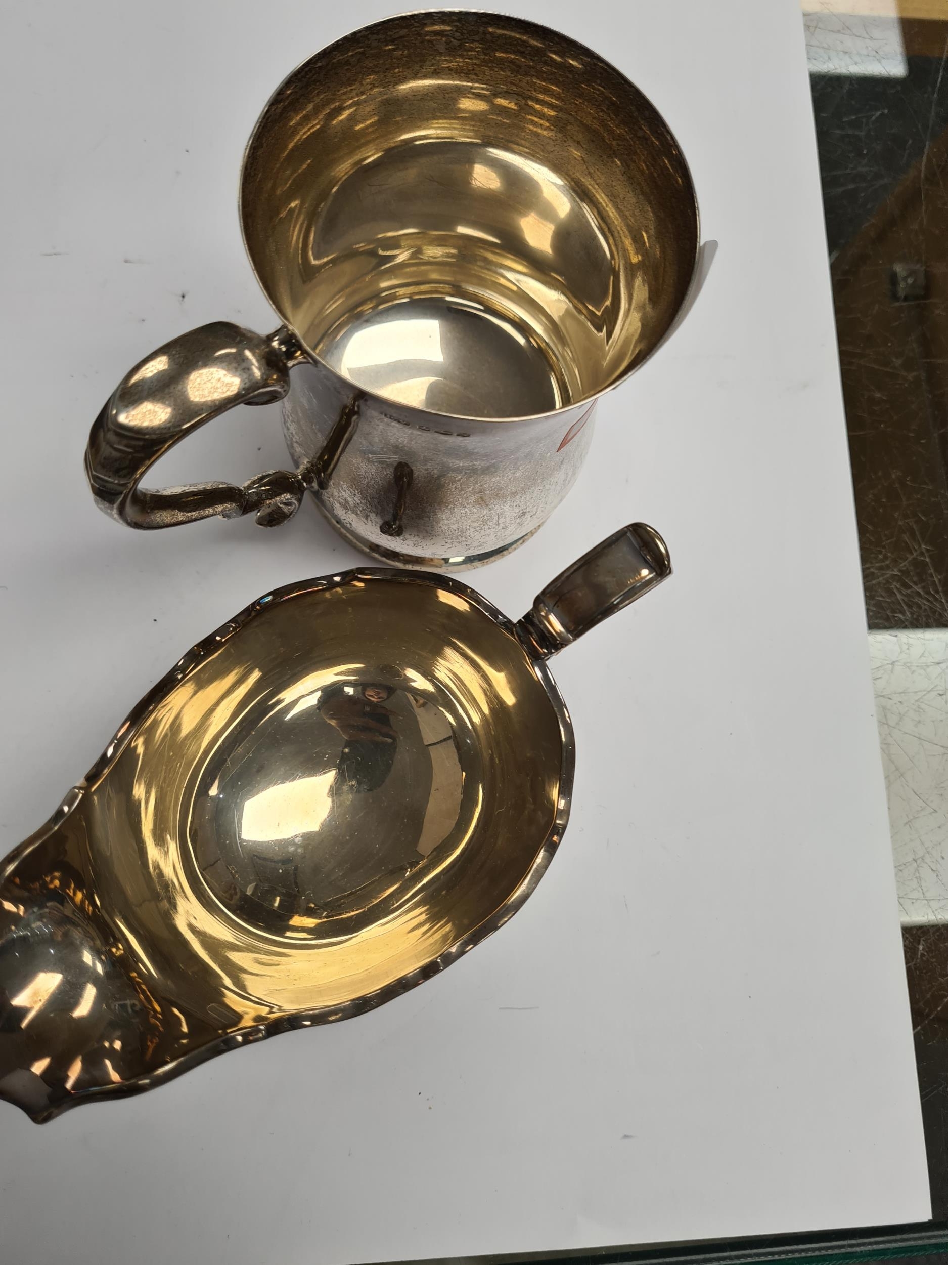 A Viners Ltd., heavy silver tankard having Acanthus leaf handle and heavy base, stamped 6th August 1961, Sheffield 1960. Also with a heavy gauge boat hallmarked Birmingham 1928. Adie Brothers Ltd. Approx 19.895ozt. Condition Report: No obvious damage seen