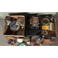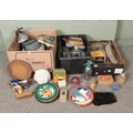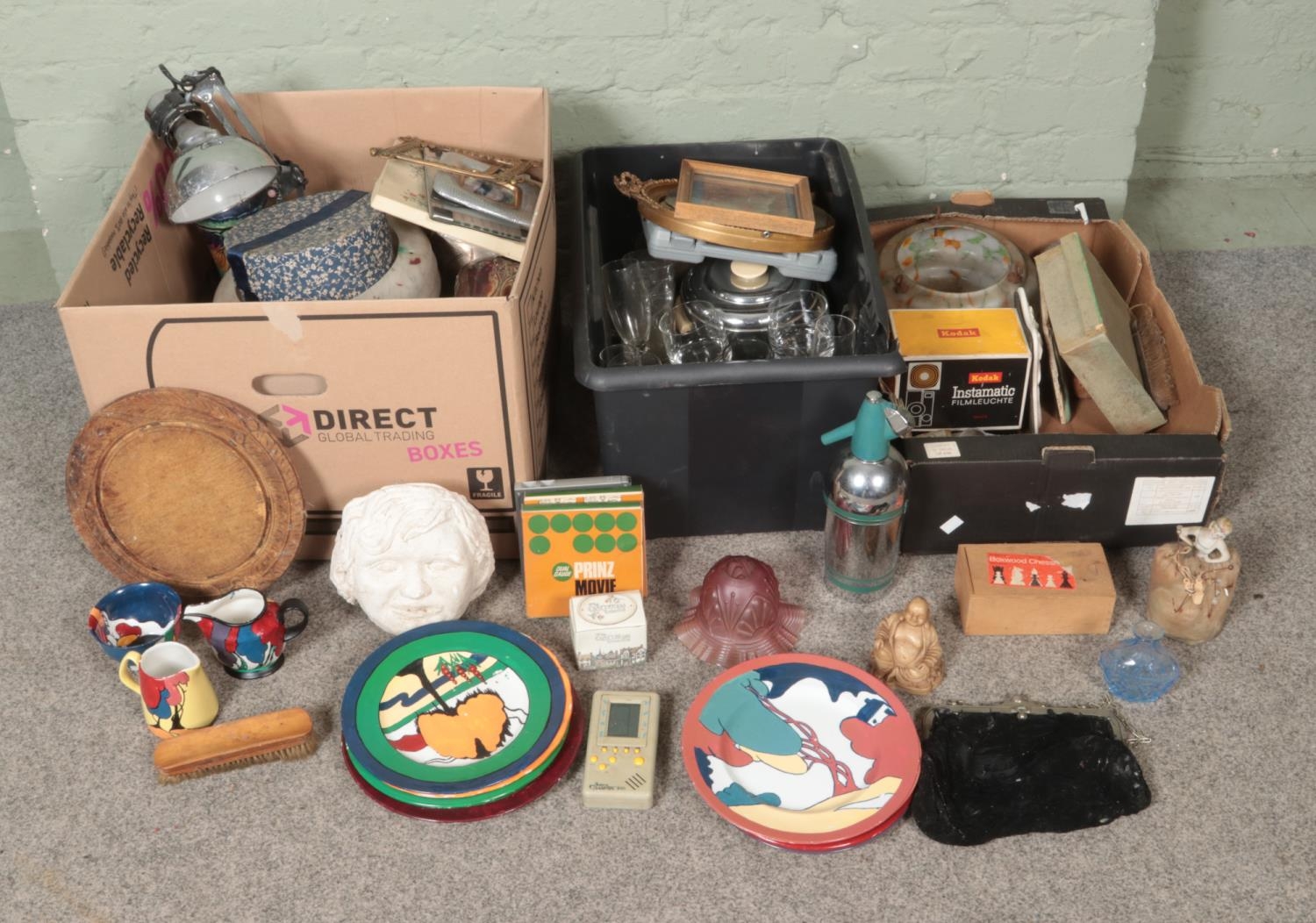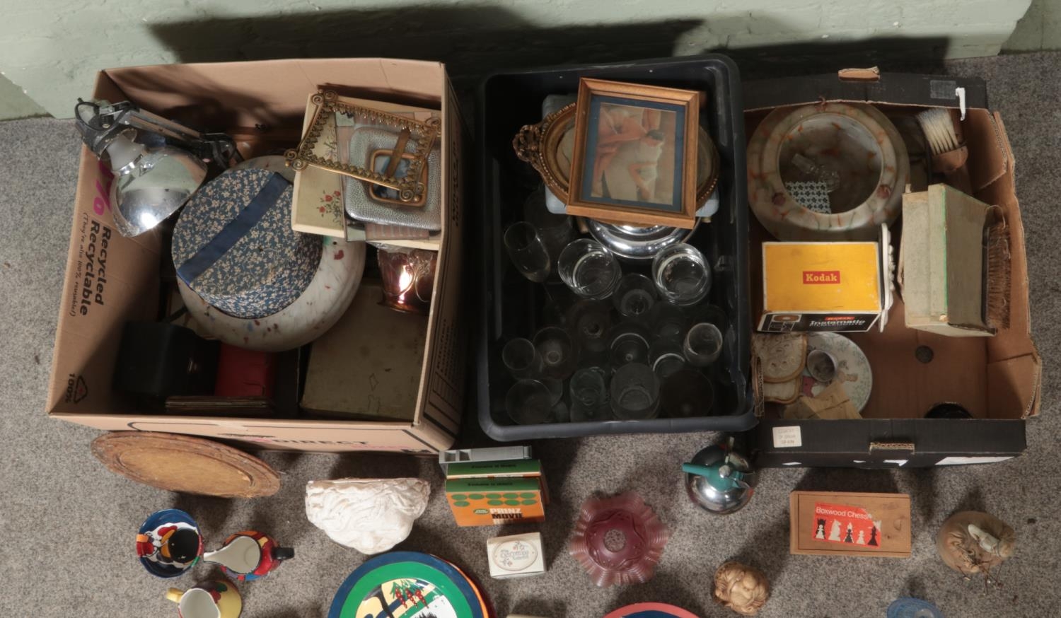Three boxes of miscellaneous to include art glass lampshades, Alfred Meakin, vintage purses, etc.