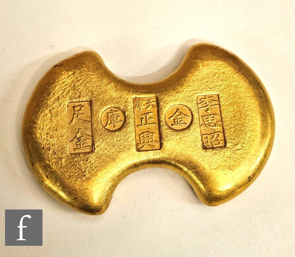 A Chinese gold coloured ingot/coin.NB - Tested not gold