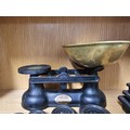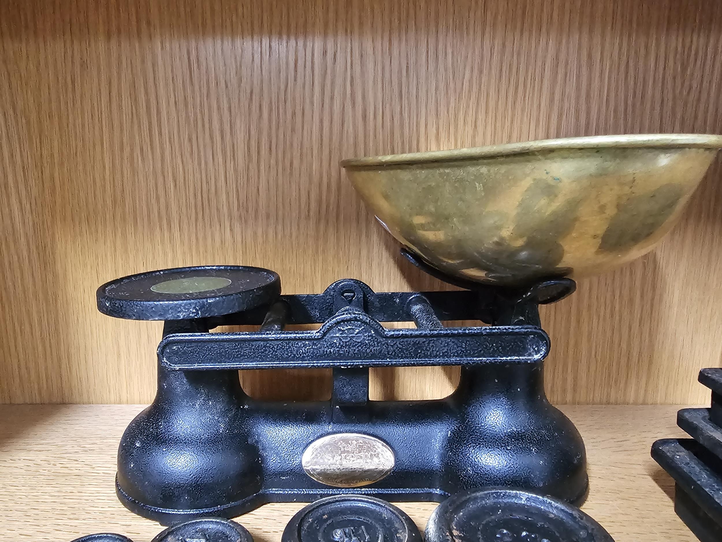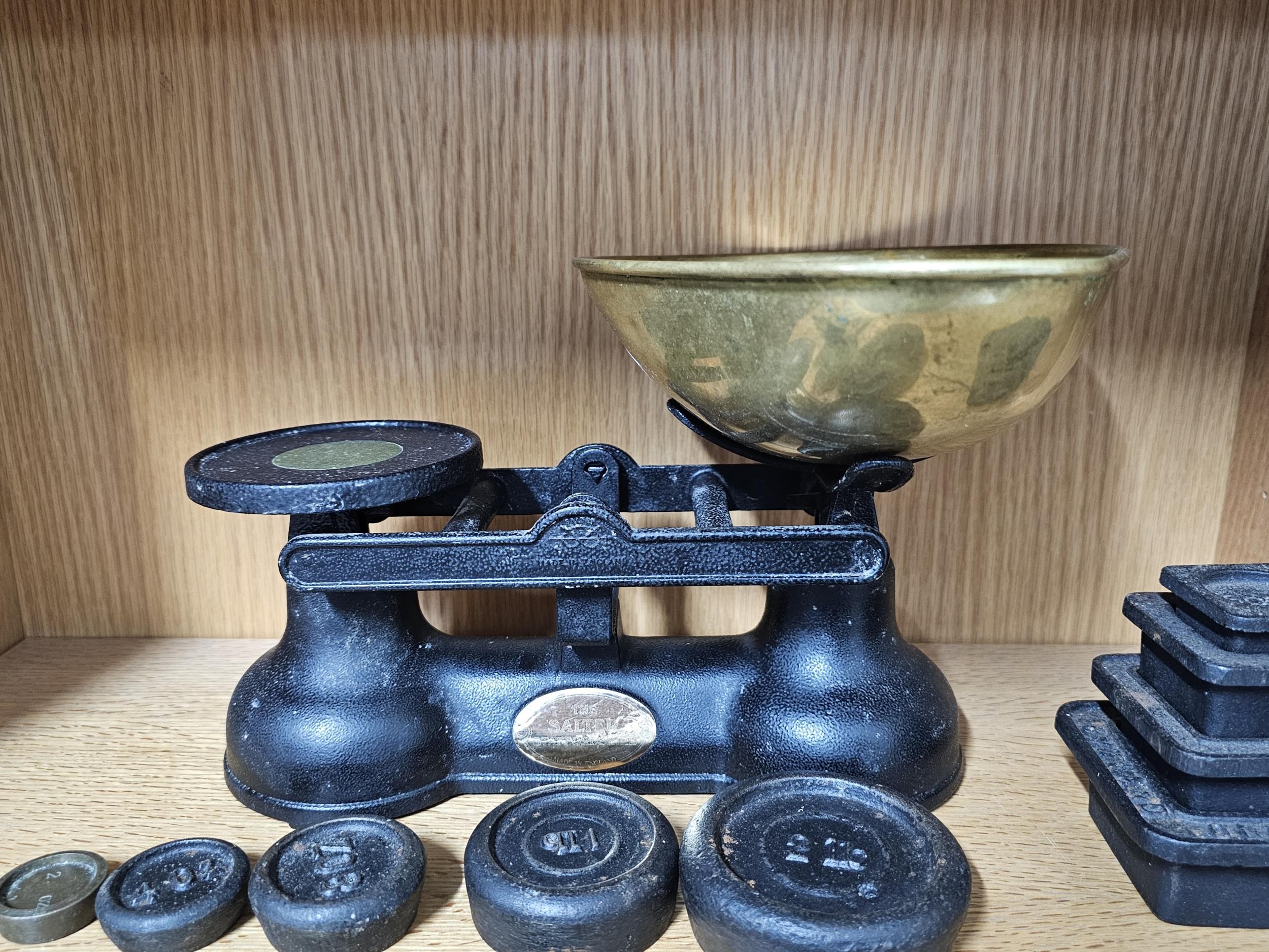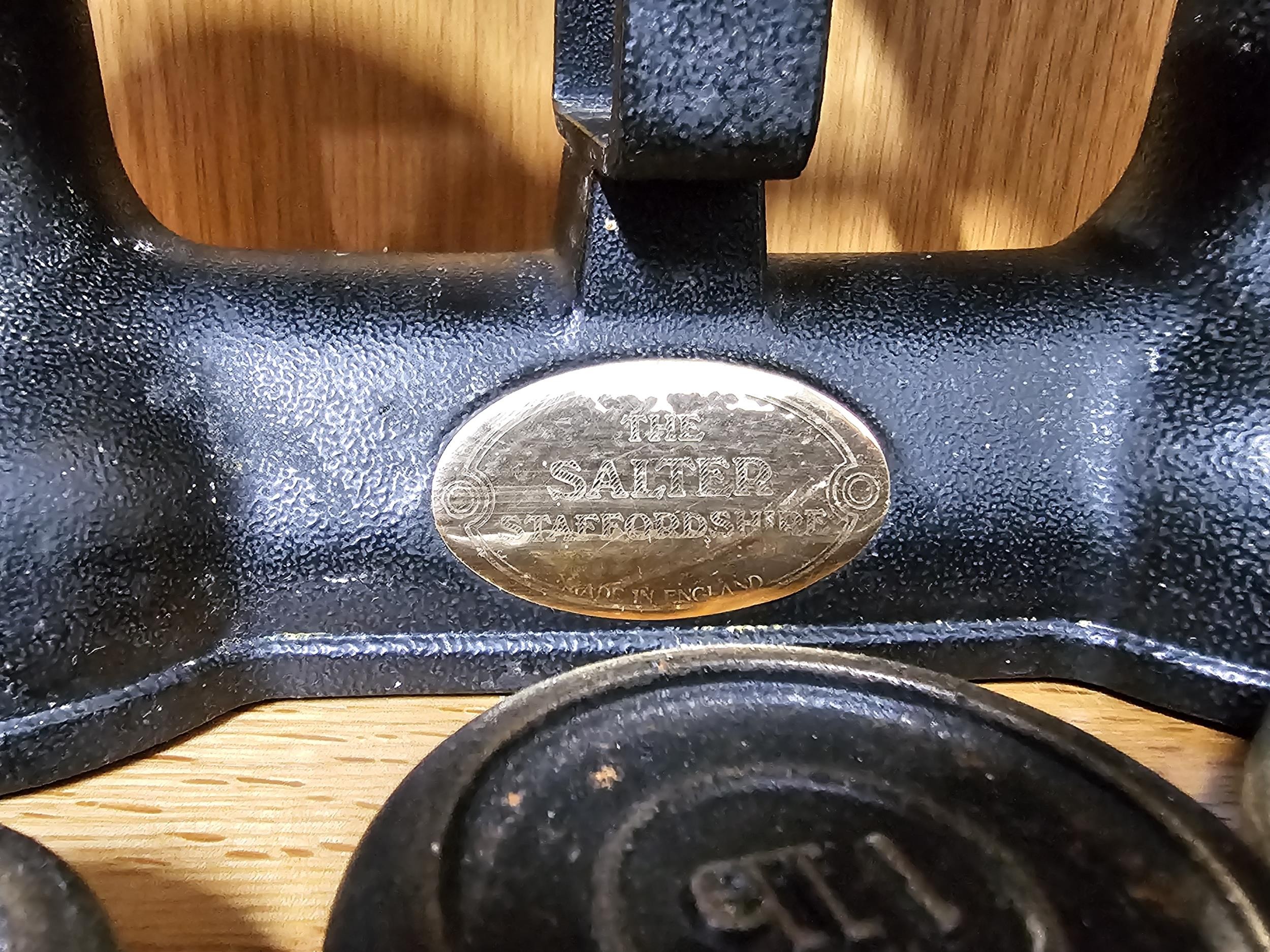 A good quality set of Salter scales to include a large quantity of assorted weights to include a set of square weights a set of cast iron weights and a set of brass weights