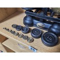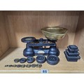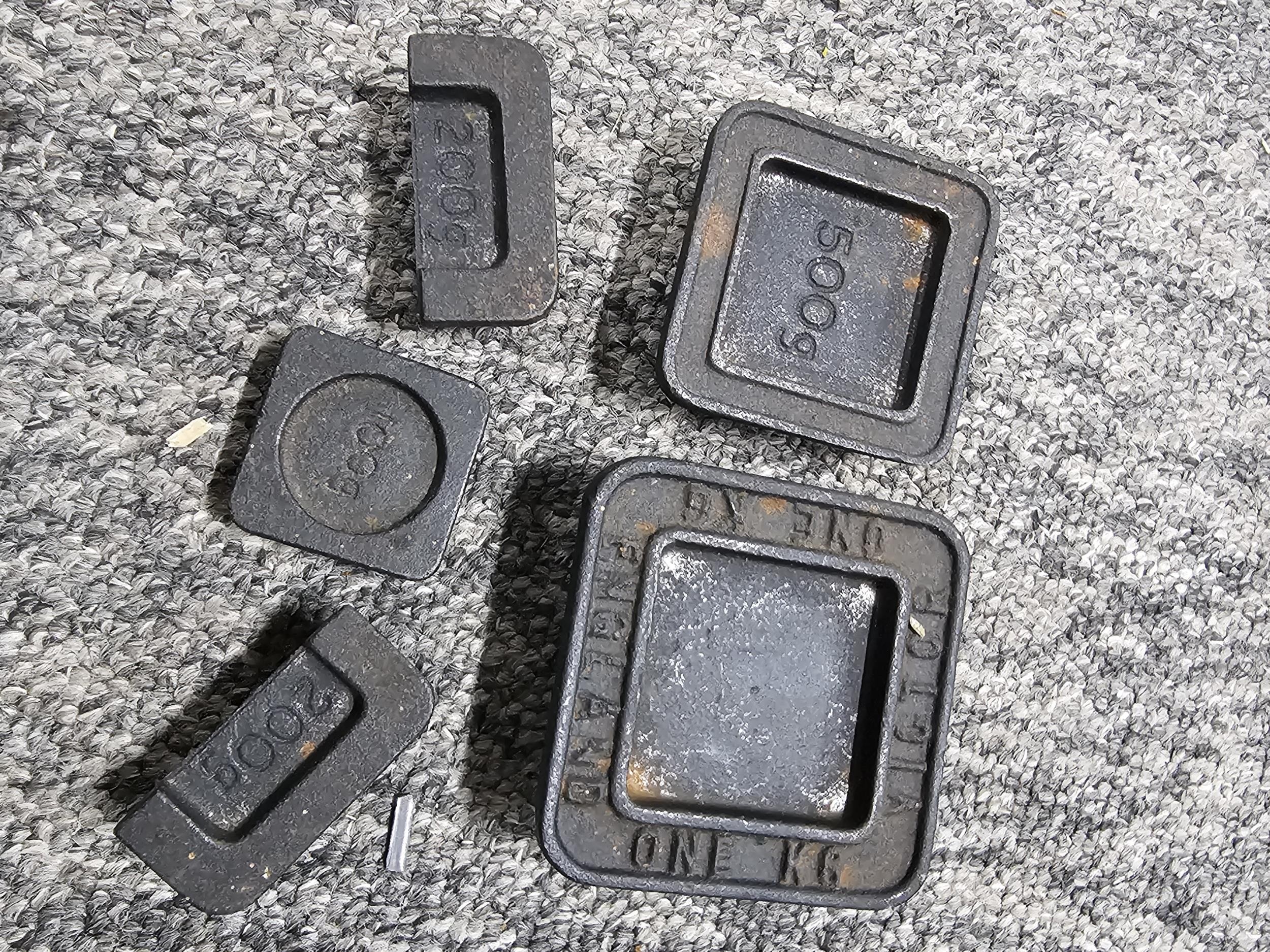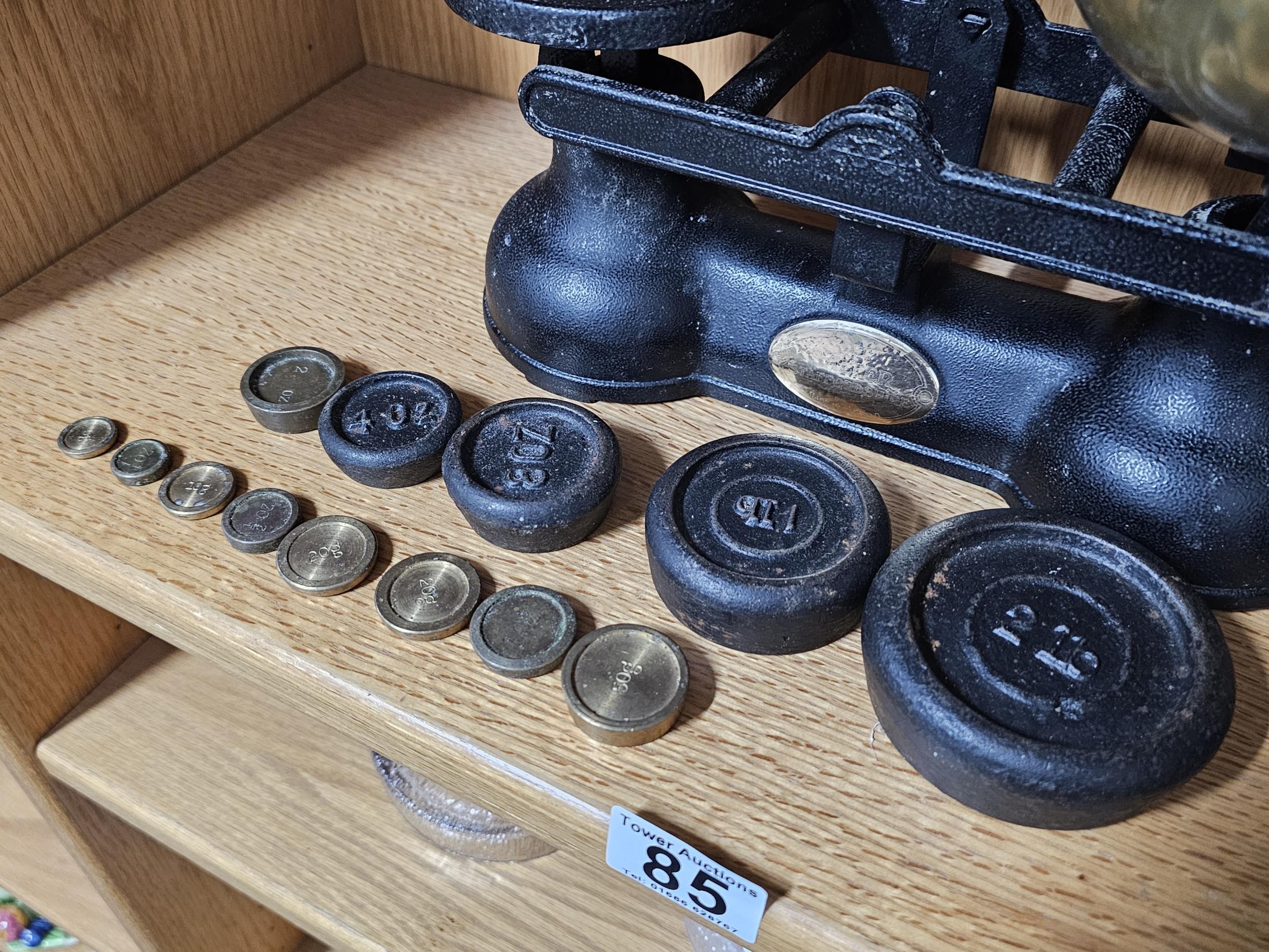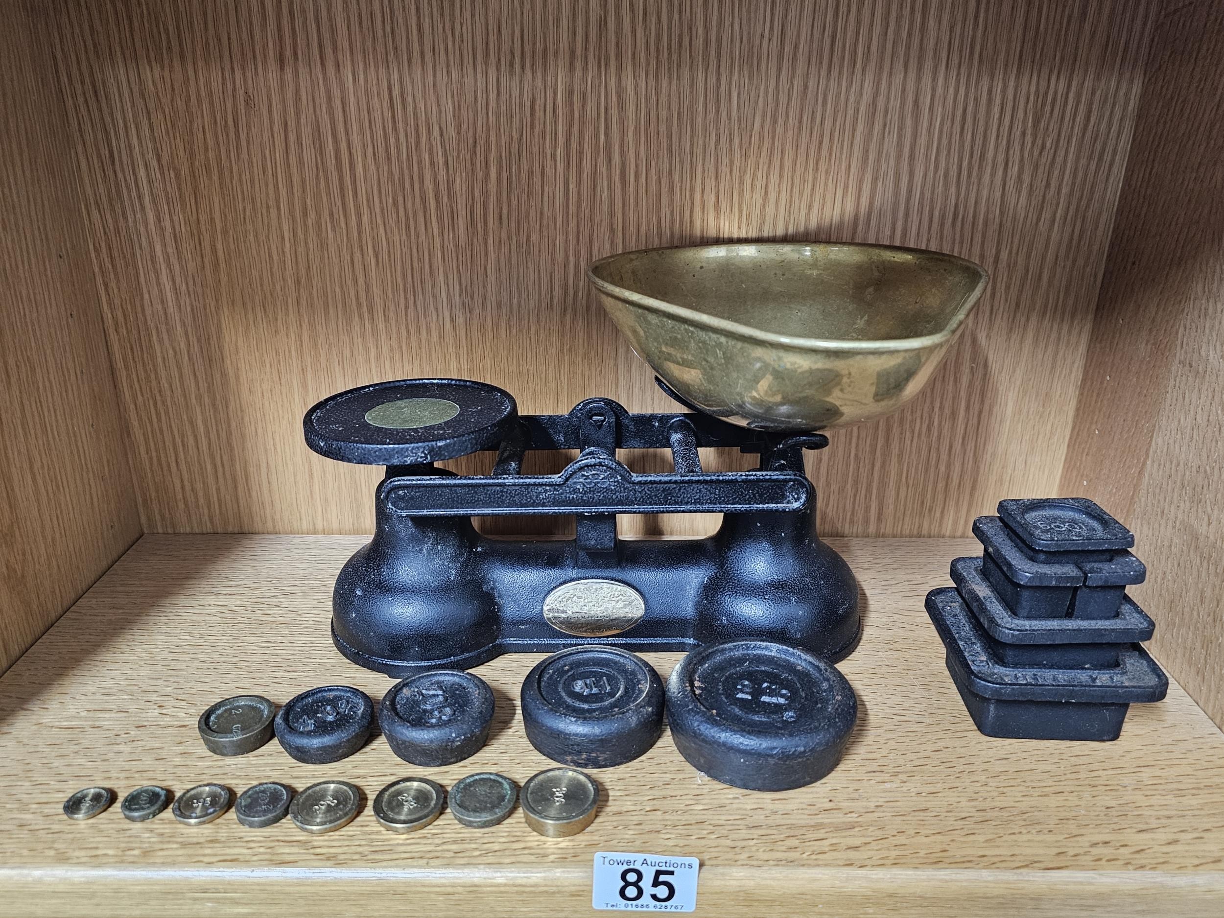 A good quality set of Salter scales to include a large quantity of assorted weights to include a set of square weights a set of cast iron weights and a set of brass weights