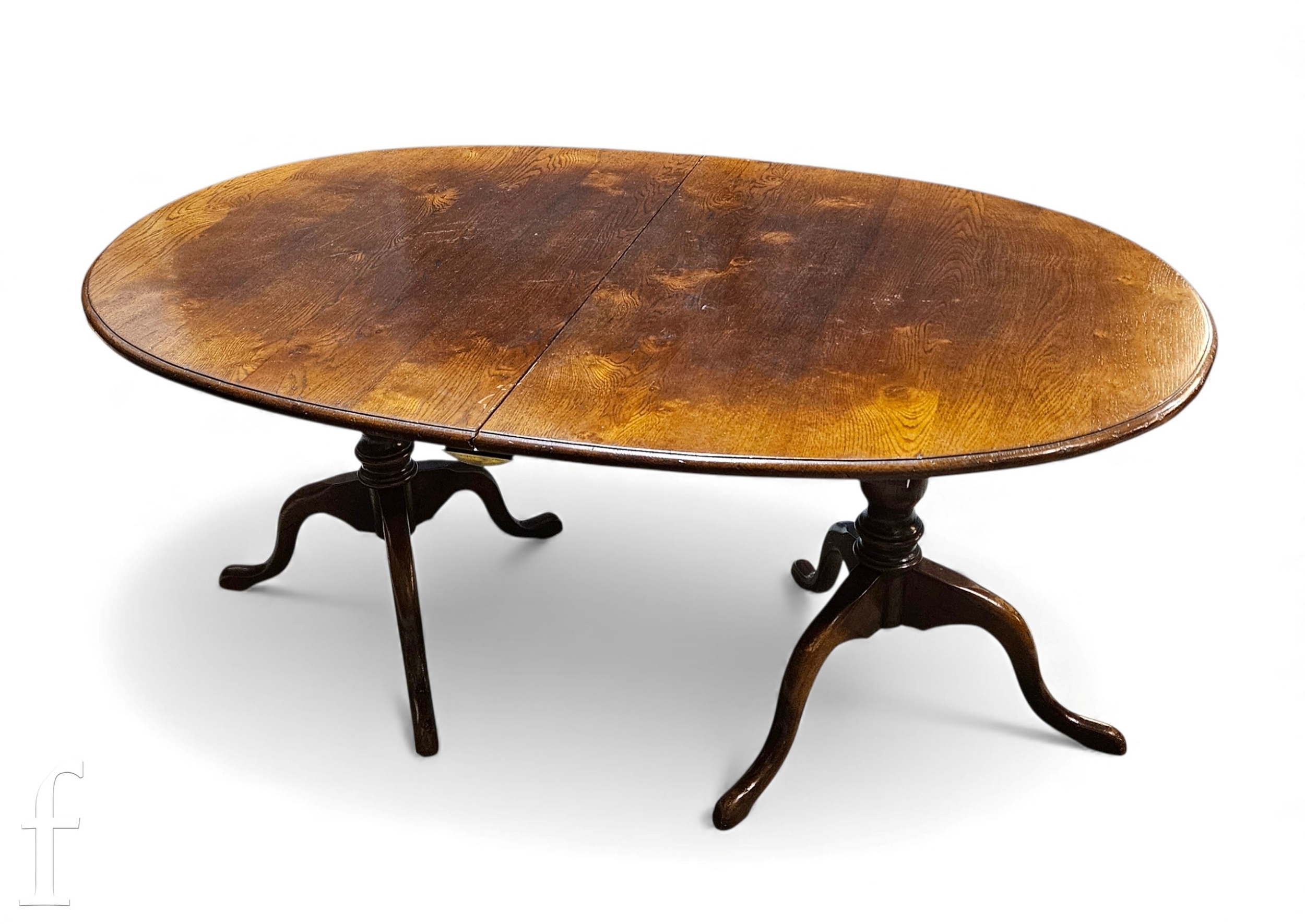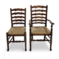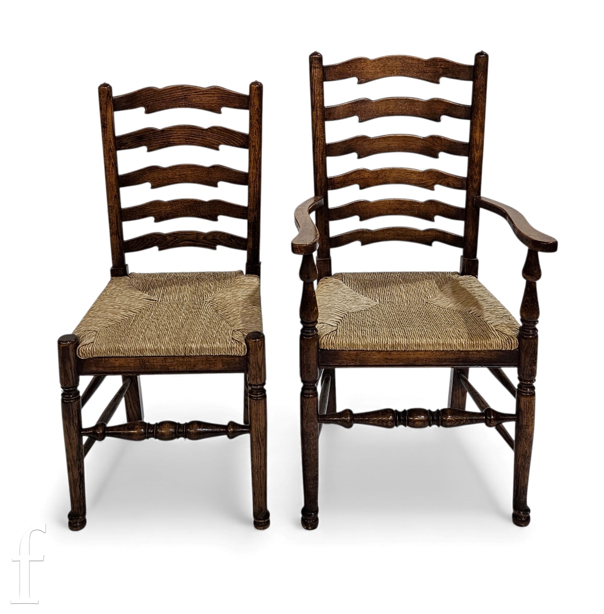 A late 20th Century reproduction oak twin pedestal dining table and eight chairs attributed to Titchmarsh & Goodwin, the oval table with two insert extension leaves above baluster turned pedestals with tripod bases, height 73cm and length 163cm, extending to 209cm and 255cm, the Lancashire style ladderback chairs comprising two carvers and six standard chairs with woven grass seats above stretcher frames, some damage and later repair.