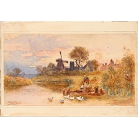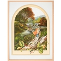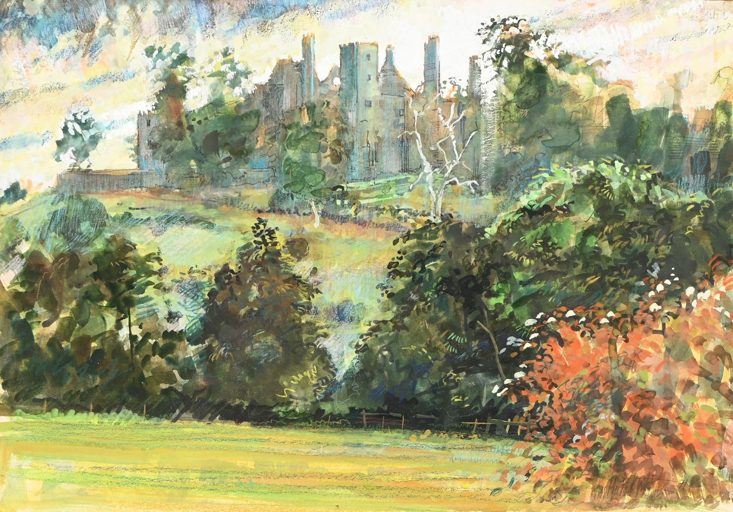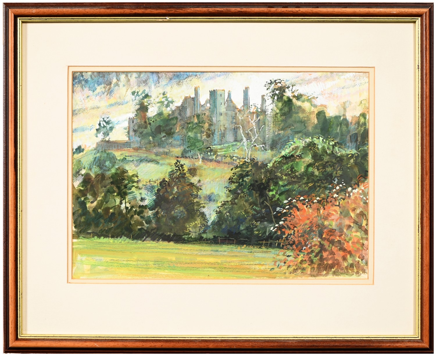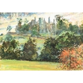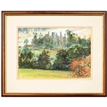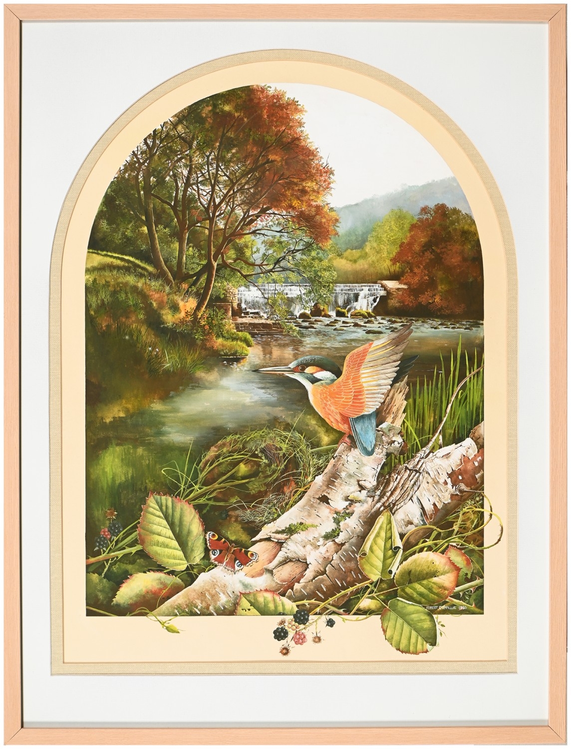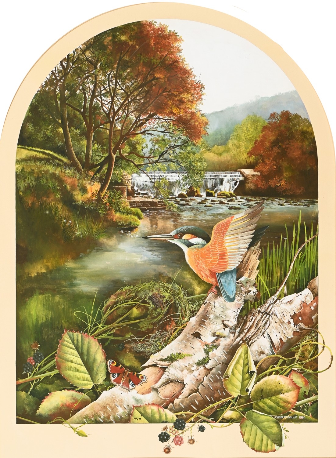 Robert Coppillie (b. 1951) - A Kingfisher and a Butterfly by a Woodland River, signed and dated 1980, watercolour and gouache, feigned arch, 67 x 49.5cm, and a contemporaneous view of South Wingfield Manor, Derbyshire, in the manner of John Piper, indistinctly signed *** Michael W**s and dated 91 in pencil, mixed media on paper, 26 x 38cm, (2)