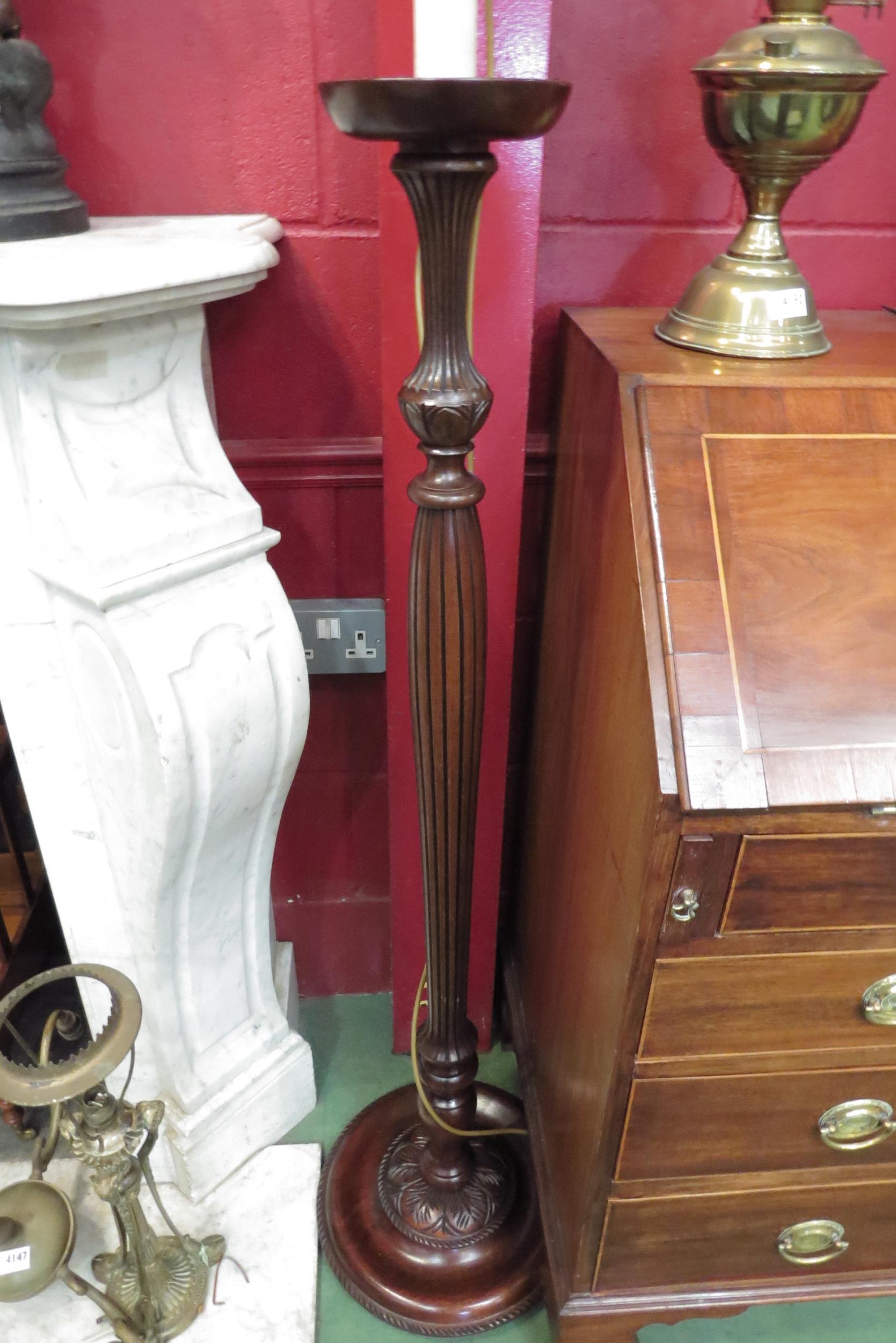 A Georgian style mahogany lamp standard with turned and reeded/carved decoration on a circular base