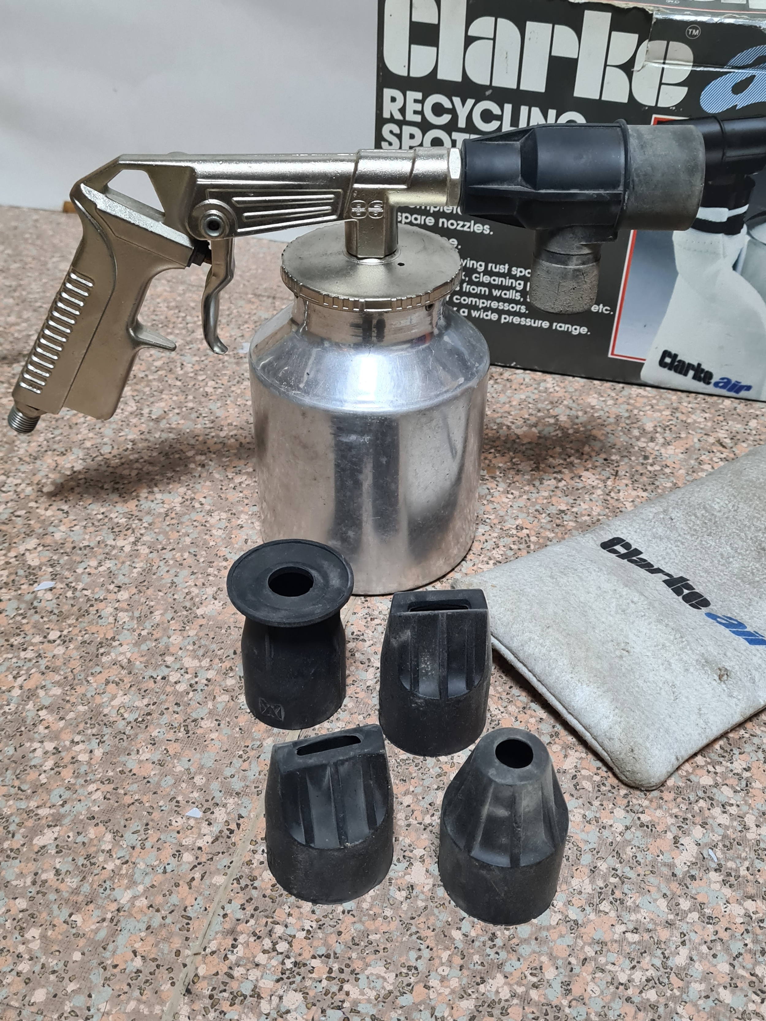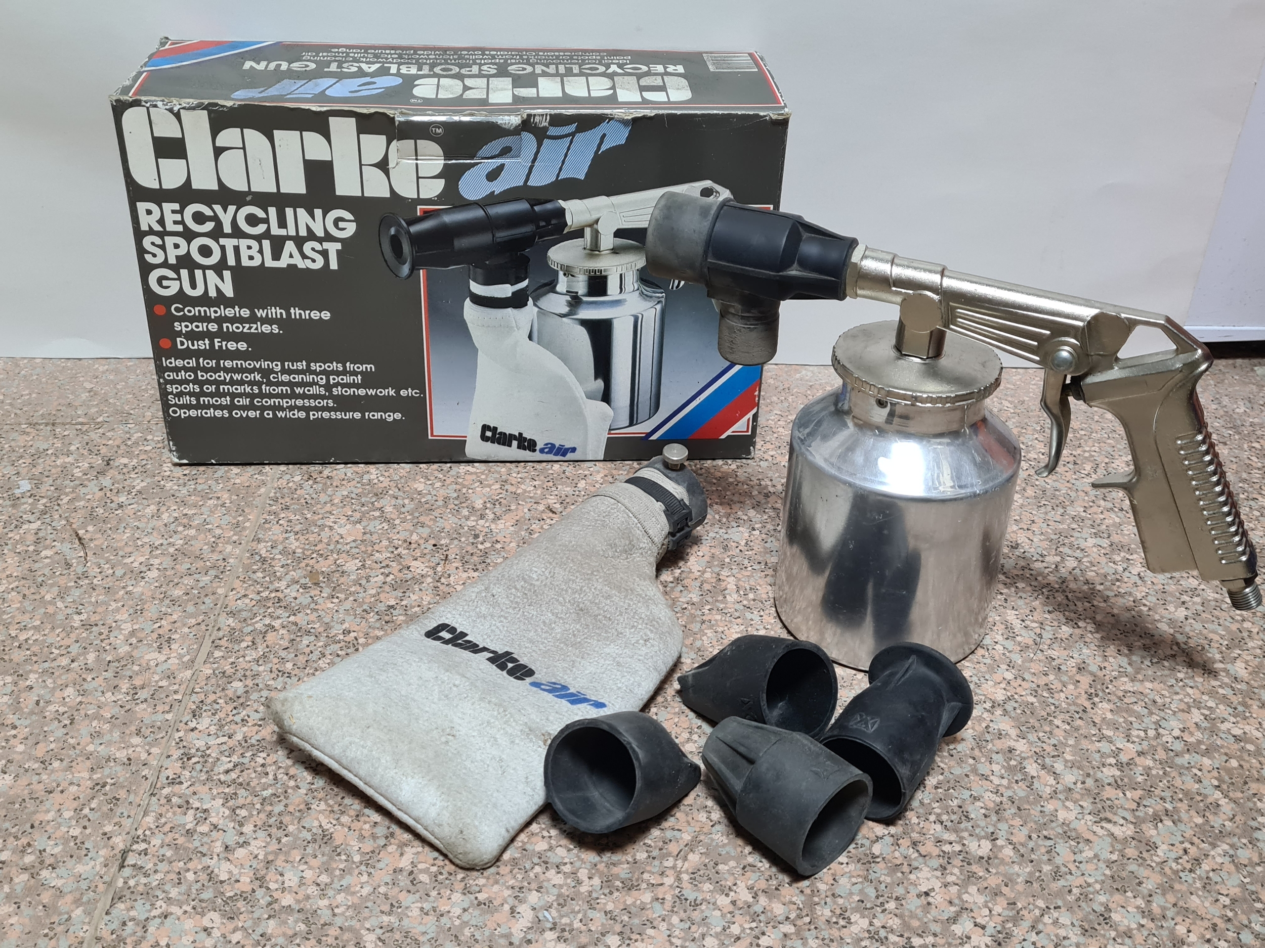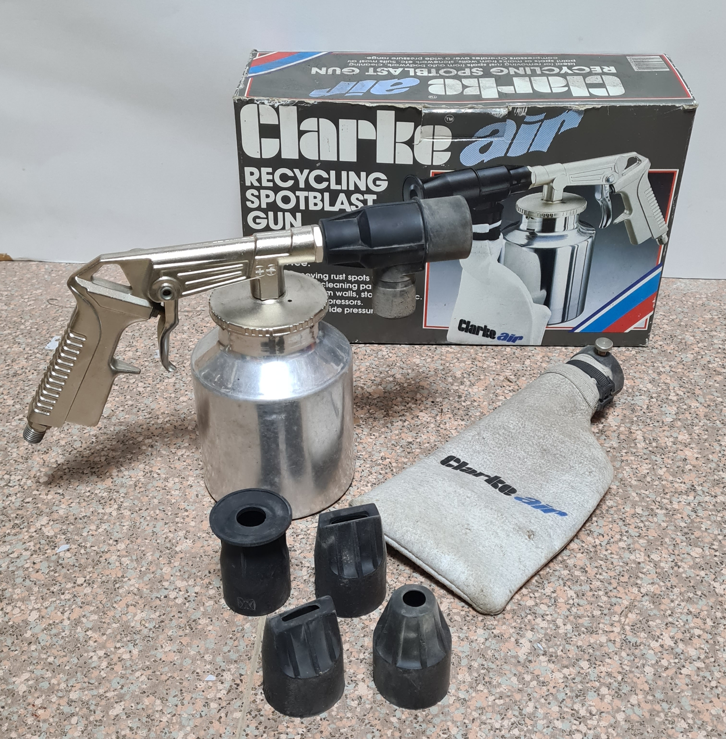 A Clarke Air Recycling Spotblast Gun for removing rust spots, comes with 3 nozzles. Model no SB2