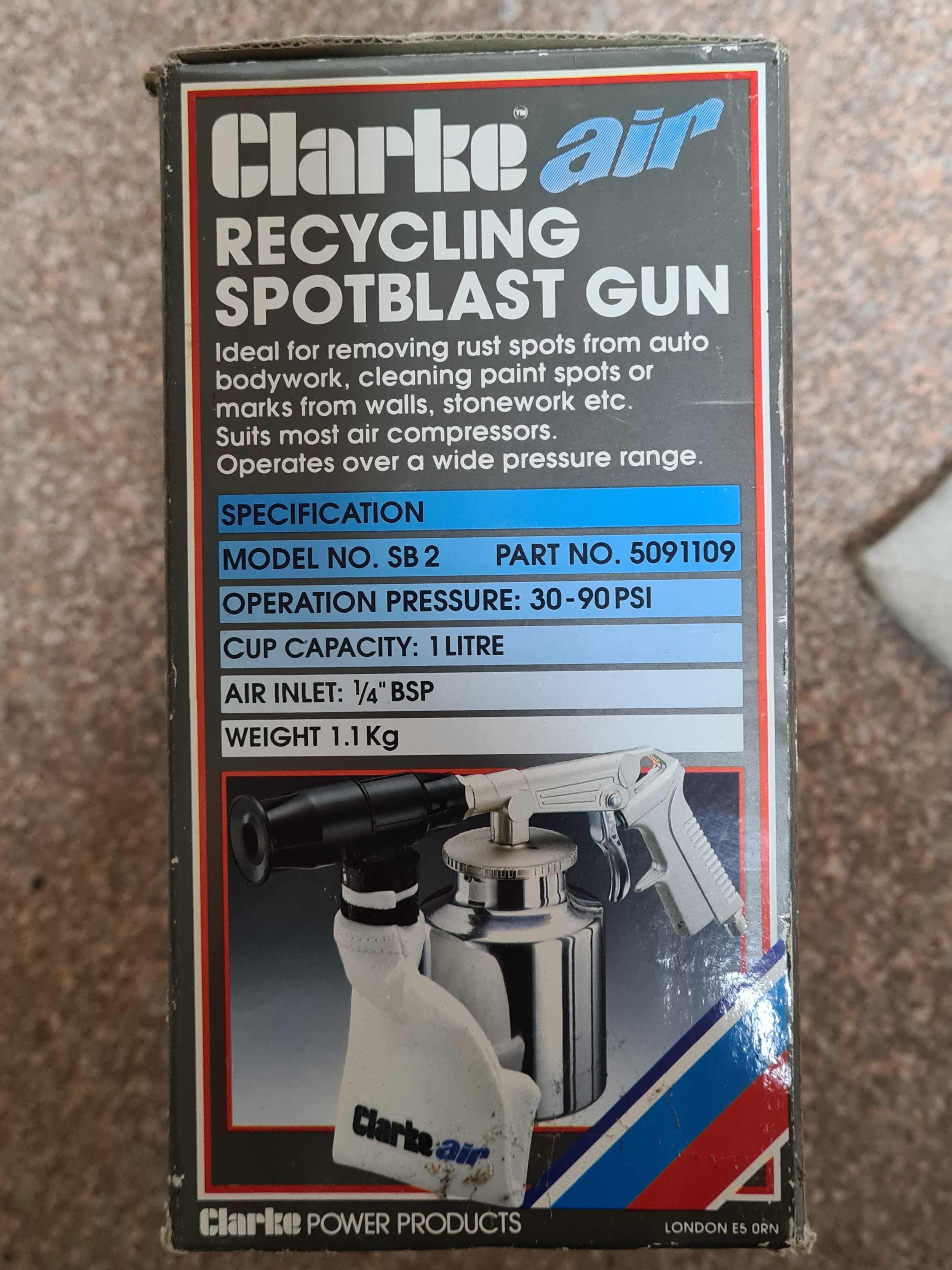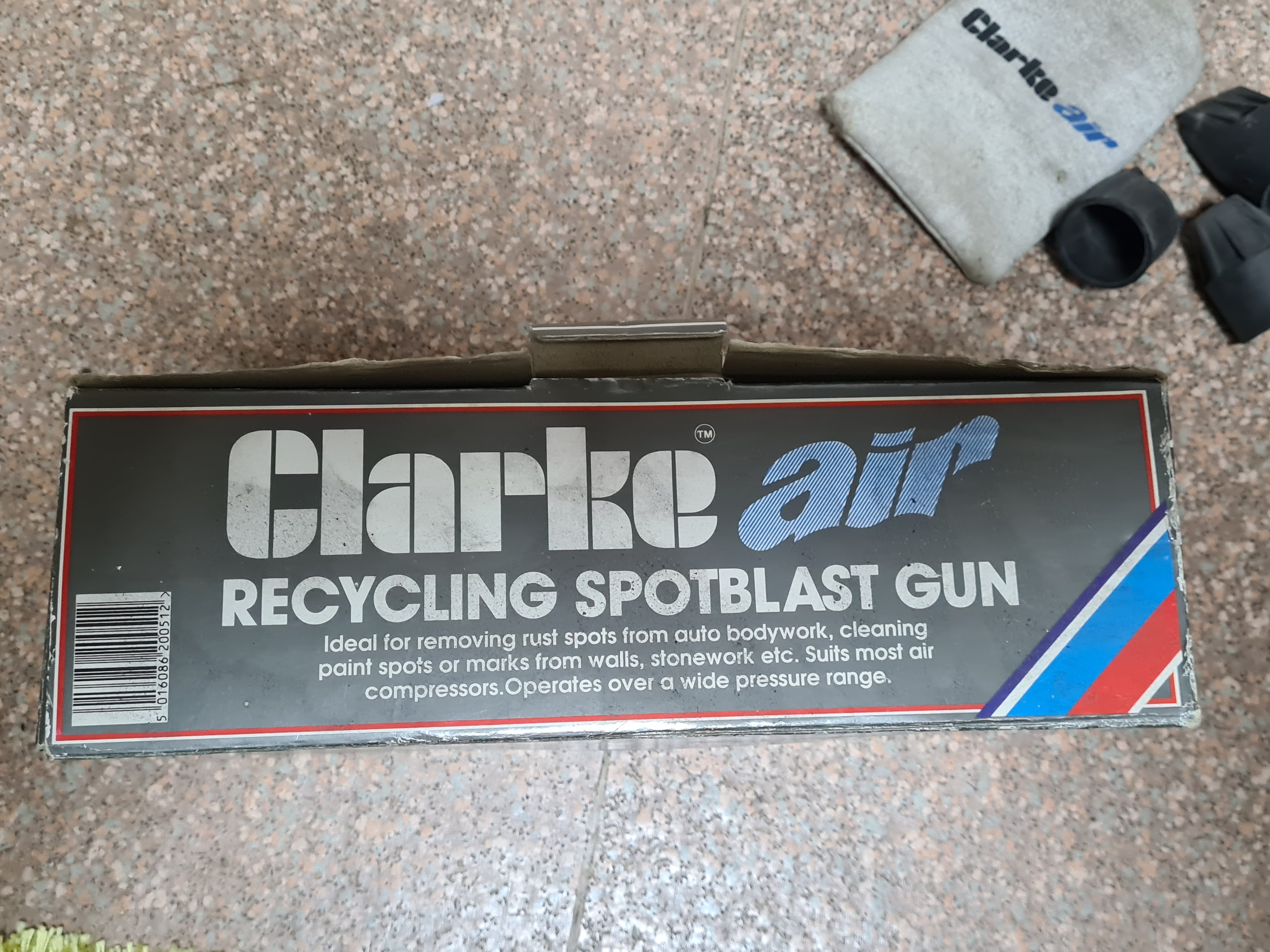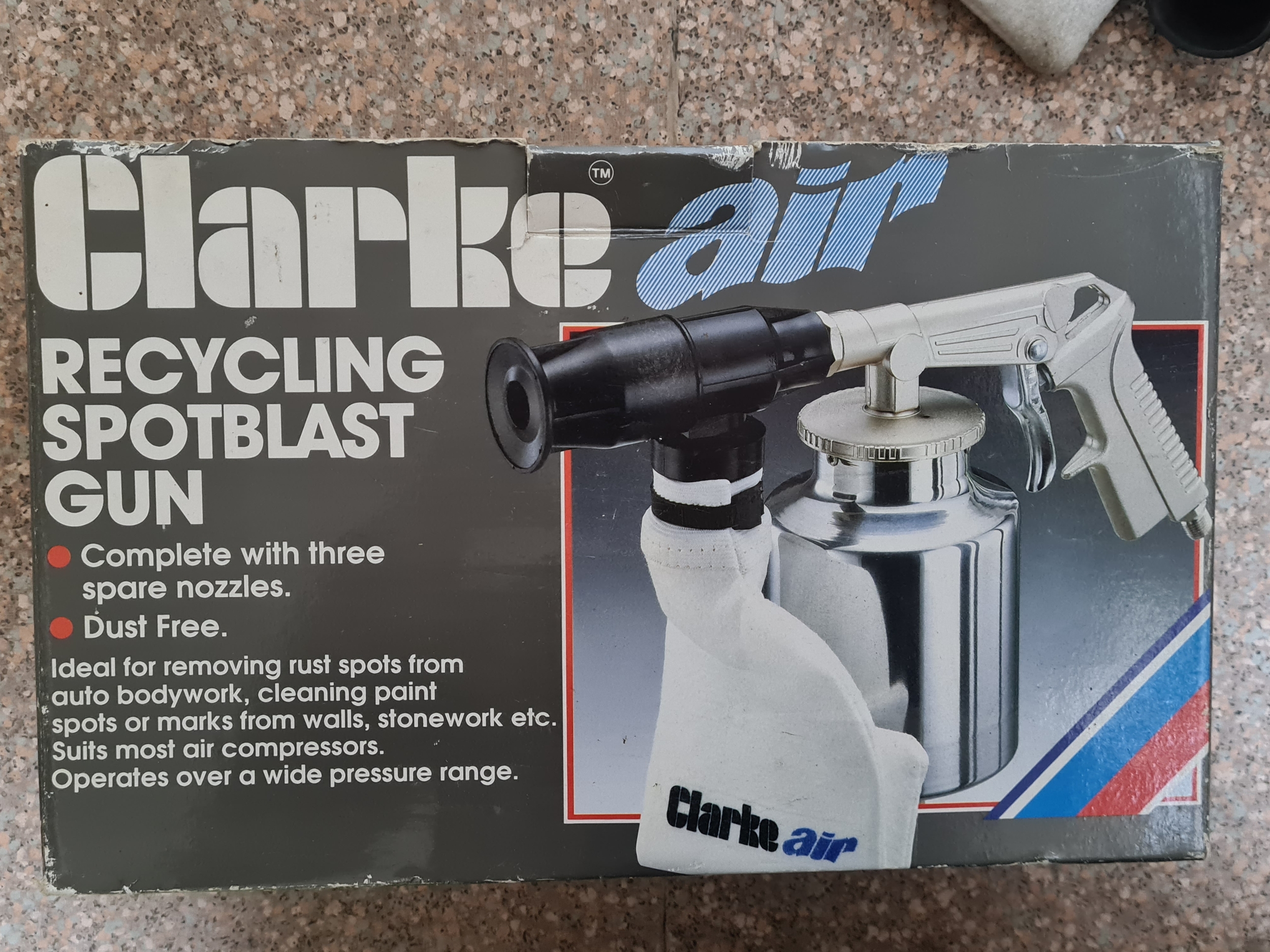 A Clarke Air Recycling Spotblast Gun for removing rust spots, comes with 3 nozzles. Model no SB2