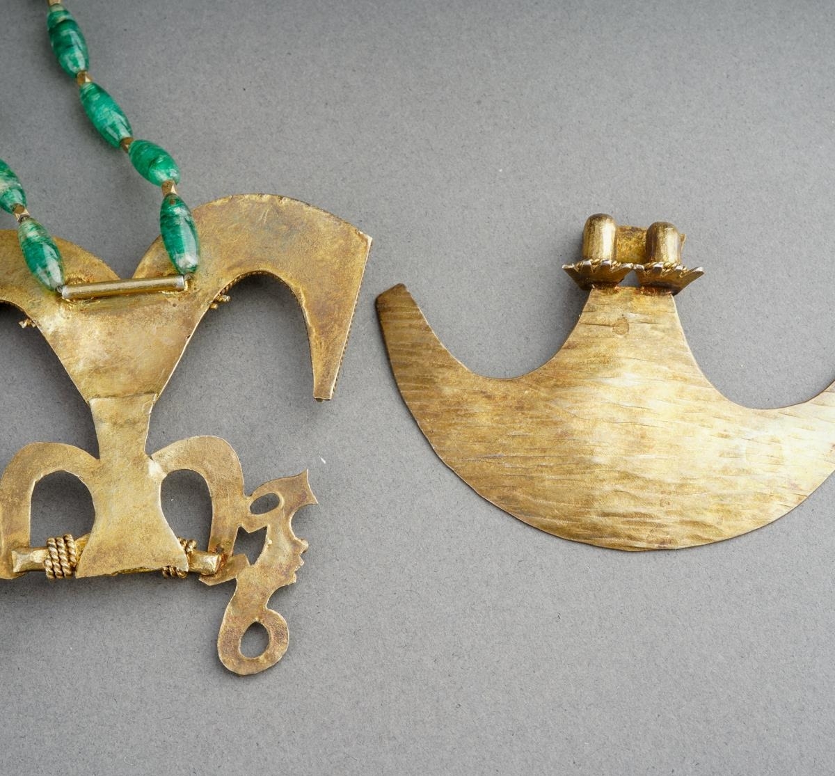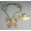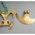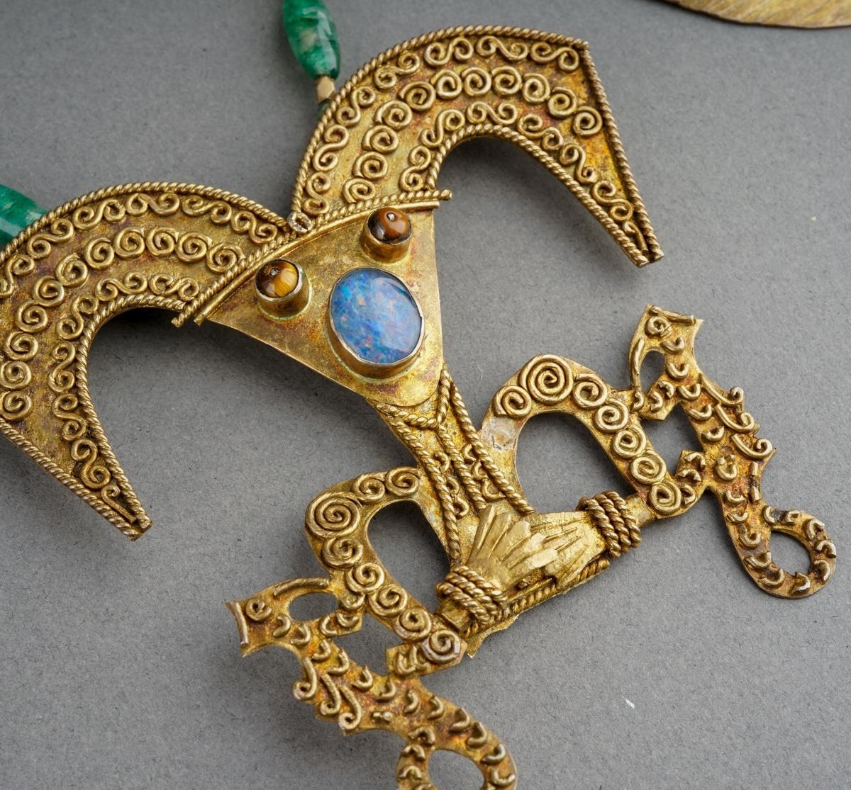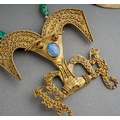 A Balinese turban ornament. A Balinese turban, late adapted into a necklace, the broken panel set with an opal triplet cabochon and tiger's eye eye accents, (af), approx length necklace 510mm.