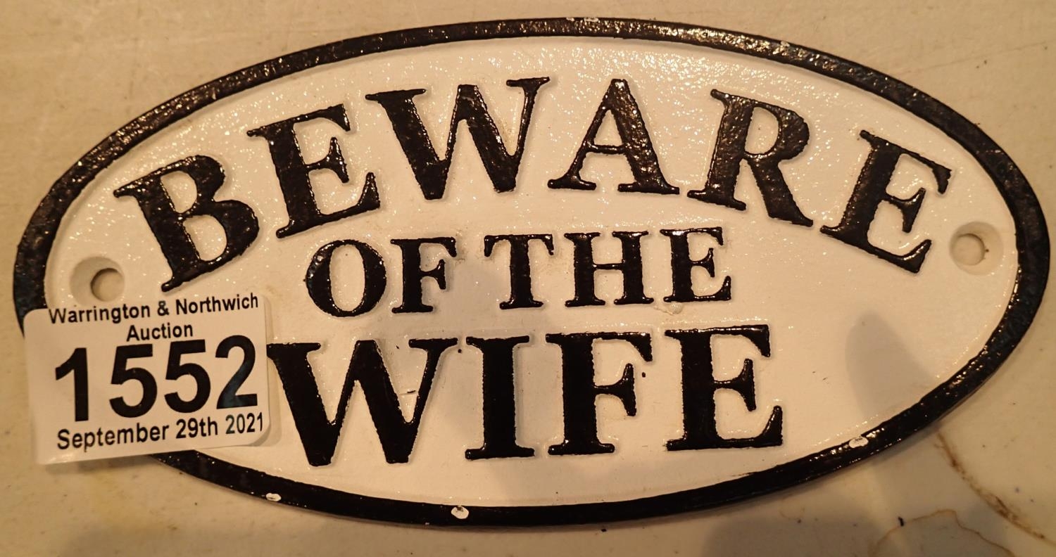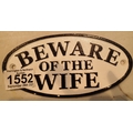 Cast iron Beware Of The Wife sign, L: 17.5 cm. P&P Group 1 (£14+VAT for the first lot and £1+VAT for subsequent lots)