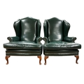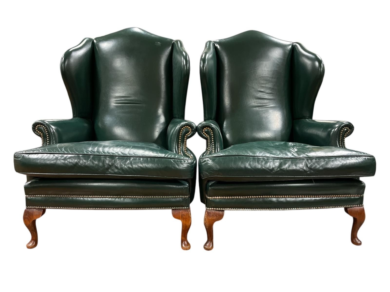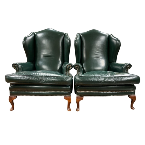 A PAIR OF GEORGIAN STYLE MAHOGANY AND HIDE UPHOLSTERED WING CHAIRS with scroll over arms and loose cushions on cabriole legs with pad feet