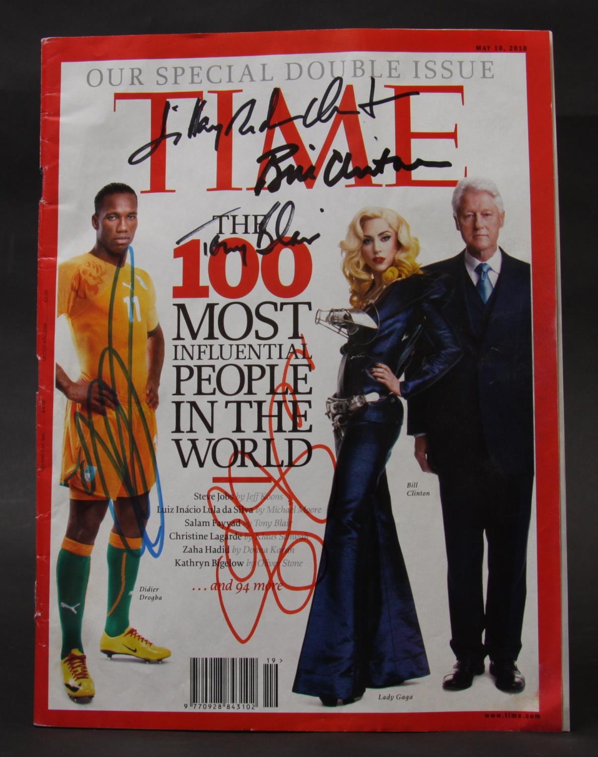 Autographs, Time Magazine May 2010, 100 most influential people in the world issue, bearing signatures to front, Hillary Rodham CLINTON, Bill CLINTON, Didier DROGBA and Lady GAGA, Bill CLINTON also signed inside on full size picture, other signatures including Sarah PALIN, Mitt ROMNEY and Elton JOHN