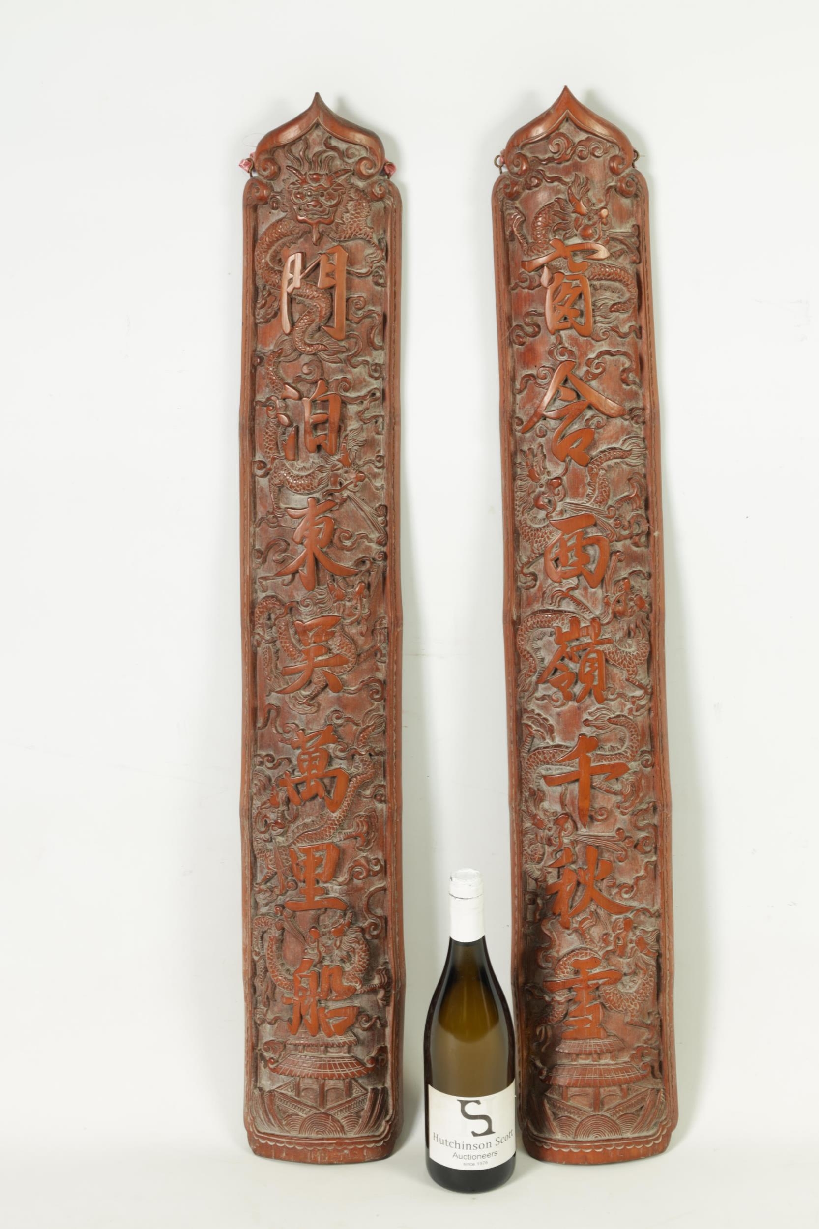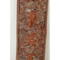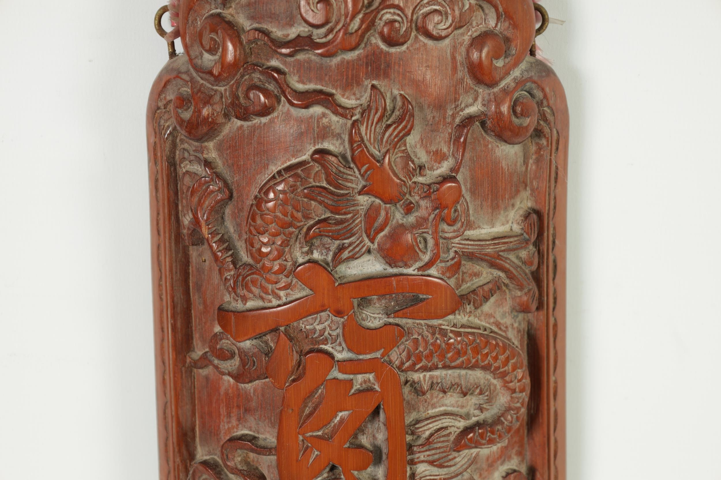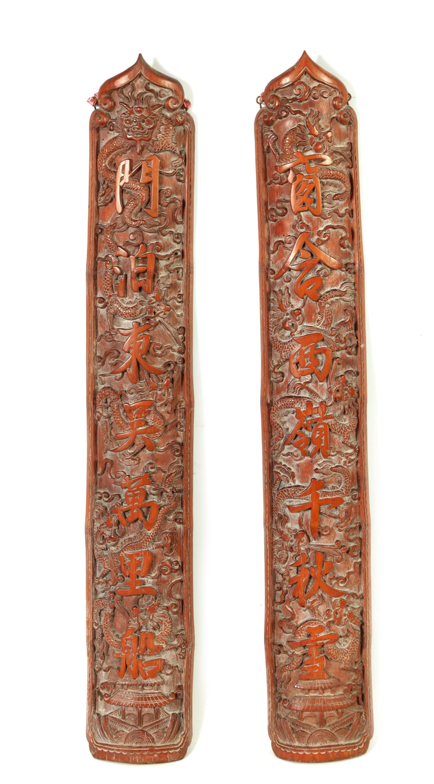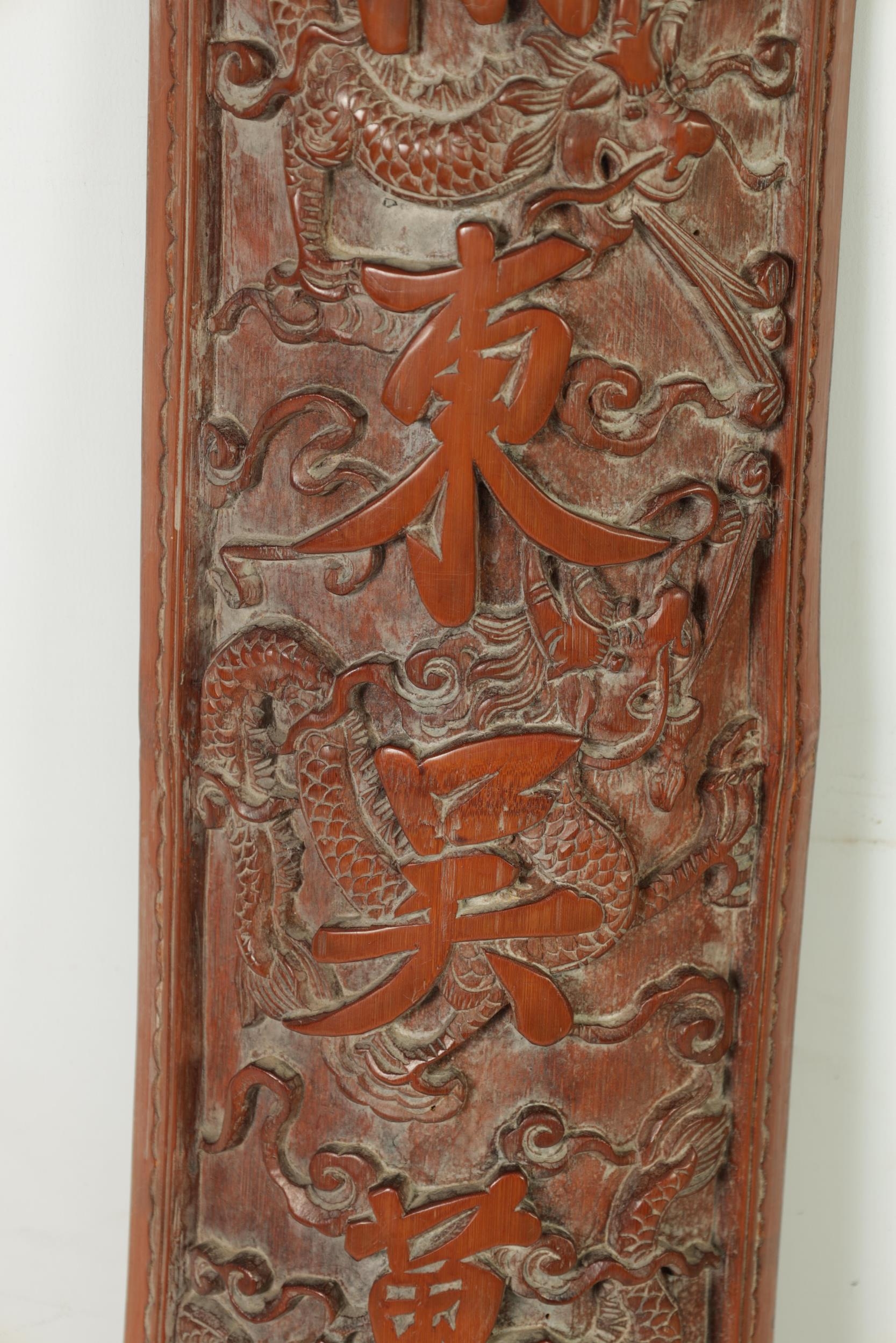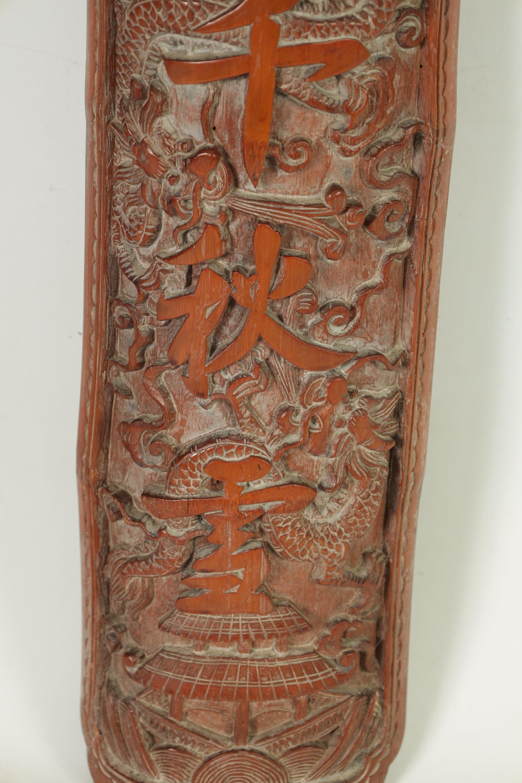 A PAIR OF 19TH CENTURY CHINESE CARVED BAMBOO WALL PLAQUES with character marks and entwined dragons. (95cm overall)