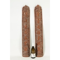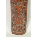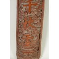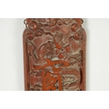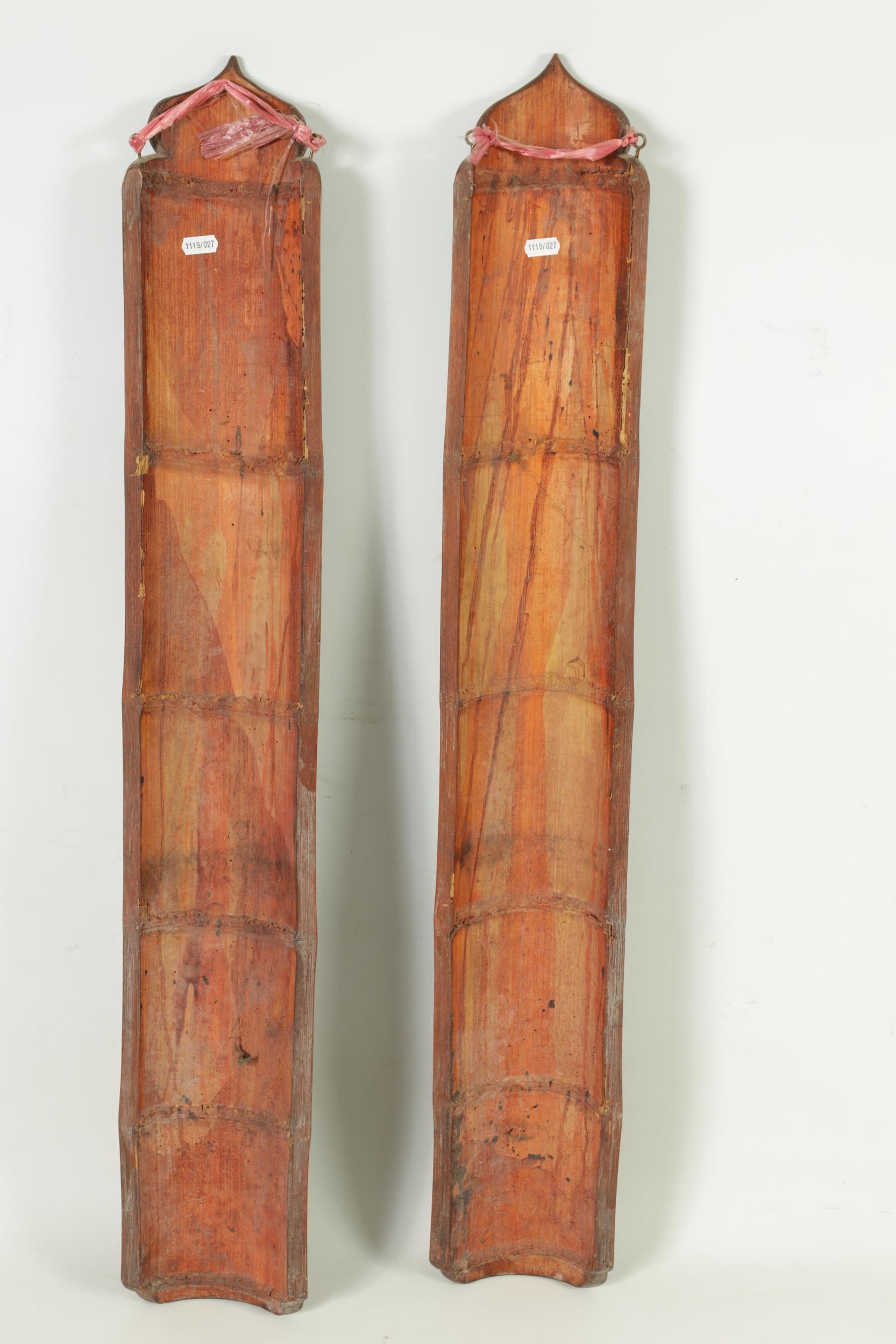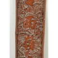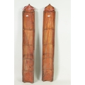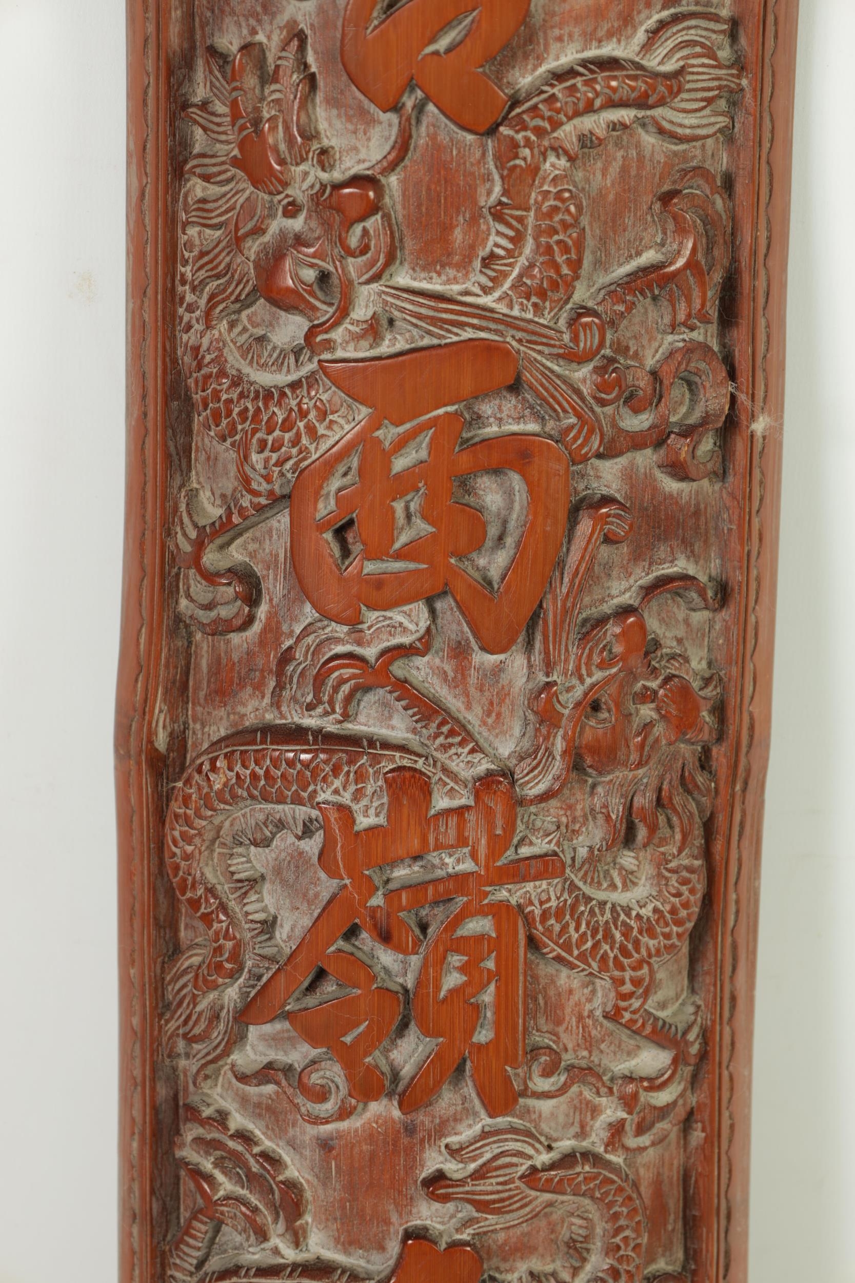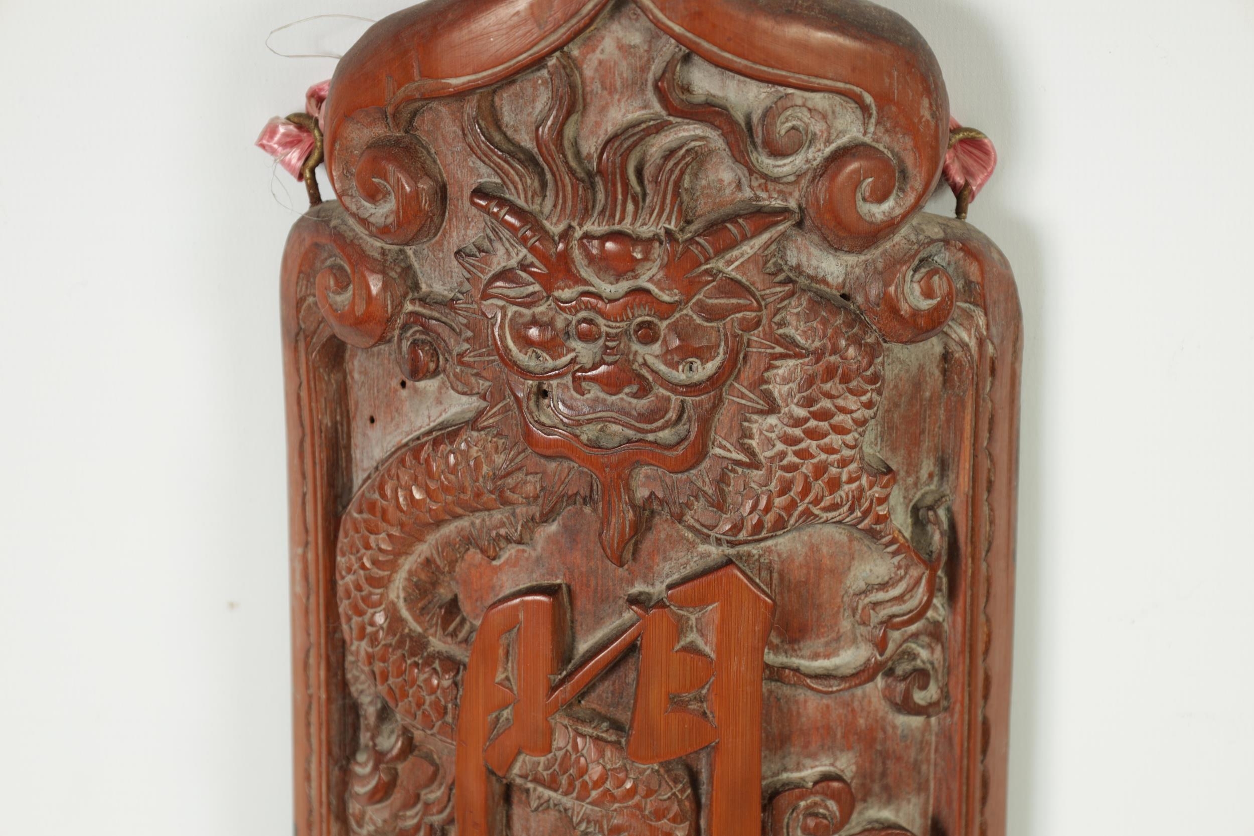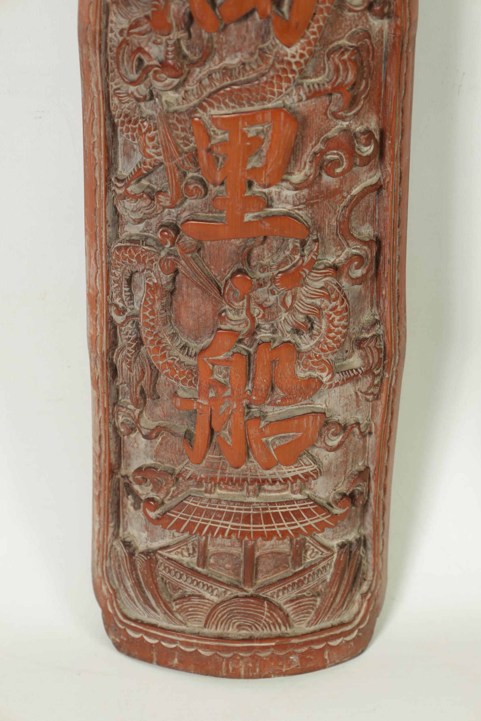 A PAIR OF 19TH CENTURY CHINESE CARVED BAMBOO WALL PLAQUES with character marks and entwined dragons. (95cm overall)