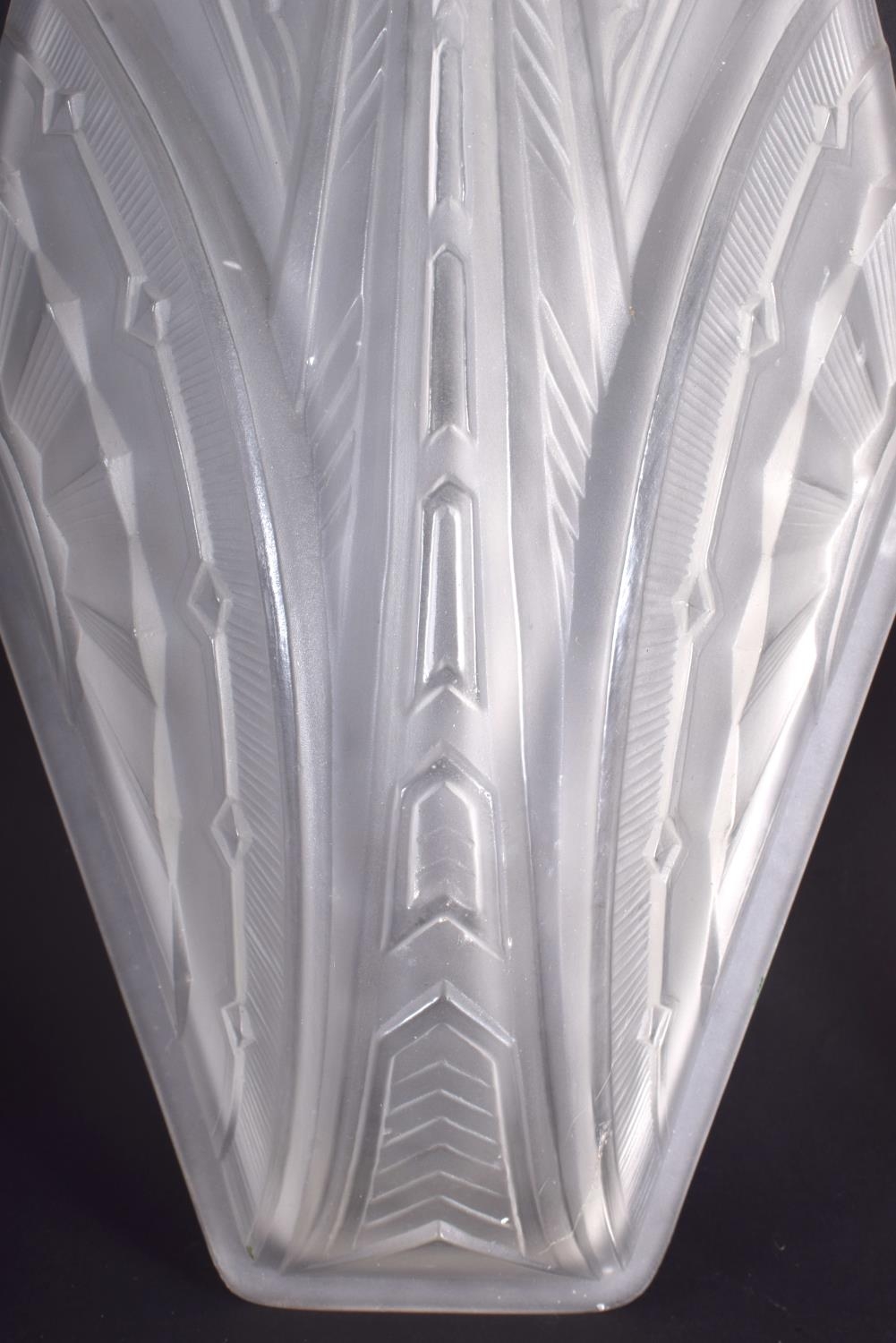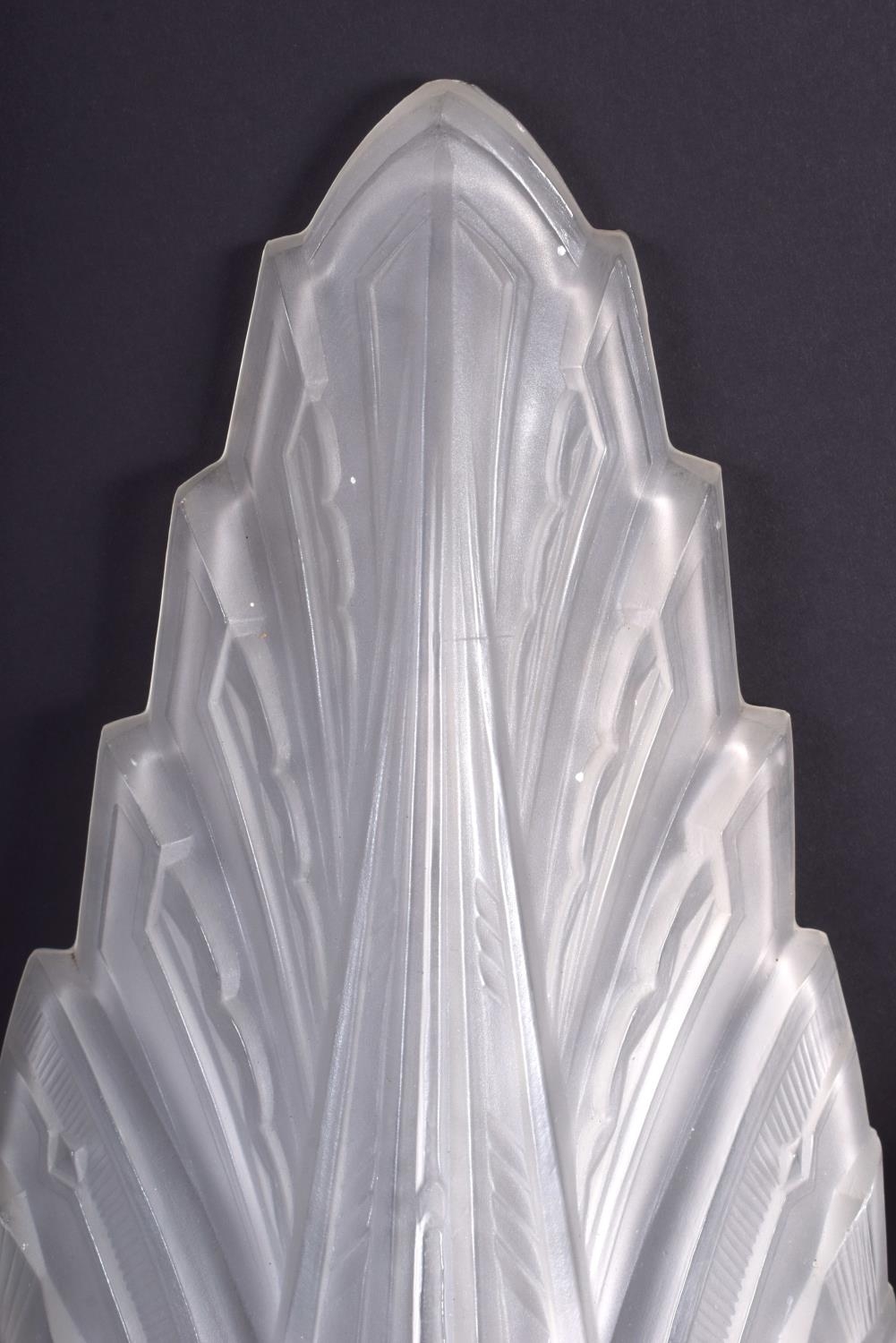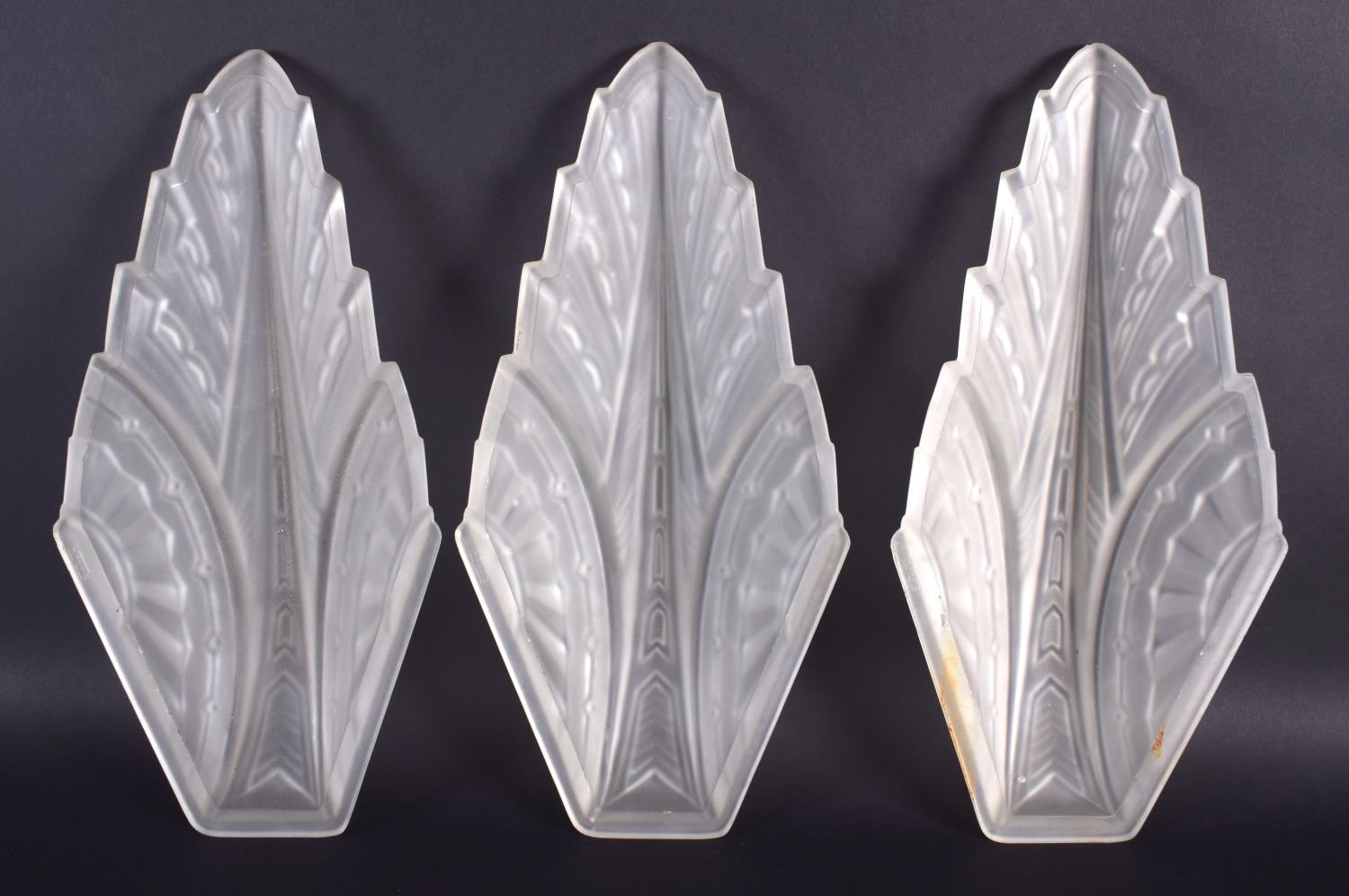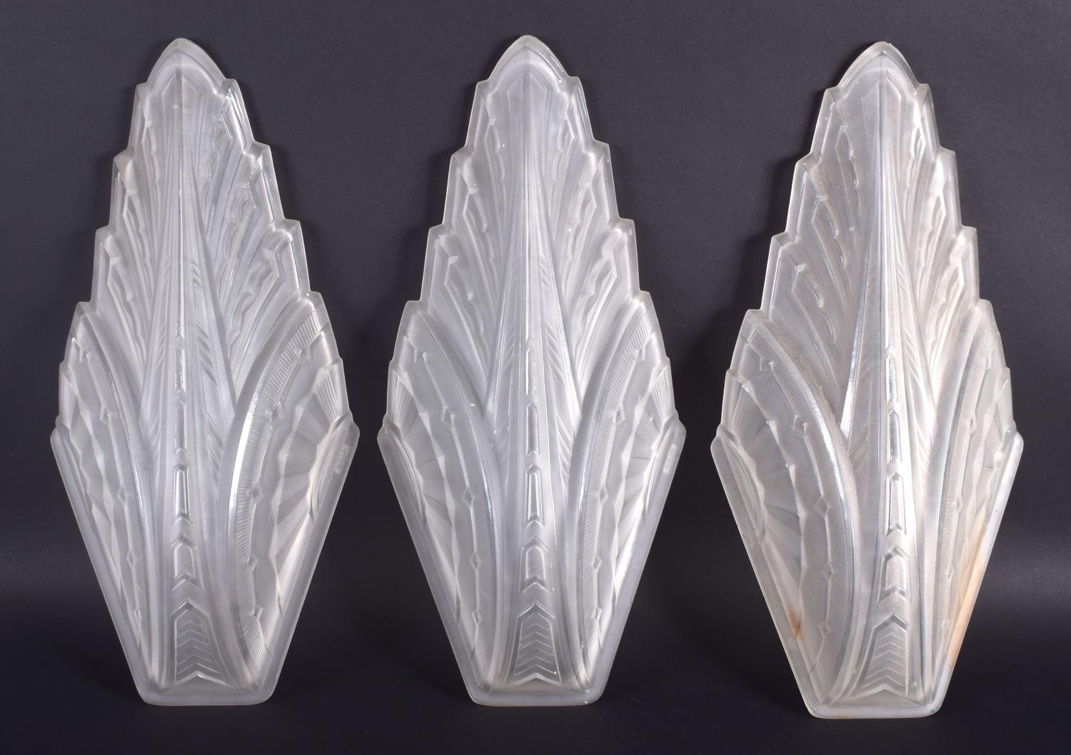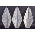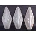 A STYLISH SET OF THREE ART DECO GLASS WALL PLAQUE by Verrerie Des Hanots, of highly stylised form. 40 cm x 15 cm. (3)