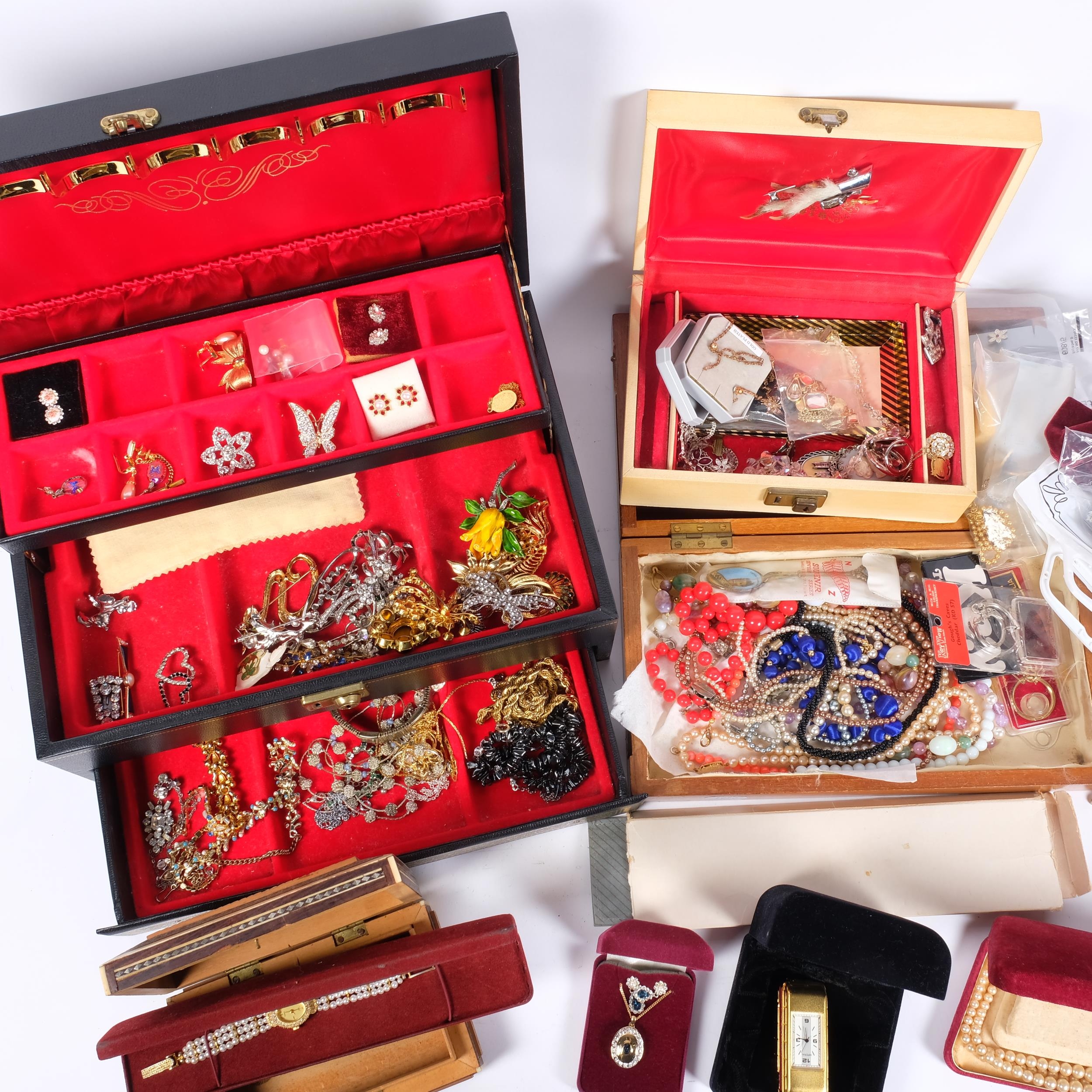 A large quantity of mixed costume jewellery, including a cantilever jewel box, 3 other boxes, etc