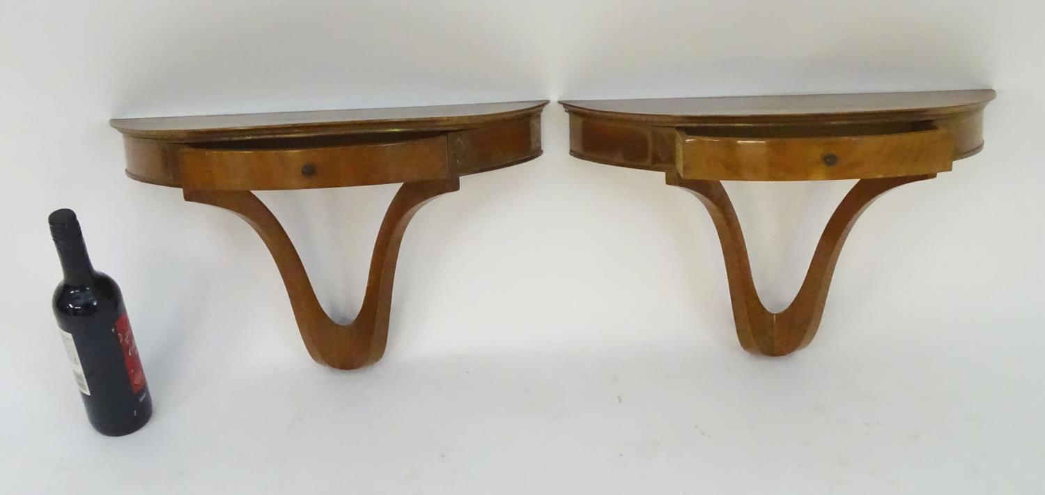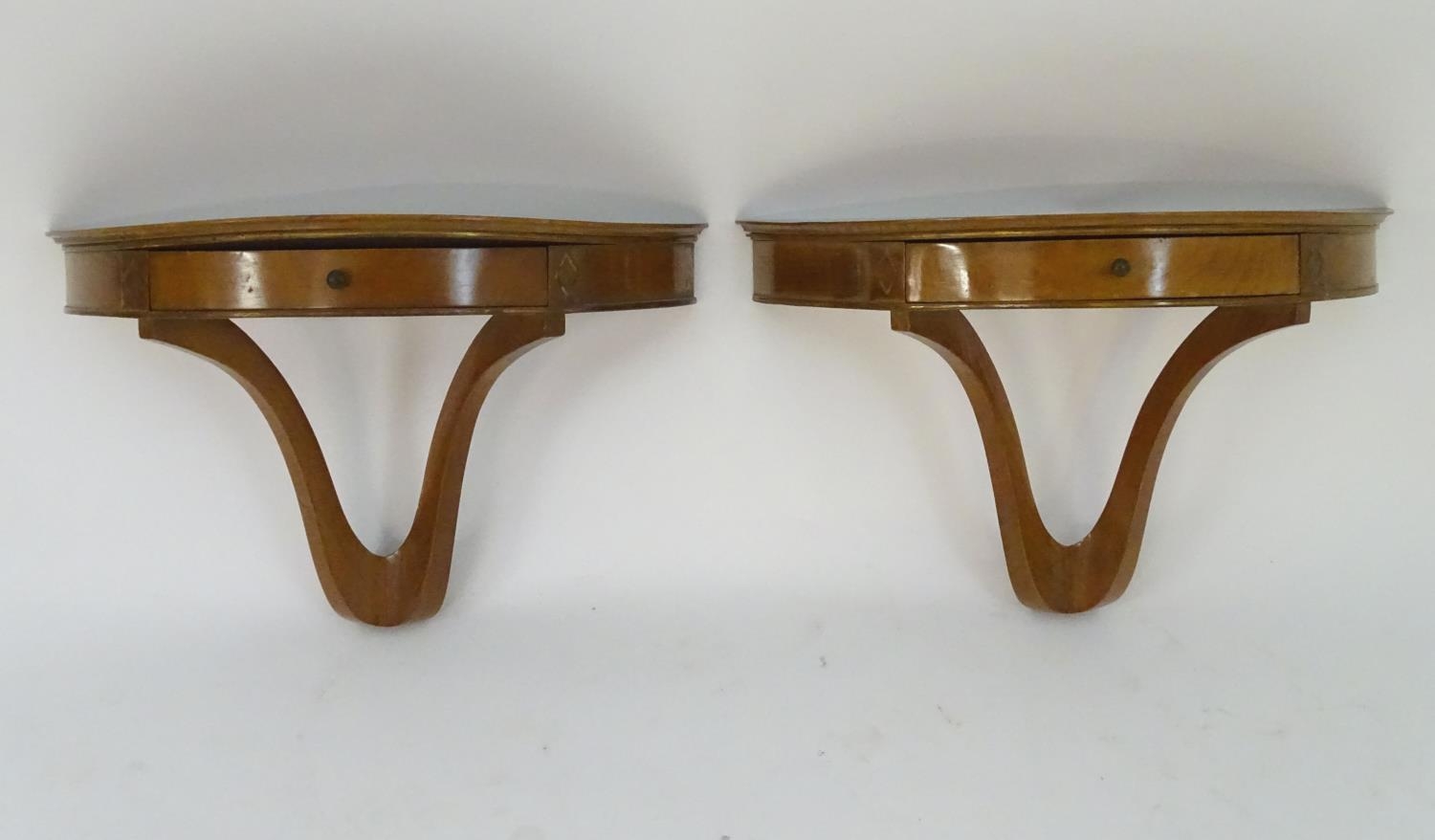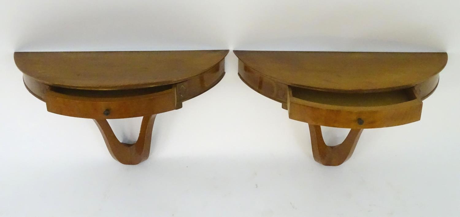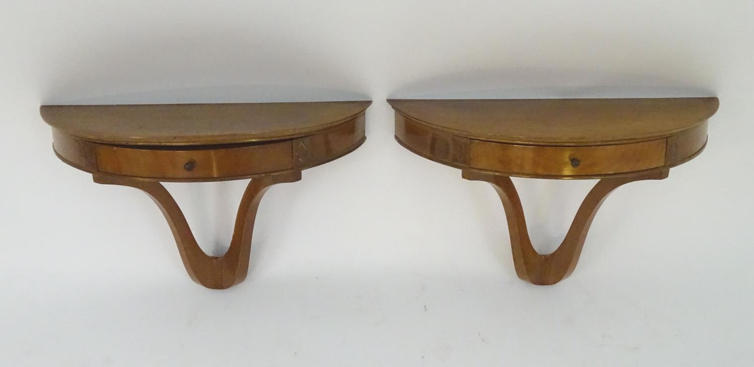 A pair of French demi lune console table with reeded edges and a single short drawer each. 20 1/2" wide x 8 1/2" deep x 12 1/2" high.