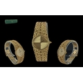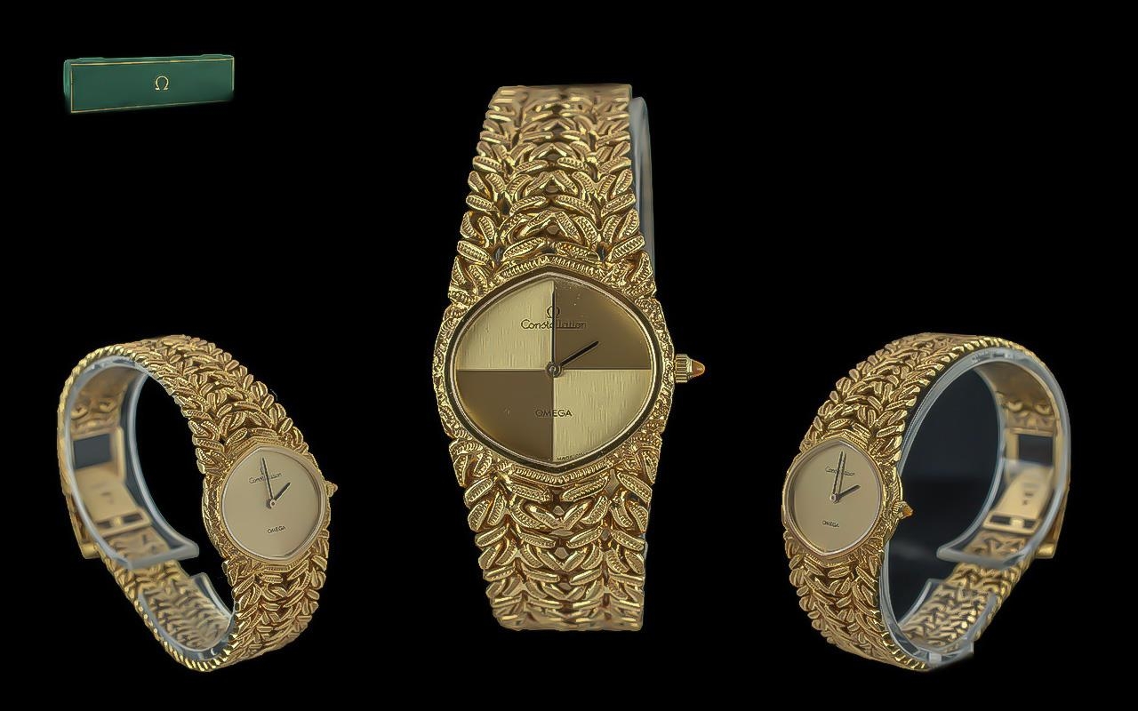 Omega Constellation Ladies 18ct Gold Deluxe Version Manual Wind Integral Bracelet Watch, circa 1979, marked 750 - 18ct to case and bracelet, ref.no. MD106210, features champagne dial and excellent openwork bracelet, original Omega box, booklet and Receipt of Purchase dated 15 Jan 1979; length 7.25 inches (18.2cms), gold weight 62g