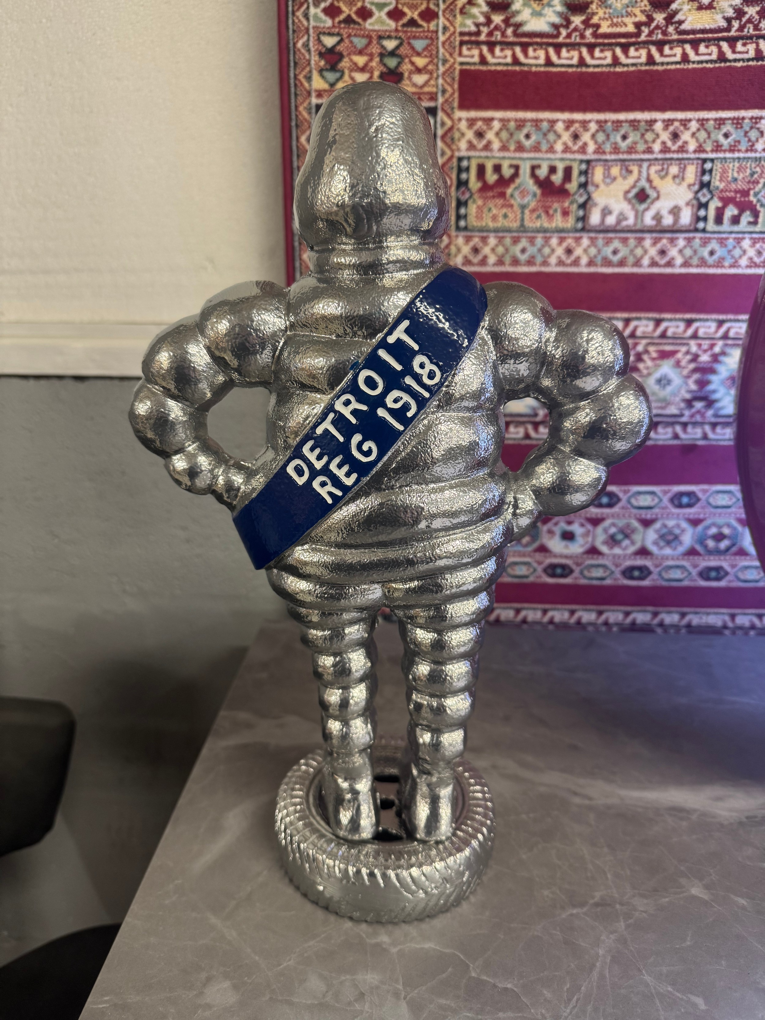 A silver effect Michelin man ornament